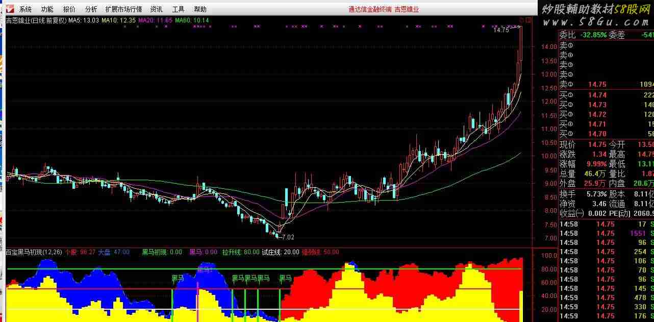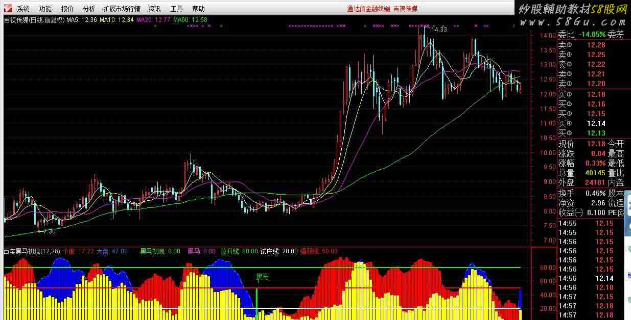 在这里我只想告诉大家,最有效的指标就是系统指标。所有的个人作品都离不开系统指标。不要过分迷信指标,各位朋友再好的指标只是起到辅助参考作用,没有谁的指标百分之百准确,所谓指标就是价格和成交量、如果谁说自己的指标多么多么牛,然后卖给你,还不提前公布实盘操作信息,那么你要小心了,真东西是不轻易外传的,并且不会频繁制造出来的。当大家都了解的东西就不是有用的东西了。主力大资金不是傻子。散户只能跟风,什么是涨停板?是大资金买盘的结果,但这个结果是大资金在绝对安全的时候才出手的,如果散户在同一时间蜂拥而入,主力还会拉升吗?在这里我祝各位朋友投资愉快,财源滚滚!旗开得胜!(顺便告诉大家我是第一次发主题帖,以前不会做,现在刚刚学着发帖,有不妥的地方望各位朋友见谅,) {黑马初现}{N 1 100 12}{N2 1 100 26}个股:EMA(100*(C-LLV(LOW,34))/(HHV(H,34)-LLV(LOW,34)),3),COLOR1010FF;大盘:EMA(100*(INDEXC-LLV(INDEXL,34))/(HHV(INDEXH,34)-LLV(INDEXL,34)),3),COLORE67010,LINETHICK2;STICKLINE(个股>=大盘,个股,大盘,3,0),COLORRED;STICKLINE(个股<大盘,个股,大盘,3,0),COLORBLUE;STICKLINE(个股>=大盘,0,大盘,3,0),COLORYELLOW;STICKLINE(个股<大盘,0,个股,3,0),COLORYELLOW;黑马初现:IF(CROSS(个股,9),50,0),STICK,LINETHICK3,COLOR00FF00;DRAWTEXT(CROSS(个股,9),66,'黑马'),COLOR00FF00;DRAWTEXT(CROSS(个股,9),60,'1'),COLOR00FF00;VAR1:=EMA(CLOSE,3);VAR2:=EMA(CLOSE,21);VAR3:=BARSLAST(CROSS(VAR2,VAR1))>15;VAR4:=VOL>MA(VOL,5)*2 AND VOL<MA(VOL,5)*5;VAR5:=CROSS(VAR1,VAR2) AND VAR4 AND VAR3;黑马:IF(VAR5,60,0),STICK,LINETHICK3,COLORF00FF0;DRAWTEXT(VAR5,78,'黑马!'),COLORF00FF0;拉升线:80,COLORGREEN,LINETHICK2;试庄线:20,COLORWHITE,LINETHICK2;强弱线:50,COLORRED,LINETHICK2;  |