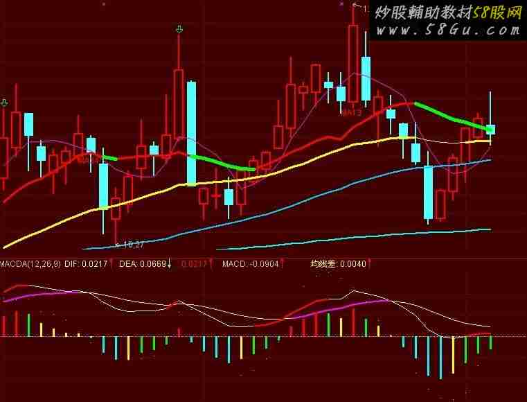 short:=12;long:=26;mid:=9;DIF:EMA(CLOSE,SHORT)-EMA(CLOSE,LONG);DEA:EMA(DIF,MID);IF(DIF>REF(DIF,1),DIF,DRAWNULL),COLORRED,LINETHICK2;IF(DEA>REF(DEA,1),DEA,DRAWNULL),COLORMAGENTA,LINETHICK2;MACD:(DIF-DEA)*2,COLORSTICK;STICKLINE(MACD>0,MACD,0,0.01,0),COLORRED,,LINETHICK2;STICKLINE(MACD<0,MACD,0,0.01,0),COLORCYAN;STICKLINE(MACD>REF(MACD,1) AND REF(MACD,1)<REF(MACD,2) AND MACD<0,MACD,0,0.01,0),COLORYELLOW;STICKLINE(MACD<REF(MACD,1) AND REF(MACD,1)>REF(MACD,2) AND MACD>0,MACD,0,0.01,0),COLORGREEN;STICKLINE(MACD>REF(MACD,1) AND REF(MACD,1)>REF(MACD,2) AND MACD<0,MACD,0,0.01,0),COLORGREEN;STICKLINE(MACD<REF(MACD,1) AND REF(MACD,1)<REF(MACD,2) AND MACD>0,MACD,0,0.01,0),COLORYELLOW; |