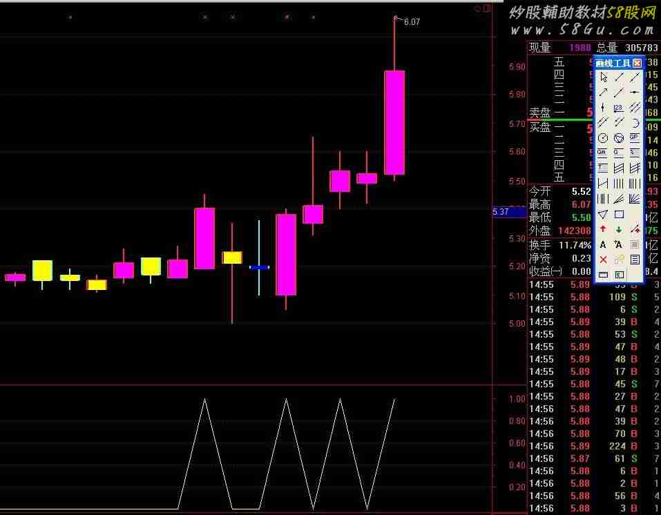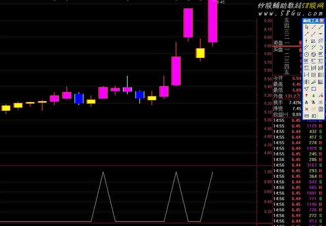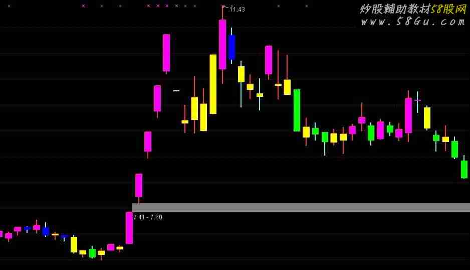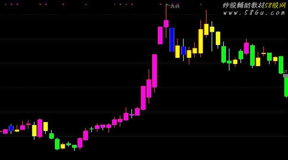 裸K图形才是最真实的市场反映。配合量能指标,你会经常发现牛股。图形一目了然,可以叠加任何主图,用法简单实用就不多说了。VAR1:=REF(MA(C,20),10);开:=O-VAR1;高:=H-VAR1;低:=L-VAR1;收:=C-VAR1;MID:=MA(C,20);UPPER:=MID+2*STD(C,20);LOWER:=MID-2*STD(C,20);V1:=(C-LOWER)/(UPPER-LOWER)*100;V2:=V1-EMA(V1,5);K1:=SUM(LLV(V2,4),4)/4;V3:=EMA(V2,64)*10;V4:=EMA(0.4*V2*(-1),3);V5:=-1*EMA(V2,39)*10;A:=V3>10;B:=V2>V4;D:=V5>10;E:=V3<=10 OR V2<=V4 OR V5<=10;STICKLINE(收>=开 AND E,C,O,2.5,0) ,COLORYELLOW;STICKLINE(收< 开 AND E,C,O,2.5,0) ,COLORYELLOW;STICKLINE(开> 收 AND A,C,O,2.5,0),COLORFF0000;STICKLINE(开<=收 AND A,C,O,2.5,0),COLORYELLOW;STICKLINE(开> 收 AND B,C,O,2.5,0),COLORFF00FF;STICKLINE(开<=收 AND B,C,O,2.5,0),COLORFF00FF;STICKLINE(开> 收 AND D,C,O,2.5,0),COLORGREEN;    |