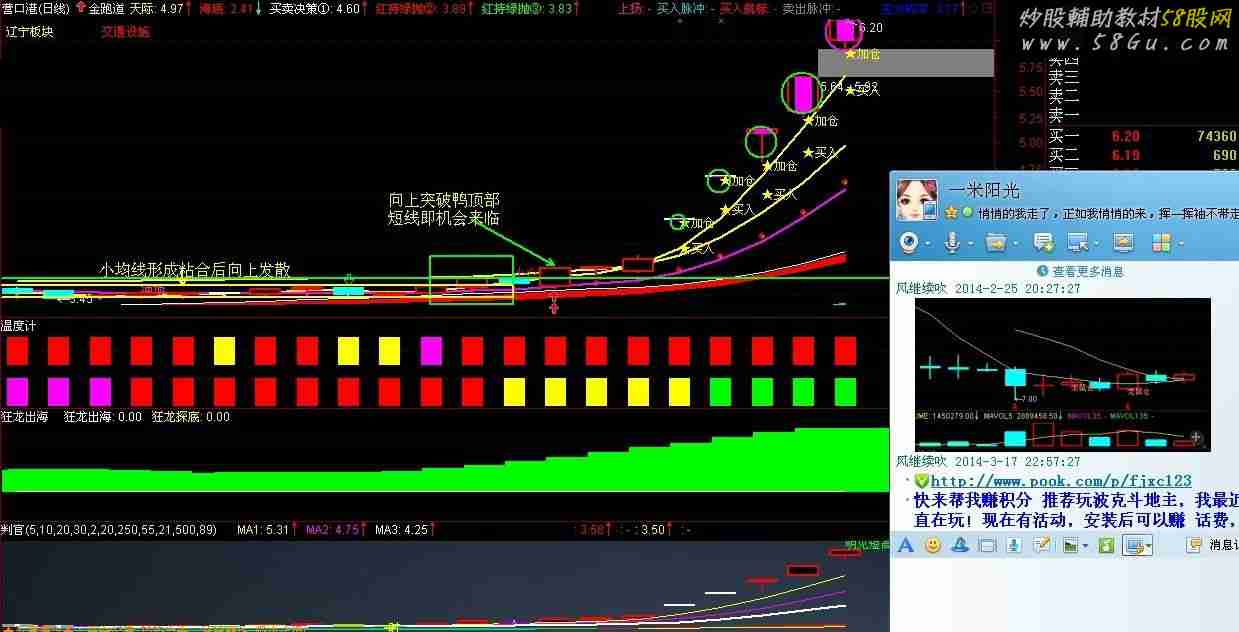 有朋友要求分享一下昨日主图指标,今日上传,这个不是原创,个人做了整合,喜欢的朋友下载研究。个人感觉一般金跑道天际: (MA(CLOSE,40)) + 2*STD(CLOSE,40),LINETHICK2,COLORYELLOW;海底: (MA(CLOSE,40)) - 2*STD(CLOSE,40),LINETHICK2,COLORRED;买卖决策①:EXPMA(CLOSE,12),CIRCLEDOT,COLORWHITE;红持绿抛②:MA(CLOSE,25),COLORRED;红持绿抛③:MA(CLOSE,30),COLORGREEN;DRAWBAND(红持绿抛②,RGB(255,0,0),红持绿抛③,RGB(0,255,0));NOTEXT1:IF(CLOSE>买卖决策① AND CLOSE!=买卖决策①,买卖决策①,DRAWNULL),CIRCLEDOT,COLORRED;NOTEXT2:IF(CLOSE<买卖决策① AND CLOSE!=买卖决策①,买卖决策①,DRAWNULL),CIRCLEDOT,COLORGREEN;STICKLINE(REF(COUNT(C<MA(REF(HHV((C+L+O+H)/4,40),1),3),5)=5,1) AND C>MA(REF(HHV((C+L+O+H)/4,40),1),3) AND C>O,C,O,1.3,0),COLORYELLOW;TYX2:=MA(REF(HHV((C+L+O+H)/4,10),1),3);STICKLINE(REF(COUNT(C<TYX2,5)=5,1) AND C>TYX2 AND C>O,C,O,1.3,0),COLORBLUE;DRAWTEXT(HIGH>REF(HIGH,1) AND REF(HIGH,2)>REF(HIGH,1) AND LOW>REF(LOW,1) AND REF(LOW,2)>REF(LOW,1) AND MA(CLOSE,5)<MA(CLOSE,10),L-0.4,'■底方买进'),COLORMAGENTA;主力:=EMA(((2*C+H+L)/4-LLV(L,34))/(HHV(H,34)-LLV(L,34))*100,13){*VAR2},COLORRED;散户:=EMA(0.667*REF(主力,1)+0.333*主力,2),COLORFF9933;上扬:IF(CROSS(主力,30) AND 散户<主力,L,DRAWNULL),POINTDOT,LINETHICK7,COLORLIMAGENTA;{35,STICK,LINETHICK2,COLOR000000;强弱分界线:=50, POINTDOT, LINETHICK2, COLORFFFF00;}买入脉冲:IF(CROSS(主力,散户) AND 主力<35,L*0.99,DRAWNULL),POINTDOT,LINETHICK7,COLORLIBLUE;VAR1:=(CLOSE-LLV(LOW,30))/(HHV(HIGH,30)-LLV(LOW,30))*100;操盘线:=SMA(VAR1,5,1),LINETHICK2,COLORRED;趋势线:=SMA(操盘线,3,1),LINETHICK2,COLORYELLOW;买入航标:IF(CROSS(操盘线,趋势线) AND 趋势线<25,L*0.98,DRAWNULL),POINTDOT,LINETHICK5,COLORRED;卖出脉冲:IF(CROSS(散户,主力) AND 散户>75,H*1.03,DRAWNULL),CROSSDOT,LINETHICK3,COLORGRAY;DRAWTEXT(CROSS(主力,散户) AND 主力<22,L,'起动'),COLORYELLOW;DRAWTEXT(CROSS(主力,30) AND 散户<主力,L,'上扬 '),COLOR00CCFF;DRAWTEXT(CROSS(主力,65) AND 散户<主力,H,'冲顶 '),COLOR9933FF;DRAWTEXT(CROSS(主力,75) AND 散户<主力,H,'小心被套'),COLORRED;DRAWTEXT(CROSS(散户,主力) AND 散户>75,H,'头部'), COLORYELLOW;DRAWTEXT(买入航标>0,L,'买入'),COLORRED;DRAWTEXT(CROSS(趋势线,操盘线)AND 操盘线>70,H*1.02,'卖出'),COLOR00FF00;A:=(3*C+L+O+H)/6;AX:=(20*A+19*REF(A,1)+18*REF(A,2)+17*REF(A,3)+16*REF(A,4)+15*REF(A,5)+14*REF(A,6)+13*REF(A,7)+12*REF(A,8)+11*REF(A,9)+10*REF(A,10)+9*REF(A,11)+8*REF(A,12)+7*REF(A,13)+6*REF(A,14)+5*REF(A,15)+4*REF(A,16)+3*REF(A,17)+2*REF(A,18)+REF(A,20))/210;S2:=SMA(C,3,1);S6:=SMA(C,5,1);DK:=2*(S2-S6);主力成本:EMA(AX,13),COLORFF00FF,LINETHICK0;短期底部:LLV(HIGH,30),LINETHICK2,COLORFFCC00;IF(MA(C,3),MA(C,3),DRAWNULL),COLORYELLOW,LINETHICK2;IF(MA(C,9),MA(C,9),DRAWNULL),COLORMAGENTA,LINETHICK2;IF(MA(C,23.5),MA(C,23.5),DRAWNULL),COLORWHITE;DRAWKLINE(HIGH,OPEN,LOW,CLOSE);STICKLINE(C/REF(C,1)>1.095,C,O,1.5,0)COLORMAGENTA;{洋红涨停};MA5:=MA(C,5);MA10:=MA(C,10);MA30:=MA(C,30);FA:=BARSLAST(CROSS(MA10,MA5)) AND CROSS(MA5,MA10);FB:=FA AND MA5>MA30 AND MA10>MA30 AND MA10>REF(MA10,1);DRAWTEXT(FB,L-0.58,'★追涨'),COLORRED;V1:=EMA(CLOSE,5);V2:=EMA(EMA(CLOSE,90)*1.01,10);DRAWTEXT(CROSS(V1,V2),V1+0.05,'牛起步'),COLOR00FF00;VARA1:=LLV(LOW,21);VARA2:=HHV(HIGH,21);AK1:=EMA((((CLOSE - VARA1) / (VARA2 - VARA1)) * 100),5);AK:=EMA((((CLOSE - VARA1) / (VARA2 - VARA1)) * 50),13);AB:=CROSS(AK1,AK);DRAWTEXT((AB = 1),(LOW * 0.99),'○关注'),COLORYELLOW;AA1:=AMOUNT/V;BB1:=L<AA1*0.9;CC1:=(C-REF(C,1))/REF(C,1)*100>1.2;DD1:=L<MA(C,5)*0.921;EE1:=V<MA(V,5)*1.5;介入:=BB1 AND CC1 AND DD1 AND EE1,LINETHICK0,COLOR0099FF;DRAWTEXT(介入,L*0.99,'介入'),COLOR0099FF;VAR3AA:=IF((CLOSE>REF(CLOSE,1)),88,0);VAR4AA:=IF(((CLOSE)/(REF(CLOSE,1))>1.05) AND ((HIGH)/(CLOSE)<1.01) AND (VAR3AA>0),91,0);DRAWTEXT(FILTER((VAR4AA>90),45),(LOW)*(0.93),'★买入 '),COLOR00FFFF;DRAWTEXT(FILTER((VAR4AA>90),35),(LOW)*(0.99000001),'★加仓'),COLOR00FFFF;DRAWTEXT_FIX(C>0,0.004,0.015,0,DYBLOCK),COLORYELLOW,LINETHICK2;DRAWTEXT_FIX(C>0,0.1,0.015,0,HYBLOCK),COLORRED,LINETHICK2;DRAWTEXT_FIX(C>0,0.2,0.015,0,EXTERNSTR(0,1)),COLORWHITE,LINETHICK2;DRAWTEXT_FIX(C>0,0.1,0.05,0,EXTERNSTR(0,3)),COLORWHITE,LINETHICK2;LTP:=FINANCE(7)<260000000 AND FINANCE(1)<500000000; {流通盘股小于1亿股,总盘小于2亿}MGSY:=FINANCE(33)>=0.08 AND BARSCOUNT(C)>30;{每股收益大于0.48元,上市超过30小于240天}SYL:=C/FINANCE(33)<200 AND C/FINANCE(33)>5; {市盈率低于200}JZC:=FINANCE(34)>=2; {每股净资产}MGP:=FINANCE(32)>=0.6; {每股未分配利润}MGGJJ:=FINANCE(18)>=1; {每股公积金}MGC:=FINANCE(26)/FINANCE(1)>=0.08; {每股现金流量} |