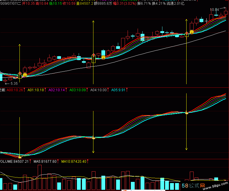 MA0:=MA(CLOSE,1); MA1:=MA(CLOSE,2); MA2:=MA(CLOSE,3); MA3:=MA(CLOSE,4); MA4:=MA(CLOSE,5); MA5:=MA(CLOSE,6); A00:SUM(MA0,5)/5,COLORRED,LINETHICK2; A01:SUM(MA1,5)/5; A02:SUM(MA2,5)/5; A03:SUM(MA3,5)/5; A04:SUM(MA4,5)/5; A05:SUM(MA5,5)/5,COLORCYAN,LINETHICK2; 买11:=CROSS(C,A05); DRAWICON(买11,A00,11); |