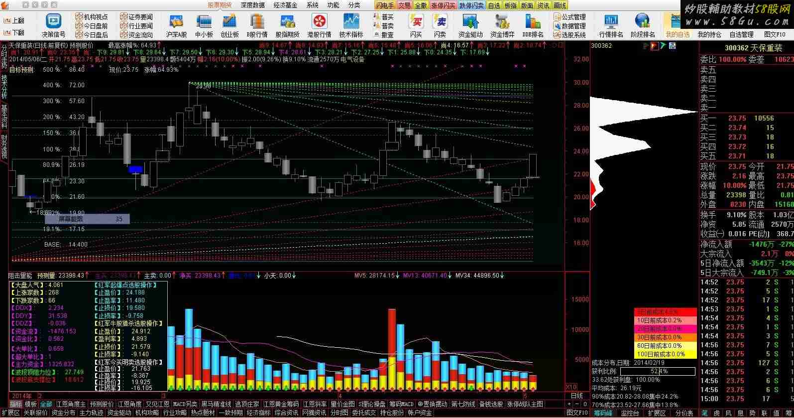 DRAWGBK(C>0, RGB(0,0,0),RGB(10,10,0),0,'0',0);{自用成交量}预测量:IF(CURRBARSCOUNT=1 AND PERIOD=5,VOL*240/FROMOPEN,DRAWNULL),NODRAW;STICKLINE(CURRBARSCOUNT=1 AND PERIOD=5,预测量,0,-1,-1),COLOR00C0C0;量:=VOL;V0001:=VOL/((HIGH-LOW)*2-ABS(CLOSE-OPEN));主买:IF(CLOSE>OPEN,V0001*(HIGH-LOW),IF(CLOSE<OPEN,V0001*((HIGH-OPEN)+(CLOSE-LOW)),VOL/2)),COLOR6D0076,NODRAW;主卖:IF(CLOSE>OPEN,0-V0001*((HIGH-CLOSE)+(OPEN-LOW)),IF(CLOSE<OPEN,0-V0001*(HIGH-LOW),0-VOL/2)),COLORFFD1BE,NODRAW;净买:主买+主卖,COLORMAGENTA,NODRAW;换手率:=VOL/CAPITAL*100;HS:=换手率;量比:IF(ISLASTBAR,DYNAINFO(17),VOL/REF(MA(VOL,5),1)),LINETHICK0,COLORYELLOW;A:=MA(换手率,2); X:=LLV(A,20),LINETHICK;X1:=(A-LLV(A,20))=0;换手最小:=IF(EVERY (A>0,5) AND FILTERX(X1,5),X1,0),COLORRED;小天:BARSLAST(换手最小),LINETHICK,COLOR008888;X2:=HHV(A,20);X3:=(A-X2)=0;换手最大:=IF(EVERY(REF(A,1)<X2,5) AND FILTERX(X3,5),1,0),COLORGREEN;STICKLINE(CLOSE<=REF(CLOSE,1) , VOL,0,3,0), COLOR808040;STICKLINE(CLOSE>REF(CLOSE,1), VOL,0,3,1),COLORFF87FF;STICKLINE(净买>0,0,主买,3,0),COLOR1020BB;STICKLINE(净买>0,0,主买,2,0),COLOR1020BB;STICKLINE(净买>0,0,主买,1,0),COLOR1020DD;STICKLINE(净买>0,0,主买,0,0),COLOR1020EE;STICKLINE(净买<=0,0,主买,3,0),COLOR1020BB;STICKLINE(净买<=0,0,主买,2,0),COLOR1020CC;STICKLINE(净买<=0,0,主买,1,0),COLOR1020DD;STICKLINE(净买<=0,0,主买,0,0),COLOR1020EE; STICKLINE(净买>0,V,主买,3,0),COLORFFAA22;STICKLINE(净买>0,V,主买,2,0),COLORFFBB33; STICKLINE(净买>0,V,主买,1,0),COLORFFDD44; STICKLINE(净买>0,V,主买,0,0),COLORFFFF55; STICKLINE(净买<=0,V,主买,3,0),COLORFFAA22;STICKLINE(净买<=0,V,主买,2,0),COLORFFBB33; STICKLINE(净买<=0,V,主买,1,0),COLORFFDD44; STICKLINE(净买<=0,V,主买,0,0),COLORFFFF55;STICKLINE(C,量比*15000,0,3,0),COLOR00AAAA;STICKLINE(C,量比*15000,0,2,0),COLOR00CCCC;STICKLINE(C,量比*15000,0,1,0),COLOR00EEEE;STICKLINE(C,量比*15000,0,0,0),COLOR00FFFF;{线形}H13:=HHV(MA(VOL,13),13),COLORGREEN;L13:=LLV(MA(VOL,5),13),COLORBROWN,LINETHICK2;MV5:MA(VOL,5),COLOR8888FF;MV13:MA(VOL,13),COLORMAGENTA;MV34:MA(VOL,34),COLORWHITE;{信号和文字提示}DRAWICON(MA(SUM(主买,34),10)>REF(MA(SUM(主买,34),10),1),-300,2);DRAWICON(MA(SUM(主买,34),10)<=REF(MA(SUM(主买,34),10),1),-300,1);{}DRAWRECTREL(0,0,285,999.2,IF(120,RGB(0,10,10),0));{}上涨家数:=INDEXADV,COLOR0080FF,NODRAW;下跌家数:=INDEXDEC,COLORGREEN,NODRAW;今日人气:=上涨家数/下跌家数;波段高:=(XMA(XMA(H,60),60)-XMA(XMA(L,60),60))*2.3+XMA(XMA(H,60),60);波段低:=XMA(XMA(L,60),60)-(XMA(XMA(H,60),60)-XMA(XMA(L,60),60))*2.3;高:=(XMA(XMA(H,25),25)-XMA(XMA(L,25),25))*1+XMA(XMA(H,25),25);低:=XMA(XMA(L,25),25)-(XMA(XMA(H,25),25)-XMA(XMA(L,25),25))*1;大单动向:=(LARGEINTRDVOL-LARGEOUTTRDVOL)*10000/FINANCE(7);涨跌动因:=IF(TRADENUM>0,(TRADEOUTNUM-TRADEINNUM)*100/TRADENUM,0);大单差分:=IF(TRADENUM>0,(LARGETRDINNUM-LARGETRDOUTNUM)/TRADENUM*100,0);主力净流入:=(LARGEINTRDVOL-LARGEOUTTRDVOL)*AMO/V/10000;超B:=L2_AMO(0,2)/10000.0;大B:=L2_AMO(1,2)/10000.0;中B:=L2_AMO(2,2)/10000.0;小B:=L2_AMO(3,2)/10000.0;超S:=L2_AMO(0,3)/10000.0;大S:=L2_AMO(1,3)/10000.0;中S:=L2_AMO(2,3)/10000.0;小S:=L2_AMO(3,3)/10000.0;资金流向:=(超B+大B+中B+小B)-(超S+大S+中S+小S);资金比:=(超B+大B+中B+小B)/(超S+大S+中S+小S);大单比:=(超B+大B+中B)/(超S+大S+中S);超大单比:=(超B+大B)/(超S+大S);TOTAL:=IF(PERIOD=1,5,IF(PERIOD=2,15,IF(PERIOD=3,30,IF(PERIOD=4,60,IF(PERIOD=5,240,1)))));MTIME:=MOD(FROMOPEN,TOTAL);CTIME:=IF(MTIME<0.5,TOTAL,MTIME);虚拟量:=IF(CURRBARSCOUNT=1,VOL*TOTAL/CTIME,DRAWNULL);虚拟量比:=虚拟量/REF(VOL,1),COLORWHITE,LINETHICK0;止盈价:=(XMA(XMA(H,25),25)-XMA(XMA(L,25),25))*1+XMA(XMA(H,25),25),COLORMAGENTA,LINETHICK1;获利率:=(止盈价-C)/C*100,COLORWHITE,LINETHICK0;止损价:=C-(高-低)/2,LINETHICK1,COLORWHITE;止损率:=(止损价-C)/C*100,COLORWHITE,LINETHICK0;EMAH3:=REF(EMA(H,3),1);EMAL3:=REF(EMA(L,3),1);止盈价1:=EMAH3+(EMAH3-EMAL3)/4;获利率2:=(止盈价1-C)/C*100;止损价1:=EMAL3-(EMAH3-EMAL3)/4;止损率2:=(止损价1-C)/C*100;PBXHH:=(EXPMA(H,2)+EMA(H,2*2)+EMA(H,2*4))/3,COLORGREEN,LINETHICK1;PBXLL:=(EXPMA(L,2)+EMA(L,2*2)+EMA(L,2*4))/3,COLORRED,LINETHICK1;PBX高:=REF(PBXHH,1),COLORGREEN,LINETHICK1;PBX低:=REF(PBXLL,1),COLORRED,LINETHICK1;PMX差:=PBX高-PBX低;起爆止盈价:=PBX高+PMX差*2,COLORWHITE,LINETHICK1;起爆获利率:=(起爆止盈价-PBX高)/PBX高*100;起爆止损价:=PBX低-PMX差*0.7,COLORWHITE;起爆止损率:=(起爆止损价-PBX高)/PBX高*100;DRAWTEXT_FIX(1,0,0,0,'【大盘人气】:'),COLORYELLOW;DRAWNUMBER_FIX(1,0.07,0,0,CONST(今日人气)),COLORYELLOW;DRAWTEXT_FIX(1,0,0.07,0,'【上涨家数】:'),COLORYELLOW;DRAWNUMBER_FIX(1,0.07,0.07,0,CONST(上涨家数)),COLORYELLOW;DRAWTEXT_FIX(1,0,0.14,0,'【下跌家数】:'),COLORYELLOW;DRAWNUMBER_FIX(1,0.07,0.14,0,CONST(下跌家数)),COLORYELLOW;{DRAWTEXT_FIX(1,0.1,0,0,'【量比】:'),COLORRED;DRAWNUMBER_FIX(1,0.145,0,0,CONST(虚拟量比)),COLORRED;}DRAWTEXT_FIX(1,0,0.21,0,'【DDX】:'),COLORMAGENTA;DRAWNUMBER_FIX(1,0.07,0.21,0,CONST(大单动向)),COLORMAGENTA;DRAWTEXT_FIX(1,0,0.28,0,'【DDY】:'),COLORMAGENTA;DRAWNUMBER_FIX(1,0.07,0.28,0,CONST(涨跌动因)),COLORMAGENTA;DRAWTEXT_FIX(1,0,0.35,0,'【DDZ】:'),COLORMAGENTA;DRAWNUMBER_FIX(1,0.07,0.35,0,CONST(大单差分)),COLORMAGENTA;DRAWTEXT_FIX(1,0,0.42,0,'【资金流】:'),COLORMAGENTA;DRAWNUMBER_FIX(1,0.07,0.42,0,CONST(资金流向)),COLORMAGENTA;DRAWTEXT_FIX(1,0,0.49,0,'【资金比】:'),COLORMAGENTA;DRAWNUMBER_FIX(1,0.07,0.49,0,CONST(资金比)),COLORMAGENTA;DRAWTEXT_FIX(1,0,0.58,0,'【大单比】:'),COLORMAGENTA;DRAWNUMBER_FIX(1,0.07,0.58,0,CONST(大单比)),COLORMAGENTA;DRAWTEXT_FIX(1,0,0.65,0,'【超大单比】:'),COLORMAGENTA;DRAWNUMBER_FIX(1,0.07,0.65,0,CONST(超大单比)),COLORMAGENTA;DRAWTEXT_FIX(1,0,0.72,0,'【主力资金】:'),COLORMAGENTA;DRAWNUMBER_FIX(1,0.07,0.72,0,CONST(主力净流入)),COLORMAGENTA;DRAWTEXT_FIX(1,0.15,0,0,'【红军起爆点选股操作】'),COLORCYA