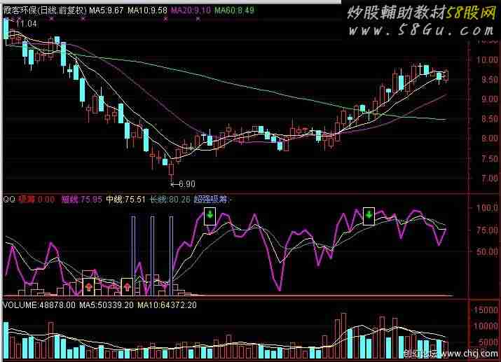 N:=9; M1:=3; M2:=3; P:=9; RSV:=(CLOSE-LLV(LOW,N))/(HHV(HIGH,N)-LLV(LOW,N))*100; K:=SMA(RSV,M1,1),COLORRED,LINETHICK2; D:=SMA(K,M2,1),COLOR00FF00; JJ:=P*(3*D-2*K),COLOR00FF00; J:=((3 * K) - (2 * D)); MAIRU:= CROSS(K,D) AND K<20; MAICHU:= CROSS(D,K) AND D>80; VAR2:=REF(LOW,1); VAR3:=SMA(ABS(LOW-VAR2),3,1)/SMA(MAX(LOW-VAR2,0),3,1)*100; VAR4:=EMA(IF(CLOSE*1.3,VAR3*10,VAR3/10),3); VAR5:=LLV(LOW,13); VAR6:=HHV(VAR4,13); VAR7:=IF(MA(CLOSE,34),1,0); VAR8:=EMA(IF(LOW<=VAR5,(VAR4+VAR6*2)/2,0),3)/618*VAR7; VAR9:=IF(VAR8>100,100,VAR8); 吸筹:VAR9,LINETHICK2,COLORRED; STICKLINE(VAR9>-120,0,VAR9,8,1),COLORLIRED; 短线:(CLOSE-LLV(LOW,N))/(HHV(HIGH,N)-LLV(LOW,N))*100,COLORMAGENTA,LINETHICK2; 中线:SMA(短线,M1,1),COLORYELLOW; 长线:SMA(中线,M2,1),COLORLIBLUE; 超强吸筹:IF(BARSLAST(CROSS(中线,长线))<P AND CROSS(中线,长线) AND 中线<20,90,DRAWNULL),STICK,COLORFF937F; STICKLINE(超强吸筹,0,90,1,1),COLORFF937F; BB:=IF(BARSLAST(CROSS(中线,短线))>=3 AND CROSS(短线,中线) AND 中线<30,20,0); STICKLINE(BB,0,20,7,1),COLORYELLOW; DRAWICON(BB>0,10,1); AA:=IF(BARSLAST(CROSS(短线,中线))>=4 AND CROSS(中线,短线) AND 短线>50,20,0); STICKLINE(AA,80,100,7,1),COLORWHITE; DRAWICON(AA>0,90,2); |