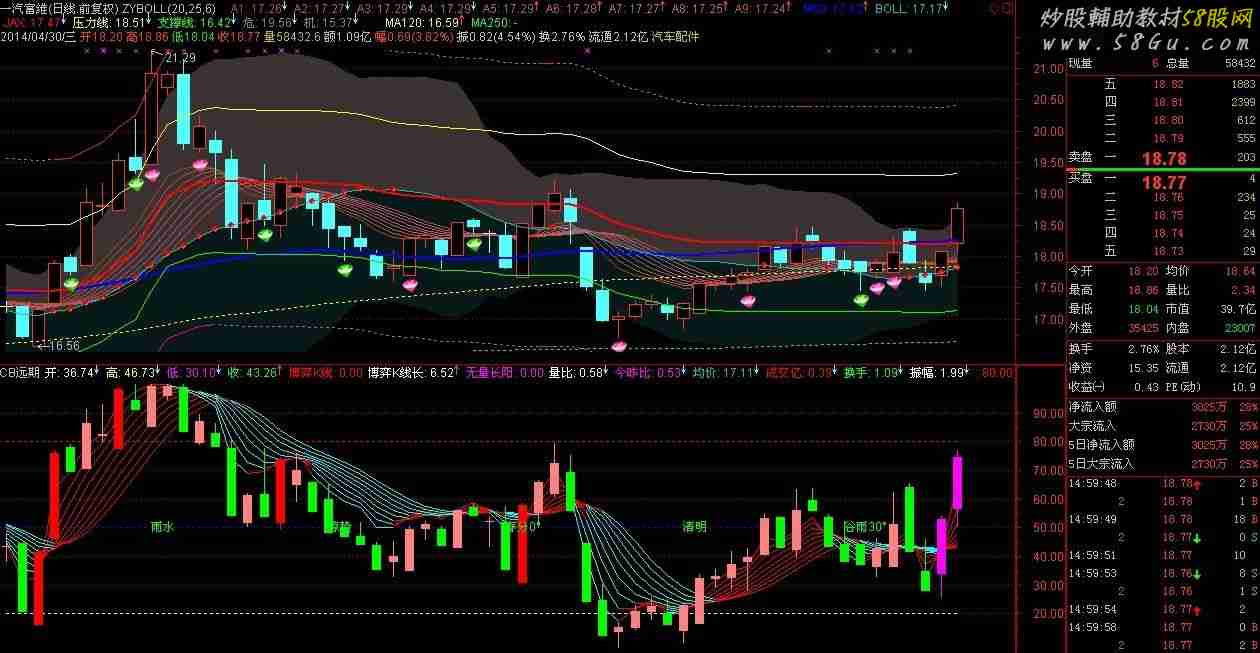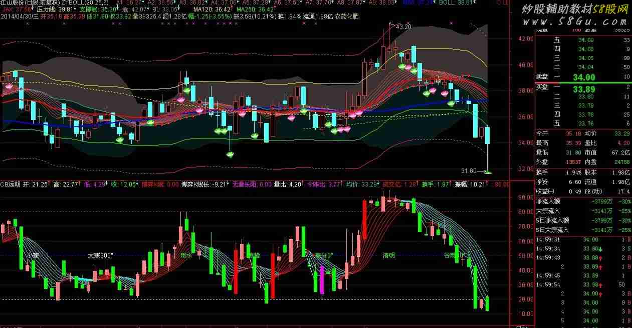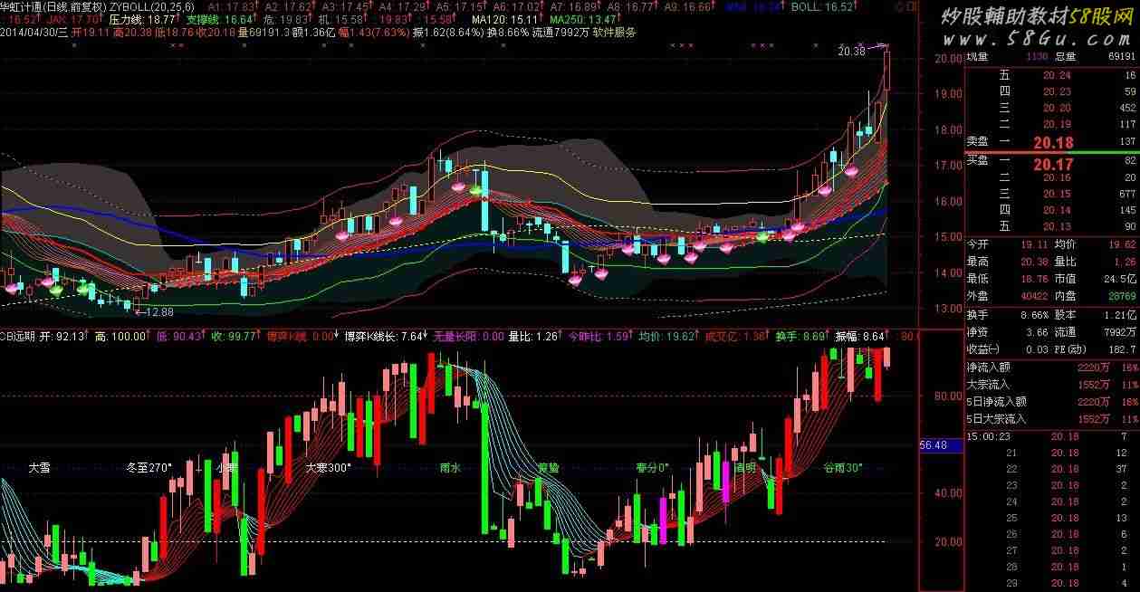 将原创远期成本分布带加入博弈K和24节气 做成一个副图 无未来函数,不喜者勿下 谢谢!{博弈K线}开:WINNER(O)*100,LINETHICK0,COLORWHITE;高:WINNER(H)*100,LINETHICK0,COLORBLUE;低:WINNER(L)*100,LINETHICK0,COLORCYAN;收:WINNER(C)*100,LINETHICK0,COLORGREEN;博弈K线:收-开>20,COLORRED,NODRAW;博弈K线长:收-开,COLORWHITE,NODRAW;无量长阳:收-开>16 AND V/CAPITAL<0.03,COLORMAGENTA,NODRAW;VAR111:=DYNAINFO(17)*REF(MA(VOL,5),1);VAR222:=DYNAINFO(7)=CLOSE AND DYNAINFO(10)=AMOUNT;量比:IF(VAR222,DYNAINFO(17),V/REF(MA(V,5),1)),COLORWHITE,NODRAW;今昨比:IF(VAR222,VAR111/REF(V,1),V/REF(V,1))COLORMAGENTA,NODRAW;均价:AMO/V/100,COLORLIBLUE,NODRAW;成交亿:IF(VAR222,1/FROMOPEN*240,1)*AMO/100000000,COLORRED,NODRAW;换手:IF(VAR222,VAR111,V)/CAPITAL*100,COLORGREEN,NODRAW;振幅:(H-L)/REF(C,1)*100,NODRAW;080,COLORRED,DOTLINE;050,COLORBLUE,DOTLINE;020,COLORWHITE,DOTLINE;VAR1:=(4*CLOSE+HIGH+LOW+2*OPEN)/8;P1:100*(PWINNER(1,VAR1)+PWINNER(2,VAR1)+PWINNER(3,VAR1)+PWINNER(5,VAR1)+PWINNER(8,VAR1)+PWINNER(13,VAR1)+PWINNER(21,VAR1)+PWINNER(34,VAR1))/8,COLORRED;P2:EMA(P1,2),COLORRED;P3:EMA(P2,2),COLORRED;P4:EMA(P3,2),COLORRED;P5:EMA(P4,2),COLORRED;P6:EMA(P5,2),COLORRED;P7:EMA(P6,2),COLORRED;P8:EMA(P7,2),COLORRED;P9:EMA(P8,2),COLORRED;IF(P1<REF(P1,1),P1,DRAWNULL)COLORCYAN;IF(P2<REF(P2,1),P2,DRAWNULL)COLORCYAN;IF(P3<REF(P3,1),P3,DRAWNULL)COLORCYAN;IF(P4<REF(P4,1),P4,DRAWNULL)COLORCYAN;IF(P5<REF(P5,1),P5,DRAWNULL)COLORCYAN;IF(P6<REF(P6,1),P6,DRAWNULL)COLORCYAN;IF(P7<REF(P7,1),P7,DRAWNULL)COLORCYAN;IF(P8<REF(P8,1),P8,DRAWNULL)COLORCYAN;IF(P9<REF(P9,1),P9,DRAWNULL)COLORCYAN;STICKLINE(收>=开,开,收,2,0),COLORLIRED;STICKLINE(收>=开,低,高,0,0),COLORLIRED;STICKLINE(收<开,开,收,2,0),COLORGREEN;STICKLINE(收<开,收,高,0,0),COLORGREEN;STICKLINE(无量长阳,开,收,2,0),COLORMAGENTA;STICKLINE(无量长阳,低,高,0,0),COLORMAGENTA;STICKLINE(博弈K线,开,收,2,0),COLORRED;STICKLINE(博弈K线,低,高,0,0),COLORRED;立春:=FILTER(MONTH=2 AND (DAY=3 OR DAY=5 ),2);雨水:=FILTER(MONTH=2 AND (DAY=18 OR DAY=20),2);惊蛰:=FILTER(MONTH=3 AND (DAY=5 OR DAY=7 ),2);春分:=FILTER(MONTH=3 AND (DAY=20 OR DAY=22),2);清明:=FILTER(MONTH=4 AND (DAY=4 OR DAY=6 ),2);谷雨:=FILTER(MONTH=4 AND (DAY=19 OR DAY=21),2);立夏:=FILTER(MONTH=5 AND (DAY=6 OR DAY=8 ),2);小满:=FILTER(MONTH=5 AND (DAY=20 OR DAY=22),2);芒种:=FILTER(MONTH=6 AND (DAY=5 OR DAY=7 ),2);夏至:=FILTER(MONTH=6 AND (DAY=20 OR DAY=22),2);小暑:=FILTER(MONTH=7 AND (DAY=6 OR DAY=8 ),2);大署:=FILTER(MONTH=7 AND (DAY=22 OR DAY=24),2);立秋:=FILTER(MONTH=8 AND (DAY=7 OR DAY=9 ),2);处暑:=FILTER(MONTH=8 AND (DAY=22 OR DAY=24),2);白露:=FILTER(MONTH=9 AND (DAY=7 OR DAY=9 ),2);秋分:=FILTER(MONTH=9 AND (DAY=22 OR DAY=24),2);寒露:=FILTER(MONTH=10 AND (DAY=7 OR DAY=9 ),2);霜降:=FILTER(MONTH=10 AND (DAY=22 OR DAY=24),2);立冬:=FILTER(MONTH=11 AND (DAY=7 OR DAY=9 ),2);小雪:=FILTER(MONTH=11 AND (DAY=22 OR DAY=24),2);大雪:=FILTER(MONTH=12 AND (DAY=6 OR DAY=8 ),2);冬至:=FILTER(MONTH=12 AND (DAY=21 OR DAY=23),2);小寒:=FILTER(MONTH=1 AND (DAY=5 OR DAY=7 ),2);大寒:=FILTER(MONTH=1 AND (DAY=19 OR DAY=21),2);DRAWTEXT(立春,50,'立春315°'),COLORGREEN;DRAWTEXT(雨水,050,'雨水'),COLORGREEN;DRAWTEXT(惊蛰,050,'惊蛰'),COLORGREEN;DRAWTEXT(春分,50,'春分0°'),COLORGREEN;DRAWTEXT(清明,050,'清明'),COLORGREEN;DRAWTEXT(谷雨,50,'谷雨30°'),COLORGREEN;DRAWTEXT(立夏,50,'立夏45°'),COLORMAGENTA;DRAWTEXT(小满,50,'小满60°'),COLORMAGENTA;DRAWTEXT(芒种,50,'芒种'),COLORMAGENTA;DRAWTEXT(夏至,50,'夏至90°'),COLORMAGENTA;DRAWTEXT(小暑,50,'小暑'),COLORMAGENTA;DRAWTEXT(大署,50,'大署120°'),COLORMAGENTA;DRAWTEXT(立秋,050,'立秋135°'),COLORYELLOW;DRAWTEXT(处暑,050,'处暑'),COLORYELLOW;DRAWTEXT(白露,050,'白露'),COLORYELLOW;DRAWTEXT(秋分,050,'秋分180°'),COLORYELLOW;DRAWTEXT(寒露,050,'寒露'),COLORYELLOW;DRAWTEXT(霜降,050,'霜降'),COLORYELLOW;DRAWTEXT(立冬,050,'立冬225°'),COLORWHITE;DRAWTEXT(小雪,050,'小雪240°'),COLORWHITE;DRAWTEXT(大雪,050,'大雪'),COLORWHITE;DRAWTEXT(冬至,050,'冬至270°'),COLORWHITE;DRAWTEXT(小寒,050,'小寒'),COLORWHITE;DRAWTEXT(大寒,050,'大寒300°'),COLORWHITE;   |