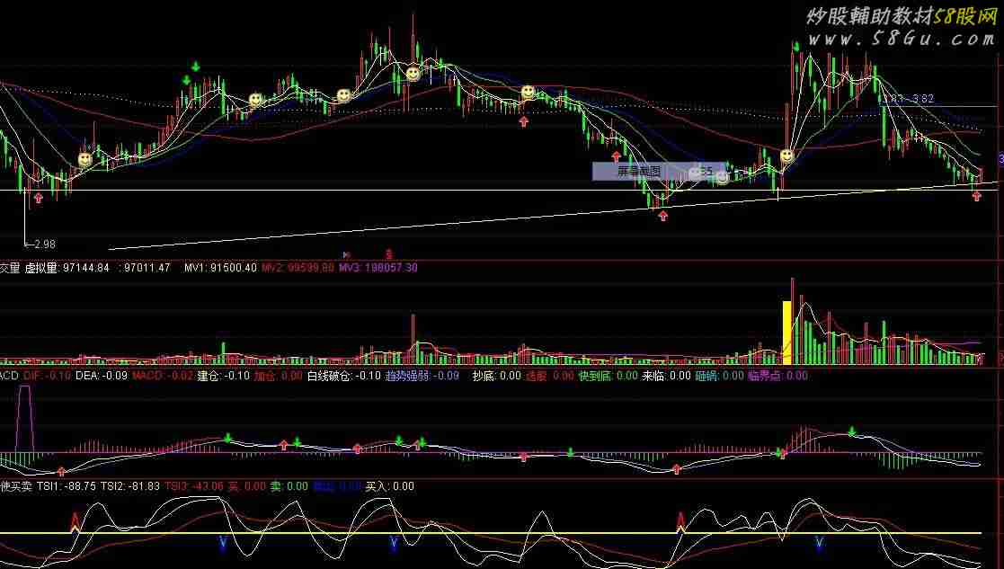 好指标不断------天使买卖MTM:=CLOSE-REF(CLOSE,5); TSI1:EMA(EMA(MTM,5),5)/EMA(EMA(ABS(MTM),5),5)*100; TSI2:EMA(EMA(MTM,10),10)/EMA(EMA(ABS(MTM),10),10)*100; TSI3:EMA(EMA(MTM,20),20)/EMA(EMA(ABS(MTM),20),20)*100; 买:IF(TSI3<-45 AND CROSS(TSI2,TSI3),55,00),LINETHICK2,COLORRED; 卖:IF(TSI1>50 AND CROSS(TSI2,TSI1),-35,00),LINETHICK2,COLORGREEN; 卖出:IF(CROSS(TSI2,TSI1)AND TSI1>50 ,-50,0),LINETHICK2,COLORFF0000; 买入:IF(CROSS(TSI2,TSI3)AND TSI3<-45 ,20,0),LINETHICK2,COLOR00FFFF;