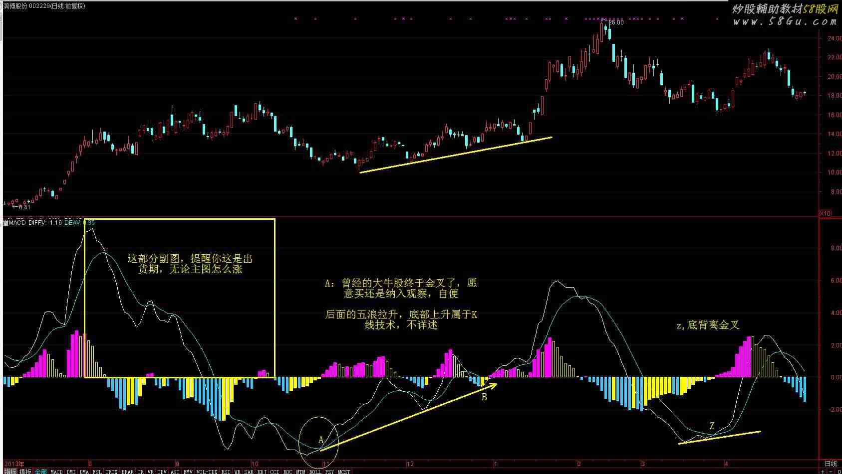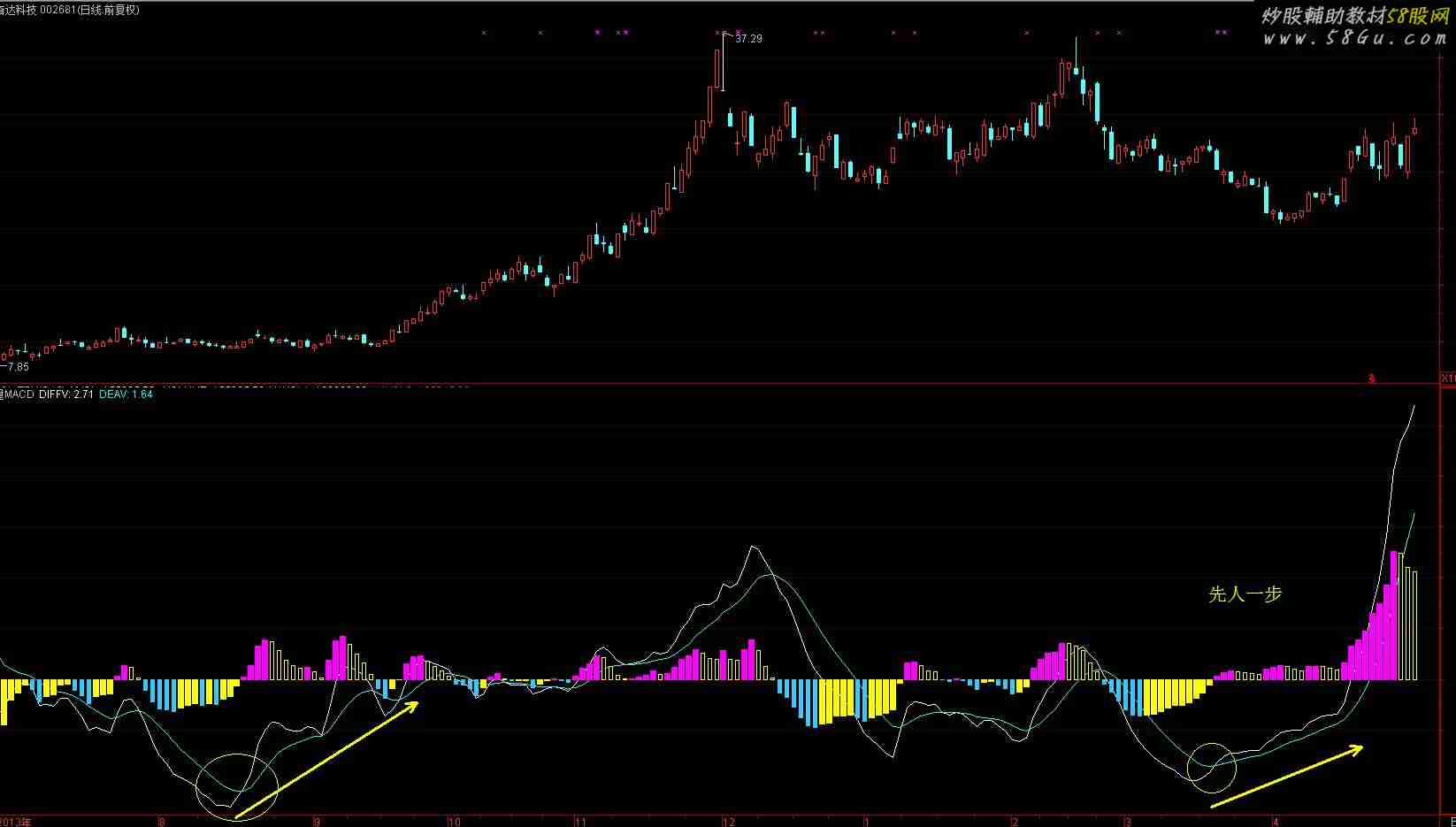 {这是一个成交量转换为MACD格式的指标,原理和MACD相同,金叉是好的,底背金叉更好,底部不断拉升的金叉最强。曾经大牛股抄底是好用的}VVV:=V/10000;VV:=EMA(VVV,3);DIFFV : EMA(VV,12) - EMA(VV,26),COLORWHITE;DEAV : EMA(DIFFV,9),COLORCYAN;MACDV :=DIFFV-DEAV, COLORSTICK;STICKLINE(MACDV>=0 AND MACDV>REF(MACDV,1),0,MACDV,3,0),COLORMAGENTA;STICKLINE(MACDV>=0 AND MACDV<REF(MACDV,1),0,MACDV,2,1),COLORYELLOW;STICKLINE(MACDV<0,0,MACDV,2,0),COLORFFCC33;STICKLINE(MACDV<0 AND MACDV>REF(MACDV,1),0,MACDV,3,0),COLORYELLOW;  |