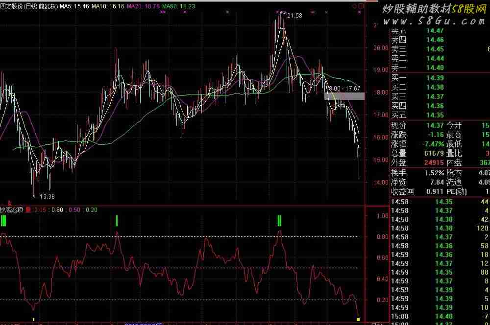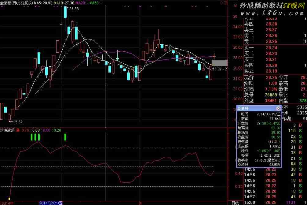 看到盆友们这么支持,干脆把自己珍藏多年的指标拿出来和盆友们分享。此指标无未来,信号不会漂移。特别适合喜欢波段操作和稳妥没有时间盯盘的盆友。喜欢激进的盆友以及不喜欢的盆友还请绕道。既然是傻瓜式操作,具体怎莫使用本人不再多言,还请盆友们自己参悟吧!希望大家多多支持,请看图N:=15;DMH:=SUM(IF(H>REF(H,1),H-REF(H,1),0),N);DML:=SUM(IF(L>REF(L,1),0,REF(L,1)-L),N);量:DMH/(DMH+DML),COLORRED;0.80,DOTLINE;0.5,DOTLINE;0.20,DOTLINE;XG:=量<0.1;STICKLINE(量>0.82,1,0.9,1,0),COLORGREEN;STICKLINE(量<0.1,0.02,0.00,1,0),COLORYELLOW;{用法:出现信号出货,信号消失,量线下穿0.8和股价形成背离必须清仓以规避调整的风险};   |