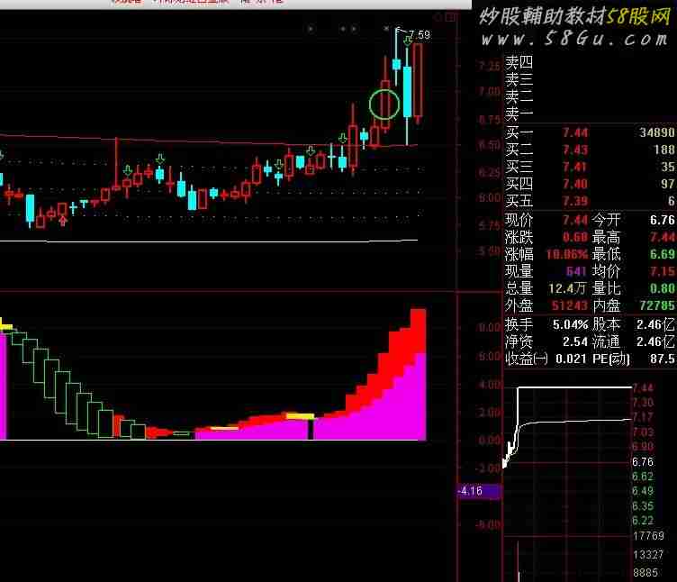 VAR2:=MA(CLOSE, 5); VAR3:=MA(CLOSE, 10); VAR4:=MA(CLOSE, 20); VAR5:=MA(CLOSE, 30); VAR6:=(VAR2+VAR3+VAR4+VAR5)/4; VAR7:=(VAR6-REF(VAR6, 15))/REF(VAR6, 15)*100; VAR8:=(VAR6-REF(VAR6, 15))/REF(VAR6, 15)*100; VAR9:=EMA(VAR7, 8); 反转:STICKLINE(VAR9>1*REF(VAR9, 1), VAR7, 0, 5, 0), COLOREE00EE; 持股:STICKLINE(VAR7>1*REF(VAR7, 1), VAR7, VAR9, 5, 0), COLORRED; 持币:STICKLINE(VAR7<1*REF(VAR7, 1), VAR7, VAR9, 5, 1), COLORGREEN; 洗盘:STICKLINE(VAR7<1*REF(VAR7, 1) AND VAR9>1*REF(VAR9, 1), VAR7, VAR9, 10, 0), COLOR00EEFF; VAR10:=(CLOSE-MA(CLOSE, 58))/MA(CLOSE, 58)*100; VAR11:=(VAR10>1*REF(VAR10, 1) AND VAR10<-26 AND VAR10>-40)*1.5; VAR12:=VOL/CAPITAL*100; VAR13:=LLVBARS(LOW, 50); VAR14:=SUM(VOL, VAR13); VAR15:=HHVBARS(HIGH, 50); VAR16:=SUM(VOL, VAR15); VAR17:=(CLOSE-REF(OPEN, VAR15))/REF(OPEN, VAR15)*100; VAR18:=VAR16/CAPITAL*100; VAR19:=(CLOSE-REF(OPEN, VAR13))/REF(OPEN, VAR13)*100; VAR20:=VAR14/CAPITAL*100; VAR21:=MA(CLOSE, 3); VAR22:=REF(CLOSE, 2)*0.865; VAR23:=REF(CLOSE, 13)*0.772; VAR24:=MIN(VAR22, VAR23); VAR25:=MA(CLOSE, 13); 抄底王:IF((CLOSE-VAR24)/CLOSE<0.030 AND VAR17<(-35) AND SUM(VAR12, 5)/5<1.800, 1, 0)*10, COLORWHITE; DRAWTEXT(抄底王, 抄底王, ' 成功率 90.22 %,共发出指示1289 次.底 追 '), COLORFFAA00; VAR26:=(CLOSE-REF(CLOSE, 1))/REF(CLOSE, 1)*100; VAR27:=(EMA(CLOSE, 12)-EMA(CLOSE, 26))*100; VAR28:=EMA(VAR27, 9); VAR29:=2*(VAR27-VAR28); DRAWTEXT(VAR27<(-50) AND VAR26>7 AND VAR27<VAR28, (-10), '底'), COLORWHITE; DRAWTEXT(VAR27<(-50) AND VAR26>7 AND VAR27>=VAR28, 5, '追'), COLORWHITE; STICKLINE(VAR27<(-50) AND VAR26>7, 0,(-10), 5, 0), COLORFFFF66;