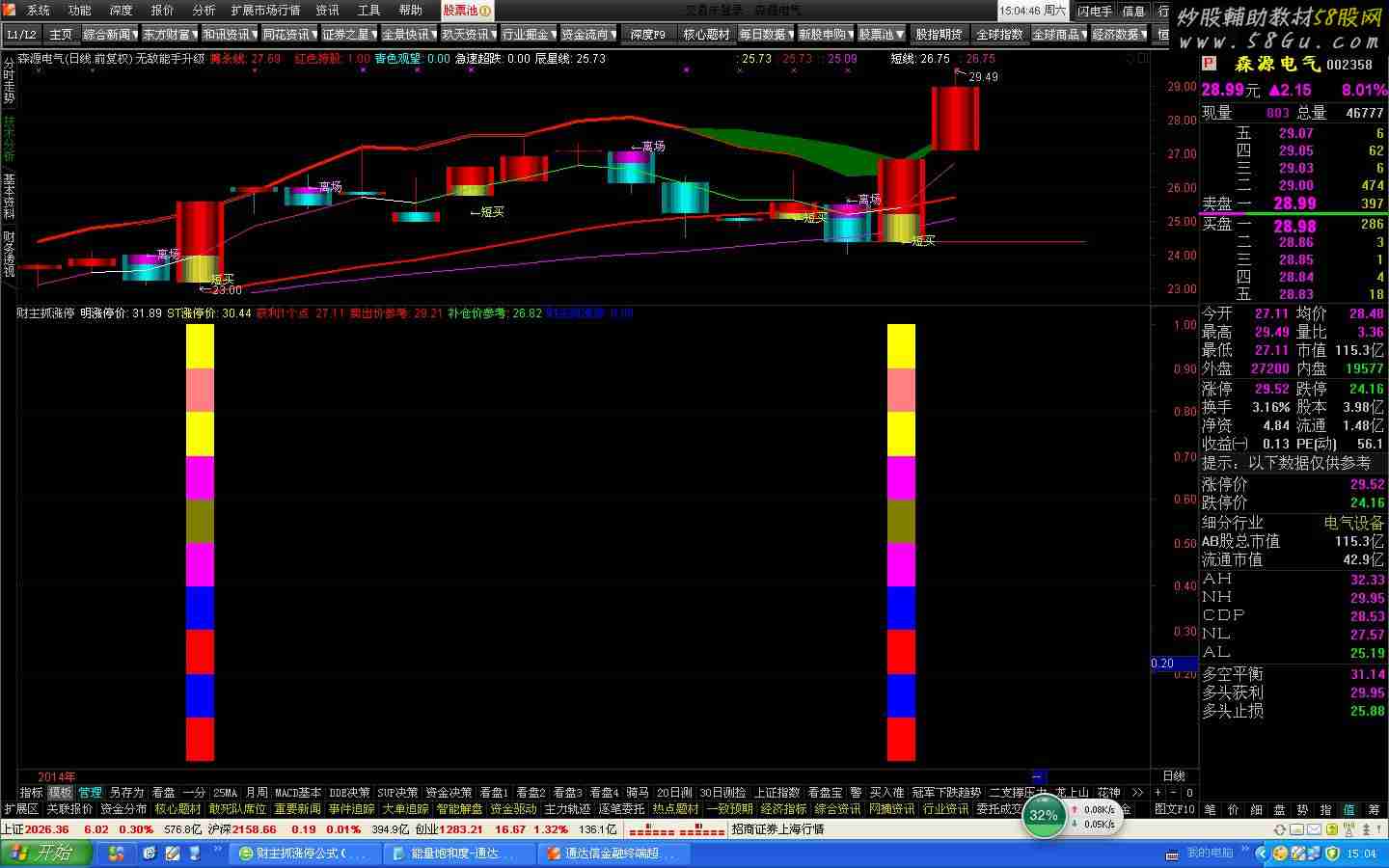 明涨停价:CLOSE * 1.1,NODRAW;ST涨停价:CLOSE * 1.05,NODRAW;获利1个点:REF(C,1)*1.01,COLORRED,NODRAW;RSV:=(((CLOSE - LLV(LOW,9)) / (HHV(HIGH,9) - LLV(LOW,9))) * 100);短期底部:=LLV(OPEN,30);AA10:=MA(CLOSE,10);AA12:=MA(CLOSE,12);BB10:=((ATAN((AA10 - REF(AA10,1))) * 3.1416) * 10);BB12:=((ATAN((AA12 - REF(AA12,1))) * 3.1416) * 10);MA13:=MA(CLOSE,13);VAR2:=(((CLOSE - MA(CLOSE,6)) / MA(CLOSE,6)) * 100);VAR3:=(((CLOSE - MA(CLOSE,12)) / MA(CLOSE,12)) * 100);VAR4:=(((CLOSE - MA(CLOSE,24)) / MA(CLOSE,24)) * 100);VAR5:=(((VAR2 + (2 * VAR3)) + (3 * VAR4)) / 6);VAR6:=MA(VAR5,3);VAR7:=DMA(EMA(CLOSE,12),((SUM(VOL,5) / 3) / CAPITAL));VAR8:=(((CLOSE - VAR7) / VAR7) * 100);VAR9:=((((REF(VAR8,1) < (0 - 40)) AND (VAR8 > REF(VAR8,1))) AND (REF(VAR8,1) < REF(VAR8,2))) AND ((VAR8 - REF(VAR8,1)) >2.5));VARA:=(((CLOSE - MA(CLOSE,6)) / MA(CLOSE,6)) * 100);VARB:=(((CLOSE - MA(CLOSE,12)) / MA(CLOSE,12)) * 100);VARC:=(((CLOSE - MA(CLOSE,24)) / MA(CLOSE,24)) * 100);VARD:=REF(CLOSE,1);VARE:=((SMA(MAX((CLOSE - VARD),0),5,1) / SMA(ABS((CLOSE - VARD)),5,1)) * 100);VARF:=(((HIGH + LOW) + CLOSE) / 3);VAR10:=((VARF - MA(VARF,14)) / (0.015 * AVEDEV(VARF,14)));VAR11:=(((((MA(AMOUNT,5) / MA(VOL,5)) / 100) - ((MA(AMOUNT,110) / MA(VOL,110)) / 100)) / ((MA(AMOUNT,5) / MA(VOL,5)) / 100))< (0 - 0.273));VAR12:=(((CLOSE - MA(CLOSE,30)) / MA(CLOSE,30)) < (0 - 0.125));VAR13:=(VAR11 AND VAR12);VAR14:=((((VARA >= (0 - 45)) AND (VARA <= (0 - 10))) AND (VARB <= (0 - 15))) AND (VARC <= (0 - 20)));VAR15:=(COUNT(VAR14,1) >= 1);VAR16:=(VAR13 AND VAR15);VAR17:=1;VAB0:=531;VAB1:=1510000;VAB2:=VAB0 + VAB1; VAB3:=IF(DATE > VAB2,0,1);VARA12:=SMA(H,10,9)*VAB3; VARA13:=SMA(L,10,9)*VAB3; VAR18:=(CLOSE * VOL);VAR19:=EMA((((((MA(VAR18,4) / MA(VOL,4)) + (MA(VAR18,6) / MA(VOL,6))) + (MA(VAR18,13) / MA(VOL,13))) + (MA(VAR18,24) / MA(VOL,24))) / 4),1);VAR1A:=(1 * VAR19);VAR1B:=(VAR19 * 0.92);VAR1C:=EMA(CLOSE,34);VAR1D:=MA((VAR1C * 1.12),5);VAR1E:=MA((VAR1C * 0.82),5);VAR1F:=(CLOSE < VAR1E);VAR20:=((((((MA(AMOUNT,5) * VAR17) / MA(VOL,5)) / 100) - ((MA(AMOUNT,125) / MA(VOL,125)) / 100)) / ((MA(AMOUNT,5) / MA(VOL,5)) / 100)) < ((0 - 0.4) * VAR17));VAR21:=HHV(HIGH,500);VAR22:=LLV(LOW,500);VAR23:=HHV(HIGH,250);VAR24:=LLV(LOW,250);VAR25:=HHV(HIGH,125);VAR26:=LLV(LOW,125);VAR27:=MA(((((((VAR21 * 0.45) + (VAR23 * 0.5)) + VAR22) + VAR24) + VAR26) / 5),35);VAR28:=MA((((VAR23 * 0.62) + VAR26) / 2),35);VAR29:=MA((((VAR23 * 0.75) + VAR26) / 2),18);VAR2A:=MA((((((VAR23 * 0.93) + (VAR27 * 2)) + (VAR28 * 1.8)) + (VAR29 * 1.5)) / 4),18);VAR2B:=MA(((((VAR21 * 0.95) + (VAR27 * 3)) + (VAR28 * 2)) / 3),35);VAR2C:=VAR27;VAR2D:=VAR28;VAR2E:=VAR29;VAR2F:=VAR2A;VAR30:=VAR2B;VAR31:=((CLOSE - REF(MA(CLOSE,20),11)) < (0 - 2));VAR32:=(INDEXA / 100000000);VAR33:=INDEXADV;VAR34:=INDEXDEC;VAR35:=((VAR18 / (VAR18 + VAR19)) * VAR17);VAR36:=((VAR19 / (VAR18 + VAR19)) * VAR17);VAR37:=EMA(VAR35,10);VAR38:=EMA(VAR36,10);VAR39:=EMA(VAR37,10);VAR3A:=EMA(VAR38,20);VAR3B:=EMA(VAR37,3);VAR3C:=EMA(VAR39,6);VAR3D:=EMA(VAR3A,2);VAR3E:=(VAR3C - VAR3D);VAR3F:=(((VAR3C - REF(VAR3C,1)) > 0) AND ((REF(VAR3C,1) - REF(VAR3C,2)) < 0));VAR40:=IF((CROSS(VAR3B,VAR3C) AND (VAR3C <= 20)),30,0);VAR41:=VAR40;VAR42:=(SMA(((AMOUNT / VOL) / 100),13,1) * 1.15);VAR43:=(SMA(((AMOUNT / VOL) / 100),13,1) * 0.85);VAR44:=(CLOSE - REF(MA(CLOSE,20),11));VAR45:=(((((((((((((CLOSE < VAR1E) AND VAR20) AND (CLOSE < VAR43)) OR (((CLOSE < VAR1E) AND VAR31) AND VAR20)) OR ((CLOSE <VAR1E) AND (CLOSE < VAR43))) OR (((CLOSE < VAR1E) AND VAR20) AND (CLOSE < VAR43))) OR (VAR20 AND (CLOSE < VAR2C))) OR ((VAR20AND VAR31) AND (VAR44 < (0 - 1.5)))) OR (VAR20 AND (CLOSE < VAR1E))) OR (VAR20 AND (VAR44 < (0 - 1.5)))) OR (VAR31 AND (CLOSE< VAR43))) OR ((CLOSE < VAR2C) AND (VAR44 < (0 - 1.5)))) OR ((CLOSE < VAR1E) AND VAR31));VAR46:=(((CLOSE - MA(CLOSE,6)) / MA(CLOSE,6)) * 100);VAR47:=(((CLOSE - MA(CLOSE,12)) / MA(CLOSE,12)) * 100);VAR48:=(((CLOSE - MA(CLOSE,24)) / MA(CLOSE,24)) * 100);VAR49:=REF(CLOSE,1);VAR4A:=((SMA(MAX((CLOSE - VAR49),0),5,1) / SMA(ABS((CLOSE - VAR49)),5,1)) * 100);VAR4B:=(((HIGH + LOW) + CLOSE) / 3);VAR4C:=((VAR4B - MA(VAR4B,14)) / (0.015 * AVEDEV(VAR4B,14)));VAR4D:=(((((MA(AMOUNT,5) / MA(VOL,5)) / 100) - ((MA(AMOUNT,110) / MA(VOL,110)) / 100)) / ((MA(AMOUNT,5) / MA(VOL,5)) / 100))< (0 - 0.273));VAR4E:=(((CLOSE - MA(CLOSE,30)) / MA(CLOSE,30)) < (0 - 0.125));VAR4F:=(VAR11 AND VAR12);VAR50:=((((VAR2 >= (0 - 45)) AND (VAR2 <= (0 - 7))) AND (VAR3 <= (0 - 11))) AND (VAR4 <= (0 - 14)));VAR51:=(COUNT(VAR50,1) >= 1);VAR52:=(VAR4F AND VAR51);VAR53:=(((((VAR20 AND (CLOSE < VAR1E)) AND VAR31) AND (CLOSE < VAR2C)) AND VAR45) AND VAR52);VAR54:=(((CLOSE - MA(CLOSE,6)) / MA(CLOSE,6)) * 100);VAR55:=(((CLOSE - MA(CLOSE,12)) / MA(CLOSE,12)) * 100);VAR56:=(((CLOSE - MA(CLOSE,24)) / MA(CLOSE,24)) * 100);VAR57:=REF(CLOSE,1);VAR58:=((SMA(MAX((CLOSE - VAR57),0),5,1) / SMA(ABS((CLOSE - VAR57)),5,1)) * 100);VAR59:=(((HIGH + LOW) + CLOSE) / 3);VAR5A:=((VAR59 - MA(VAR59,14)) / (0.015 * AVEDEV(VAR59,14)));VAR5B:=((((((VAR54 >= (0 - 15.8)) AND (VAR54 <= (0 - 12.2))) AND (VAR55 <= (0 - 20.8))) AND (VAR56 <= (0 - 27.5))) AND (VAR58<= 11.7)) AND (VAR5A <= (0 - 145)));VAR5C:=9.999999884842+026;VAR5D:=(COST(10) * 0)*VAB3;VAR5E:=((((MA(AMOUNT,5) / MA(VOL,5)) / 100) - ((MA(AMOUNT,125) / MA(VOL,125)) / 100)) / ((MA(AMOUNT,5) / MA(VOL,5)) / 100));VAR5F:=MA((((LLV(LOW,45) - CLOSE) / (HHV(HIGH,45) - LLV(LOW,45))) * 100),5);VAR60:=((CROSS((0 - 5),VAR5F) AND (VAR5E < (0 - 0.4))) AND (((CLOSE - MA(CLOSE,30)) / MA(CLOSE,30)) < (0 - 0.19)));VAR61:=MA(CLOSE,3);VAR62:=(REF(CLOSE,2) * 0.865);VAR63:=(REF(CLOSE,13) * 0.772);VAR64:=MIN(VAR62,VAR63);VAR65:=((100 * VOL) / CAPITAL);VAR66:=MA(CLOSE,13);VAR67:=IF(((((CLOSE - VAR64) / CLOSE) < 0.03) AND ((SUM(VAR65,5) / 5) < 1.8)),1,0);开始控盘:=STICKLINE((VAR6 <= (0 - 10)),0,(0 - 20),5,0)*VAB3,COLORBROWN;出击:=IF(((((VAR9 OR VAR16) OR VAR53) OR VAR5B) OR ((((CLOSE - VAR64) / CLOSE) < 0.03) AND ((SUM(VAR65,5) / 5) <1.8))),120,0),LINETHICK2,COLOR0000FF;VAR68:=0;VARQ:=MA(CLOSE,152);VARW:=MA(CLOSE,194.16);VAREE:=(VARW +