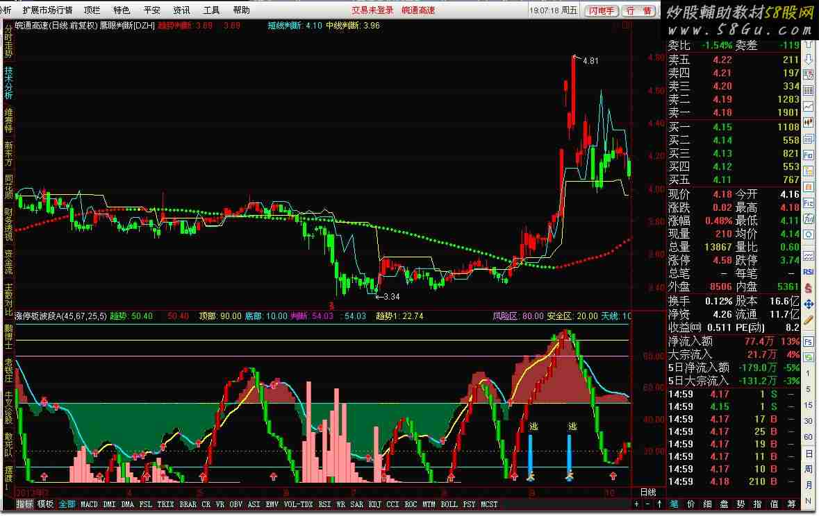 从上至下五根线,分别是天线、顶部、风险区、强弱线、底部。到达风险区开始减仓,到达顶部线坚决清仓。底部线是建仓良机,超跌时出现线色柱线。提示中线色向上箭头是建仓加码、绿色向下箭头是清仓