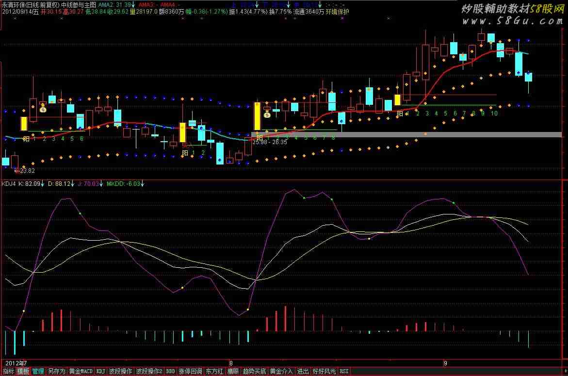 N1:=12;N2:=34;N3:=89; RSV1:=(C-LLV(L,N1))/(HHV(H,N1)-LLV(L,N1))*100; RSV2:=(C-LLV(L,N2))/(HHV(H,N2)-LLV(L,N2))*100; RSV3:=(C-LLV(L,N3))/(HHV(H,N3)-LLV(L,N3))*100; RSVH:=MAX(MAX(RSV1,RSV2),RSV3); K:EMA(EMA(EMA(RSVH,3),3),3); D:EMA(EMA(EMA(K,3),3),3); J:3*K-2*D; MKDD:K-D,NODRAW; STICKLINE(MKDD<=0,50,50+MKDD,0,0),COLORCYAN; STICKLINE(MKDD<=0 && MKDD>REF(MKDD,1),50,50+MKDD,0.1,0),COLORCYAN; STICKLINE(MKDD>0,50,50+MKDD,0,0),COLOR3025FF; STICKLINE(MKDD>0 && MKDD>REF(MKDD,1),50,50+MKDD,0.1,0),COLOR3025FF; TJA:=IF(MKDD>REF(MKDD,1) && REF(MKDD,1)<0 && (REF(MKDD,2)>=REF(MKDD,1) OR REF(J,2)>=REF(J,1)) && J>REF(J,1),J,DRAWNULL); TJB:=IF(J<=REF(J,1) && REF(J,1)>REF(J,2) && REF(MKDD,1)>0,J,DRAWNULL); DRAWBAND(TJA,RGB(0,0,0),TJA,RGB(0,0,0)),COLORYELLOW,POINTDOT,LINETHICK4; DRAWBAND(TJB,RGB(0,0,0),TJB,RGB(0,0,0)),COLORGREEN,POINTDOT,LINETHICK4; |