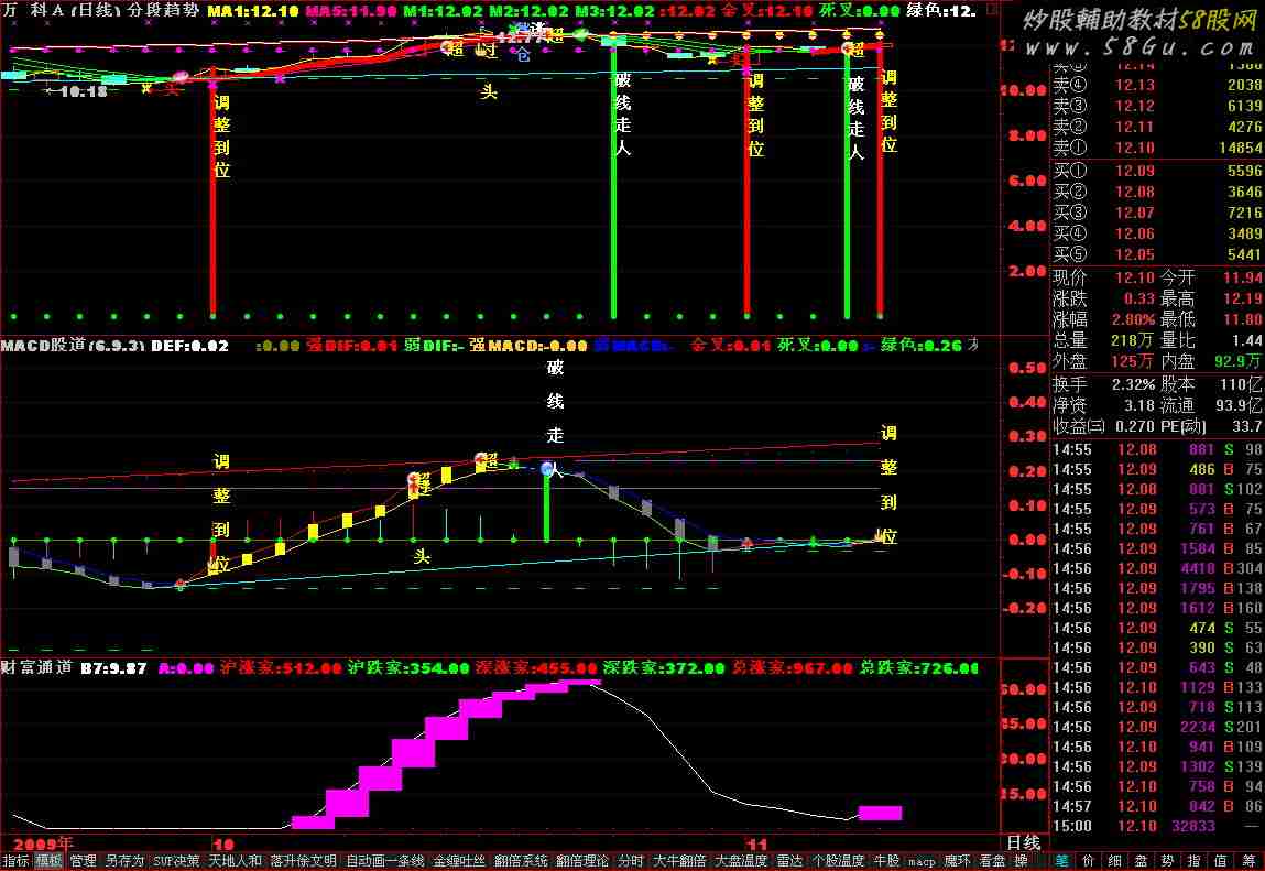财富通道: B1:=(HHV(H,9)-C)/(HHV(H,9)-LLV(LOW,9))*100- 70; B2:=SMA(B1,9,1)+100; B3:=(C-LLV(L,9))/(HHV(H,9)- LLV(L,9))*100; B4:=SMA(B3,3,1); B5:=SMA(B4,3,1)+100; B6:=B5-B2; B7:IF(B6>60,B6-60,0); 持有:STICKLINE(REF(B7,1)<B7,B7,REF(B7,1),5,0),COLORMAGENTA; A:0,POINTDOT,COLORMAGENTA,LINETHICK3;
