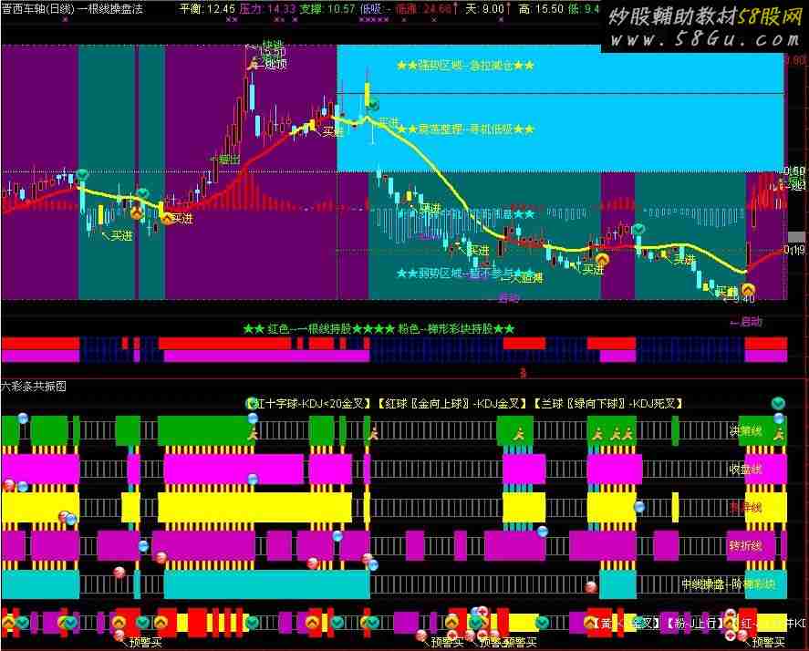 本副图指标将论坛流行较广的短线决策线、阶梯、转折线、变异阶梯等用来判断走势的指标进行简化并汇集一体,同时添加了逃顶、KDJ金叉死叉、顶底预警等标识,综合著因素找到共振点,用以为操盘决策提供一定的帮助。(仅供参考。详细情况自己慢慢体会吧!!!)六彩条共振副图源码; RC:=DYNAINFO(3);{前收盘价} S2:=SMA(C,3,1);{收盘价的3日[1日权重]移动平均} S6:=SMA(C,5,1);{收盘价的5日[1日权重]移动平均} DK:=2*(S2-S6); AA:=DK>0; AAB:=DK<0; AB1:=MA(CLOSE,20); AB2:=(CLOSE>MA(CLOSE,5)); AB3:=(MA(CLOSE,5)>MA(CLOSE,10)); AB4:=(CLOSE>MA(CLOSE,10)); AB5:=(MA(CLOSE,5)>MA(CLOSE,20)); AB6:=(CLOSE>MA(CLOSE,20)); AB7:=REF(AB1,1); AB8:=(AB1> AB7); AVX:=(((((IF(AB2,10,(0 - 10)) + IF(AB3,10,(0 - 10))) + IF(AB4,10,(0 -10))) + IF(AB5,10,(0 - 10))) + IF(AB6,10,(0 - 10))) + IF(AB7,10,(0 - 10)) + IF(AB8,10,(0 -10)))+40,COLORFF00FF; BB:=AVX>=50; BBB:= AVX<50; AC:=CLOSE; 转强:=WMA(HIGH,5); 转弱:=WMA(LOW,5); B:=CLOSE*0; 转折线:=IF(B=-1,MA(HIGH,4),MA(LOW,4)),COLORFFFF00,LINETHICK0; DD:=C>转折线; DDB:=C<转折线; TP:=REF(EMA(C,14),1); A1X:=(EMA(C,10)-TP)/TP*100; JZ:=IF(A1X>=0,REF(EMA(C,10),BARSLAST(CROSS(A1X,0))+1),REF(EMA(C,10),BARSLAST(CROSS(0,A1X))+1)),COLORFFFF00,LINETHICK2; EE:=A1X>=0; EEB:=A1X<0; N1:=IF(BARSCOUNT(C)>=8,8,BARSCOUNT(C)); AMOV:=VOL*(C+L+H)/3; MN:=SUM(AMOV,N1)/SUM(VOL,N1),COLORFF0000,LINETHICK3; FF:=C> MN; FFB:=C<MN; RSV:=(CLOSE-LLV(LOW,9))/(HHV(HIGH,9)-LLV(LOW,9))*100; K:=SMA(RSV,3,1),COLORRED,LINETHICK2; D:=SMA(K,3,1),COLORFFFF00,LINETHICK2; J:=3*K-2*D,COLORFF00FF,LINETHICK2; STICKLINE(1,4,11,4,1),COLOR686868; STICKLINE(K>=D,3,12,4,0),COLOR00FFFF; STICKLINE(J>=REF(J,1),2,13,4,0),COLORBB00BB; STICKLINE(J>=REF(J,1) AND K>=D,0,15,4,0),COLOR0000FF; STICKLINE(AA AND BB AND DDAND FF,50,110,2,0),COLORBBBB00; STICKLINE(AA AND BB AND DD AND EE AND FF,30,110,2,0),COLORRED; STICKLINE(AA AND BB AND DD AND EE AND FF,30,110,0.5,0),COLOR00FFFF; STICKLINE(EE,20,35,4,0),COLORCCCC00; STICKLINE(EEB,23,32,3,1),COLOR686868; STICKLINE(DD,40,55,4,0),COLORBB00CC; STICKLINE(DDB,43,52,3,1),COLOR686868; STICKLINE(BB,60,75,4,0),COLOR00FFFF; STICKLINE(BBB,63,72,3,1),COLOR686868; STICKLINE(AA,80,95,4,0),COLORFF00FF; STICKLINE(AAB,83,92,3,1),COLOR686868; STICKLINE(FF,100,115,4,0),COLOR00AA00; STICKLINE(FFB,103,112,3,1),COLOR686868; DRAWTEXT(CURRBARSCOUNT=18,27,'中线操盘--阶梯彩块'),COLOR00FFFF; DRAWTEXT(CURRBARSCOUNT=10,47,'转折线'),COLOR00FFFF; DRAWTEXT(CURRBARSCOUNT=10,67,'变异线'),COLOR0000FF; DRAWTEXT(CURRBARSCOUNT=10,87,'收盘线'),COLOR00FFFF; DRAWTEXT(CURRBARSCOUNT=10,107,'决策线'),COLOR00FFFF; DRAWICON(CROSS(K,D),D,13); DRAWICON(CROSS(D,K),D,14); DRAWICON(CROSS(K,D) AND K<20,D,23); DRAWICON(CROSS(K,D),7,34); DRAWICON(CROSS(D,K),7,35); DRAWICON(CROSS(K,D) AND K<20,0,23); DRAWTEXT(CURRBARSCOUNT=33,7,'【黄-KD金叉】【粉-J上行】【 红-J上行并KD金叉】'),COLORFFFFFF; LC5:=REF(CLOSE,1); RSI5:=SMA(MAX(CLOSE-LC5,0),6,1)/SMA(ABS(CLOSE-LC5),6,1)*100; R:=(CLOSE-LLV(LOW,9))/(HHV(HIGH,9)-LLV(LOW,9))*100; A:=SMA(R,3,1); BT:=SMA(A,3,1); CCC:=(BT/2+40)*1.1; DA:=SMA(CCC,3,1); DRAWICON(CROSS(DA,RSI5),105,15); DRAWICON(CROSS(80,RSI5),113,14); LC:=REF(CLOSE,1); RSI1:=SMA(MAX(CLOSE-LC,0),6,1)/SMA(ABS(CLOSE-LC),6,1)*100; 周15:=FILTER(CROSS(80,RSI1) AND RSI1<REF(RSI1,1),8); DRAWICON(周15,125,35); TYP:=(HIGH+LOW+CLOSE)/3; CCI:=(TYP-MA(TYP,14))/(0.015*AVEDEV(TYP,14)); CCI修正1:=EMA(EMA(EMA(CCI,2),2),2); CCI修正2:=EMA(EMA(EMA(CCI,3),2),2); X:=(CROSS(CCI修正1,CCI修正2) OR (CCI修正1>=CCI修正2)) AND CCI修正1>=-101 AND CCI修正1>=REF(CCI修正1,1) AND REF(CCI修正1,1)<-101 ; RSVT:=(CLOSE-LLV(LOW,9))/(HHV(HIGH,9)-LLV(LOW,9))*100; KT:=SMA(RSVT,3,1); DT:=SMA(KT,3,1); JT:=3*KT-2*DT; K1:= EMA(EMA(EMA(KT,2),2),2); D1:= EMA(EMA(EMA(DT,2),2),2); J1:= EMA(EMA(EMA(JT,2),2),2); Y:= J1>REF(J1,1) ; 预警:=X AND Y; DRAWICON(预警,0,13); DRAWTEXT(预警,-3,'↖预警买'),COLORYELLOW; DRAWTEXT_FIX(1,0.3,0,0,'【红十字球-KDJ<20金叉】【红球〖金向上球〗-KDJ金叉】【兰球〖绿向下球〗-KDJ死叉】'),COLOR00FFFF; |
