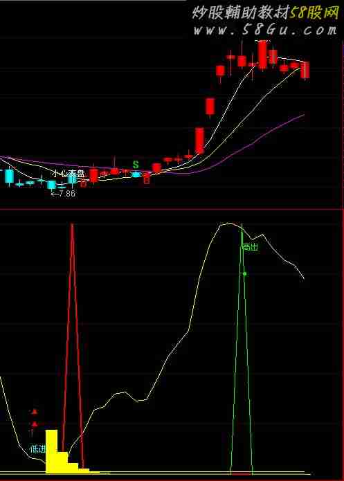 VAR1:=REF((LOW+OPEN+CLOSE+HIGH)/4,1); VAR2:=SMA(ABS(LOW-VAR1),13,1)/SMA(MAX(LOW-VAR1,0),10,1); VAR3:=EMA(VAR2,10); VAR4:=LLV(LOW,33); 趋势线: 3*SMA((CLOSE-LLV(LOW,27))/(HHV(HIGH,27)-LLV(LOW,27))*100,5,1)-2*SMA(SMA((CLOSE-LLV(LOW,27))/(HHV(HIGH,27)-LLV(LOW,27))*100,5,1),3,1),COLOR00FFFF; 见底信号: 1; 买入时机: IF(CROSS(趋势线,见底信号),100,0),COLORRED,LINETHICK2; VAR5:=EMA(IF(LOW<=VAR4,VAR3,0),3); STICKLINE(VAR5>REF(VAR5,1),0,VAR5,4,0 ),COLOR00FFFF; STICKLINE(VAR5<REF(VAR5,1),0,VAR5,4,0),COLOR00FFFF; 极品底:IF((MA(C,5)-C)/C>0.04 AND (MA(C,10)-MA(C,5))/MA(C,5)>0.04,100,0),LINETHICK2,COLORRED; DRAWICON(极品底=100,100,1),LINETHICK0,COLORRED; RSV:=(((CLOSE - LLV(LOW,9)) / (HHV(HIGH,9) - LLV(LOW,9))) * 100); K:=SMA(RSV,3,1); D:=SMA(K,3,1); J:=3*K-2*D; X:=LLV(J,2)=LLV(J,8); DRAWTEXT(CROSS(J,REF(J+0.01,1)) AND X AND J<19,10,'低进'),COLORFFFF00; DRAWTEXT(CROSS(J,REF(J+0.01,1)) AND X AND J<19,25,'▲'),COLORRED; DRAWTEXT(CROSS(J,REF(J+0.01,1)) AND X AND J<19,20,'▲'),COLORRED; DRAWTEXT(CROSS(J,REF(J+0.01,1)) AND X AND J<19,17,'↑'),COLORRED; 散户:= EMA(((2*CLOSE+HIGH+LOW)/4-LLV(LOW,5))/(HHV(HIGH,4)-LLV(LOW,5))*100,4); 庄家:= EMA(0.667*REF(散户,1)+0.333*散户,2); DRAWTEXT(CROSS(庄家,散户) AND 散户>70,90.5,'高出'),COLOR00FF00; DRAWTEXT(CROSS(庄家,散户) AND 散户>70,80,'●'),COLOR00FF00; 高出:100*(CROSS(庄家,散户) AND 散户>70),COLOR00FF00;