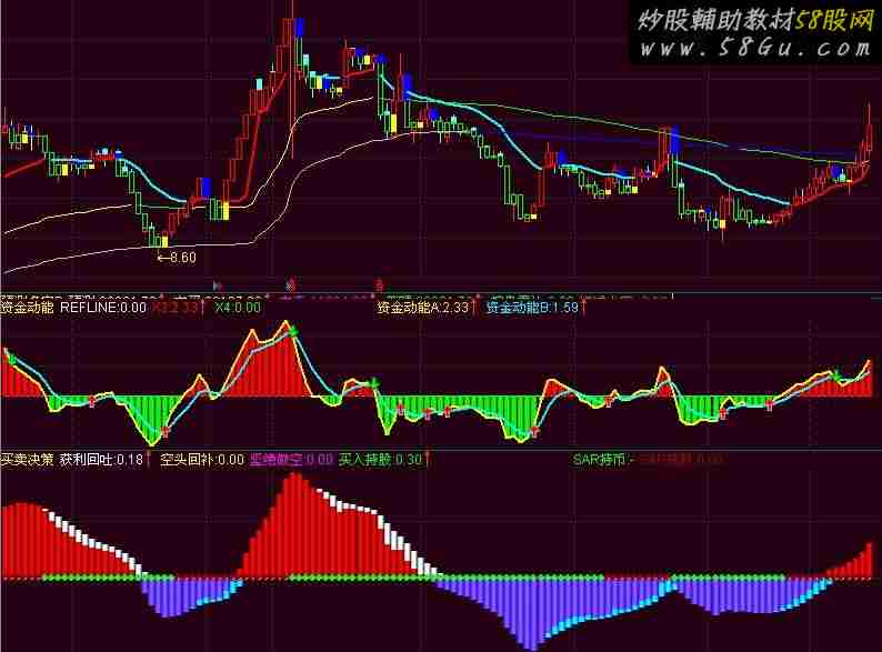 A1:=EMA(C,12)-EMA(C,25); A2:=EMA(A1,6); 获利回吐:(A2>=0)*A2,COLORWHITE,LINETHICK0; 空头回补:(A2<0)*A2,COLORYELLOW,LINETHICK0; 坚绝做空:(A1<0)*A1,COLORGREEN,LINETHICK0; 买入持股:(A1>=0)*A1,COLORRED,LINETHICK0; STICKLINE(A2>=0,A2,0,3.2,0),COLOR555555; STICKLINE(A2>=0,A2,0,2.9,0),COLOR777777; STICKLINE(A2>=0,A2,0,2.4,0),COLOR999999; STICKLINE(A2>=0,A2,0,1.8,0),COLORBBBBBB; STICKLINE(A2>=0,A2,0,1.1,0),COLORDDDDDD; STICKLINE(A2>=0,A2,0,0.3,0),COLORFFFFFF; STICKLINE(A2<0,A2,0,3.2,0),COLORFF5500; STICKLINE(A2<0,A2,0,2.9,0),COLORFF7700; STICKLINE(A2<0,A2,0,2.4,0),COLORFF9900; STICKLINE(A2<0,A2,0,1.8,0),COLORFFBB00; STICKLINE(A2<0,A2,0,1.1,0),COLORFFDD00; STICKLINE(A2<0,A2,0,0.3,0),COLORFFFF00; STICKLINE(A1<0,A1,0,3.2,0),COLORCC0066; STICKLINE(A1<0,A1,0,2.9,0),COLOREE0066; STICKLINE(A1<0,A1,0,2.4,0),COLORFF0066; STICKLINE(A1<0,A1,0,1.8,0),COLORFF2266; STICKLINE(A1<0,A1,0,1.1,0),COLORFF4466; STICKLINE(A1<0,A1,0,0.3,0),COLORFF6666; STICKLINE(A1>=0,A1,0,3.2,0),COLOR000055; STICKLINE(A1>=0,A1,0,2.9,0),COLOR000077; STICKLINE(A1>=0,A1,0,2.4,0),COLOR000099; STICKLINE(A1>=0,A1,0,1.8,0),COLOR0000BB; STICKLINE(A1>=0,A1,0,1.1,0),COLOR0000DD; STICKLINE(A1>=0,A1,0,0.3,0),COLOR0000FF; SAR持币:IF(SAR(10,2,20)>=H,0,DRAWNULL),CIRCLEDOT,COLORGREEN; SAR持股:IF(SAR(10,2,20)<=L,0,DRAWNULL),CIRCLEDOT,COLOR000099; |