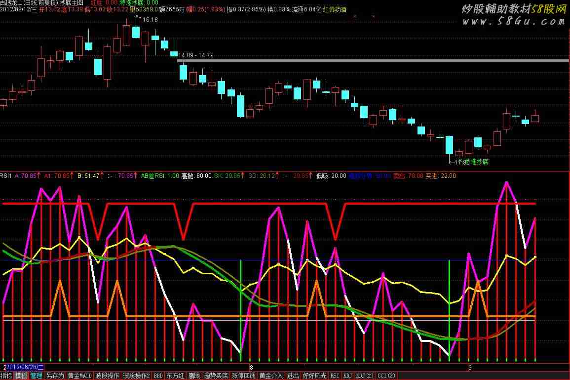 N:=5; A:"RSI.RSI1"(3,14,24),COLORMAGENTA,LINETHICK4; A1:"RSI.RSI1"(3,14,24),COLORRED,STICK,LINETHICK3; B:"RSI.RSI2"(3,14,24),COLORYELLOW,LINETHICK3; IF(A<REF(A,1),A,DRAWNULL),COLORWHITE,LINETHICK4; IF(A>REF(A,1),A,DRAWNULL),COLORMAGENTA,LINETHICK4; AB差RSI:IF((B-A)/A>N,50,1),STICK,LINETHICK3,COLORGREEN; VAR1:=(2*CLOSE+HIGH+LOW+OPEN)/5; 高抛: 80, POINTDOT; VAR2:=LLV(LOW,34); VAR3:=HHV(HIGH,34); SK: EMA((VAR1-VAR2)/(VAR3-VAR2)*100,13),COLOR00B900,LINETHICK3; SD: EMA(SK,3),COLORBROWN,LINETHICK3; IF(SK<REF(SK,1),SK,DRAWNULL),COLOR00B900,LINETHICK4; IF(SK>REF(SK,1),SK,DRAWNULL),COLOR0000AD,LINETHICK4; 低吸: 20; 强弱分界: 50; VAR4:=IF(CROSS(SK,SD),40,22); VAR5:=IF(CROSS(SD,SK),60,78); 卖出: VAR5,COLORRED,LINETHICK4; 买进: VAR4,COLOR0080F6,LINETHICK4;