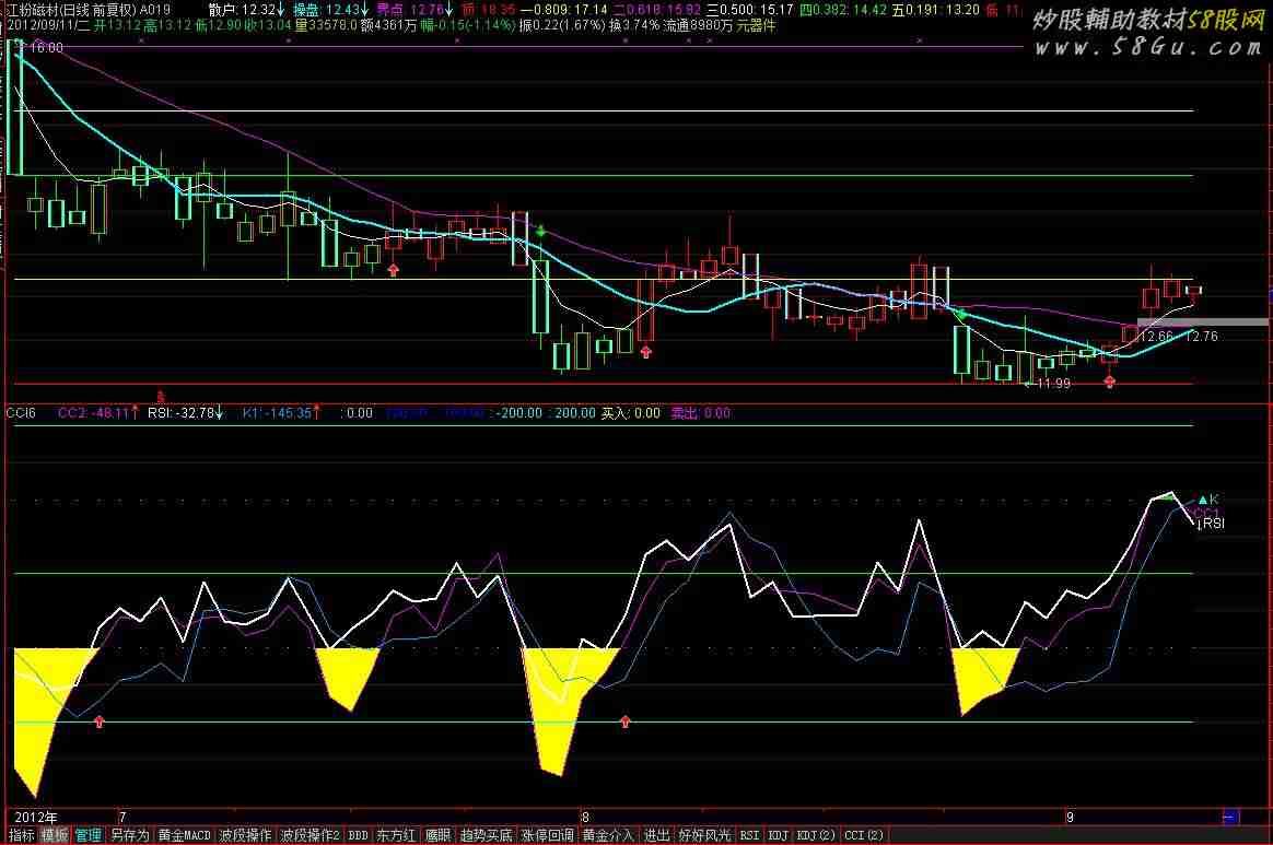TYP := (HIGH + LOW + CLOSE)/3; CC1:=(TYP-MA(TYP,14))/(0.015*AVEDEV(TYP,14)); DRAWTEXT(ISLASTBAR AND CC1,CC1,'CC1'),COLORFF00FF; DRAWBAND(CC1,RGB(2,255,2),-100,RGB(255,255,0)); DRAWBAND(100,RGB(0,0,0),-100,RGB(0,0,0)); CC2:(TYP-MA(TYP,14))/(0.015*AVEDEV(TYP,14)),COLORFF00FF; LC := REF(CLOSE,1); RSI1:=SMA(MAX(CLOSE-LC,0),6,1)/SMA(ABS(CLOSE-LC),6,1)*100; RSI:(RSI1-50)*5,LINETHICK2,COLORFFFFFF; DRAWTEXT(ISLASTBAR AND RSI>REF(RSI,1),RSI,' ↑RSI'),COLORFFFFFF; DRAWTEXT(ISLASTBAR AND RSI<REF(RSI,1),RSI,' ↓RSI'),COLORFFFFFF; RSV:=(CLOSE-LLV(LOW,9))/(HHV(HIGH,9)-LLV(LOW,9))*100; K:=SMA(RSV,3,1); K1:(K-50)*5,COLORFF9F00;