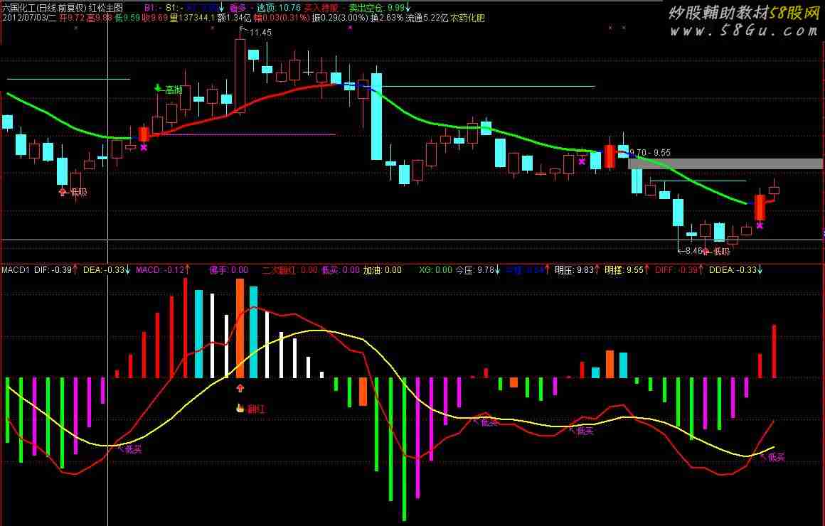 DIF:EMA(CLOSE,6)-EMA(CLOSE,19),,NODRAW; DEA:EMA(DIF,9),NODRAW; MACD:2*(DIF-DEA),COLORSTICK; STICKLINE(MACD>0,MACD,0,0.5,0),COLORRED; STICKLINE(MACD<0,MACD,0,0.5,0),COLORGREEN; STICKLINE(MACD>0 AND MACD<REF(MACD,1),MACD,0,0.5,0),COLORWHITE; STICKLINE(MACD<0 AND MACD>REF(MACD,1),MACD,0,0.5,0),COLORFF00FF; FH1:=REF(MACD,1)<REF(MACD,2) AND REF(MACD,2)<REF(MACD,3) AND REF(MACD,3)<REF(MACD,4); FH2:=MACD>=0 AND COUNT(MACD>REF(MACD,1),1)=1; FH3:=FH1 AND FH2 AND EMA(C,13)>REF(EMA(C,13),1); FH4:=FH1 AND FH2 AND ABS((DIF-DEA)/C)<0.018; FH5:=FH1 AND FH2 AND MACD<0.10; VV:=CLOSE>OPEN AND MA(CLOSE,5)>MA(CLOSE,10) AND MA(CLOSE,10)>MA(CLOSE,30) AND DIF>DEA AND MACD>REF(MACD,1) AND DIF>0 AND DEA>0 AND MA(VOL,5)>MA(VOL,34) AND MA(CLOSE,30)>=REF(MA(CLOSE,30),1); 佛手:IF(VV,1,0),NODRAW; {二次起动} X0:=BARSLAST((CROSS(MACD,REF(MACD,1)) AND MACD>0) OR CROSS(MACD,0)); X1:=BARSLAST(CROSS(0.5,COUNT(MACD>REF(MACD,1),X0+1)=X0+1));{回} X2:=COUNT(MACD<REF(MACD,1),X1+1)=X1+1 AND COUNT(MACD<0,X1+1)<=2; X3:=REF(X2,1) AND MACD>REF(MACD,1) AND C>O AND C>REF(C,1); STICKLINE(X1=0 AND MACD>0,MACD,0,2,0),COLORDCDC00;{MACD缩头} STICKLINE(X3,MACD,0,2,0),COLOR0854FF;{二次起动}; DRAWICON(佛手,-0.15,11); 二次翻红:(FH3 OR FH4 OR FH5),COLORRED,NODRAW; 低买:CROSS(DIF,DEA) AND DIF<0,COLORFF00FF,NODRAW; 加油:CROSS(DIF,DEA) AND DIF>0,COLORYELLOW,NODRAW; DRAWICON(二次翻红,-0.05,1); DRAWTEXT(二次翻红,-0.15,'↖翻红'),COLORRED; DRAWTEXT(CROSS(DIF,DEA) AND DIF<0,DEA-0.02,'↖低买'),COLORFF00FF; DRAWTEXT(CROSS(DIF,DEA) AND DIF>0,DEA-0.05,'↖加油'),COLORYELLOW; XG:二次翻红 OR 低买 OR 加油,NODRAW; YLZC:=IF(CLOSE=INDEXC,(INDEXC+INDEXH+INDEXL+INDEXO)/4,AMOUNT/(VOL+0.01)/100); 阻价:=IF(CLOSE=INDEXC,YLZC+INDEXC-INDEXL,YLZC+(CLOSE-LOW)); 支价:=IF(CLOSE=INDEXC,INDEXL+INDEXC-YLZC,LOW+(CLOSE-YLZC)); 今压:REF(阻价,1),LINETHICK0,COLORAA11BB,NODRAW; 今撑:REF(支价,1),LINETHICK0,COLOR009900,NODRAW; 明压:阻价,LINETHICK0,NODRAW; 明撑:支价,LINETHICK0,NODRAW; DIFF:DIF,COLORRED,LINETHICK2; DDEA:DEA,COLORYELLOW,LINETHICK2;