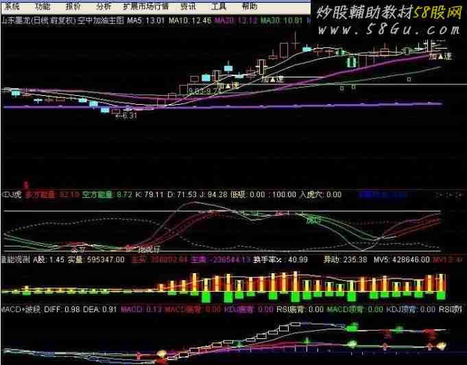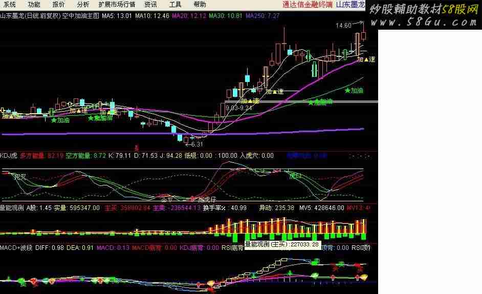 {空中加油(主图)源码}MA5:MA(CLOSE,5);MA10:MA(CLOSE,10);MA20:MA(CLOSE,20);MA30:MA(CLOSE,30);MA250:MA(CLOSE,250),COLORRED;N1:=BARSLAST(CROSS(MA5,MA10));N2:=BARSLAST(CROSS(MA10,MA5));多:=IF(N1<N2,N1+1,0);空:=IF(N2<N1,N2+1,0);QSXS:=MA5>MA20 AND MA10>MA20 AND MA20>REF(MA20,1) AND MA30>REF(MA30,1);启动:=多*QSXS,COLORRED,LINETHICK0;跑道:=空*QSXS,COLORFFFF00,LINETHICK0;HKFJ:=HHV(多,5)>=2 AND QSXS AND MA5>REF(MA5,1) AND MA5>MA10;航空飞机:=HKFJ*多,COLORFF00FF,LINETHICK2;HKSJ:=BARSLAST(航空飞机>0 AND NOT(REF(航空飞机,1)))+1;高度:=(C/REF(C,HKSJ)-1)*100,COLOR00FFFF;空中加油:启动>0 AND 航空飞机=0,COLOR00FF00,POINTDOT,LINETHICK0;N3:=BARSLAST(空中加油)+1;K5:=ATAN((MA5/REF(MA5,1)-1)*100)*180/3.14159;JXGD1:=K5>REF(K5,1) AND REF(K5,1)<REF(K5,2);JXGD2:=MA5>REF(MA5,1) AND REF(MA5,1)<REF(MA5,2);加速远航:FILTER((JXGD1 OR JXGD2) AND C>MA5 AND HKFJ,3),COLOR00FFFF,POINTDOT,LINETHICK0;N4:=BARSLAST(加速远航);{以下设置主图显示方式}STICKLINE(空中加油,(O+C)/2-0.01,(O+C)/2+0.01,4,0),COLOR00FF00;STICKLINE(空中加油,L,H,1,1),COLOR00FF00;STICKLINE(加速远航,(O+C)/2-0.01,(O+C)/2+0.01,4,0),COLOR00FFFF;STICKLINE(加速远航,L,H,1,1),COLOR00FFFF;STICKLINE(N4>0 AND N4<=5,REF(O,N4+1),REF(O,N4+1),4,1),COLORFFFFFF;DRAWTEXT(加速远航,L,'加▲速'),COLOR00FFFF;DRAWTEXT(航空飞机,MA30,'○'),COLORFFFFFF;DRAWTEXT(空中加油,MA30,'□'),COLOR00FF00;{本人优化后空中加油(主图)源码}MA5:MA(CLOSE,5),LINETHICK1;MA10:MA(CLOSE,10),LINETHICK1;MA20:MA(CLOSE,20),LINETHICK2;MA30:MA(CLOSE,30),LINETHICK1;MA250:MA(CLOSE,250),COLORFF3399,LINETHICK3;N1:=BARSLAST(CROSS(MA5,MA10));N2:=BARSLAST(CROSS(MA10,MA5));多:=IF(N1<N2,N1+1,0);空:=IF(N2<N1,N2+1,0);QSXS:=MA5>MA20 AND MA10>MA20 AND MA20>REF(MA20,1) AND MA30>REF(MA30,1);启动:=多*QSXS,COLORRED,LINETHICK0;跑道:=空*QSXS,COLORFFFF00,LINETHICK0;HKFJ:=HHV(多,5)>=2 AND QSXS AND MA5>REF(MA5,1) AND MA5>MA10;航空飞机:=HKFJ*多,COLORFF00FF,LINETHICK2;HKSJ:=BARSLAST(航空飞机>0 AND NOT(REF(航空飞机,1)))+1;高度:=(C/REF(C,HKSJ)-1)*100,COLOR00FFFF;空中加油:=启动>0 AND 航空飞机=0,COLOR00FF00,POINTDOT,LINETHICK0;N3:=BARSLAST(空中加油)+1;K5:=ATAN((MA5/REF(MA5,1)-1)*100)*180/3.14159;JXGD1:=K5>REF(K5,1) AND REF(K5,1)<REF(K5,2);JXGD2:=MA5>REF(MA5,1) AND REF(MA5,1)<REF(MA5,2);加速远航:=FILTER((JXGD1 OR JXGD2) AND C>MA5 AND HKFJ,3),COLOR00FFFF,POINTDOT,LINETHICK0;N4:=BARSLAST(加速远航);{以下设置主图显示方式}STICKLINE(空中加油,(O+C)/2-0.01,(O+C)/2+0.01,4,0),COLOR00FF00;STICKLINE(空中加油,L,H,1,1),COLOR00FF00;STICKLINE(加速远航,(O+C)/2-0.01,(O+C)/2+0.01,4,0),COLOR00FFFF;STICKLINE(加速远航,L,H,1,1),COLOR00FFFF;STICKLINE(N4>0 AND N4<=5,REF(O,N4+1),REF(O,N4+1),4,1),COLORFFFFFF;DRAWTEXT(加速远航,L,'加▲速'),COLOR00FFFF;DRAWTEXT(航空飞机,MA30,'○'),COLORFFFFFF;DRAWTEXT(空中加油,MA30,'★加油'),COLOR00FF00;  |