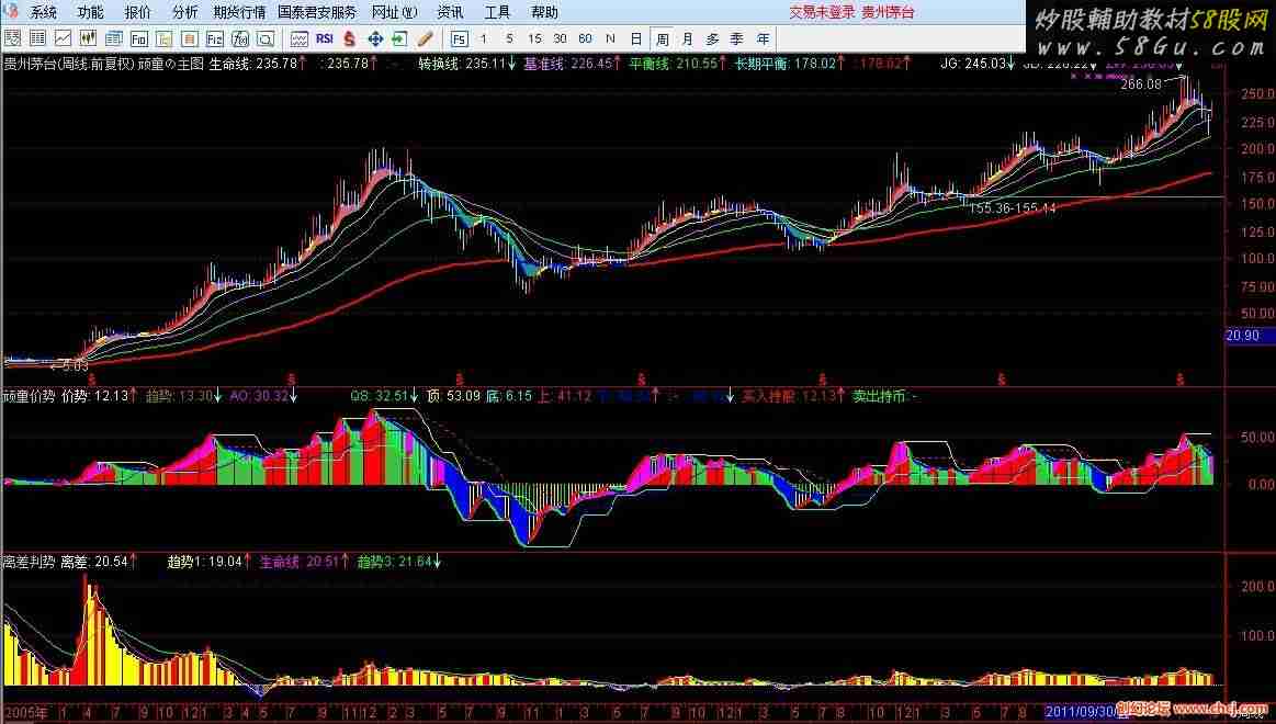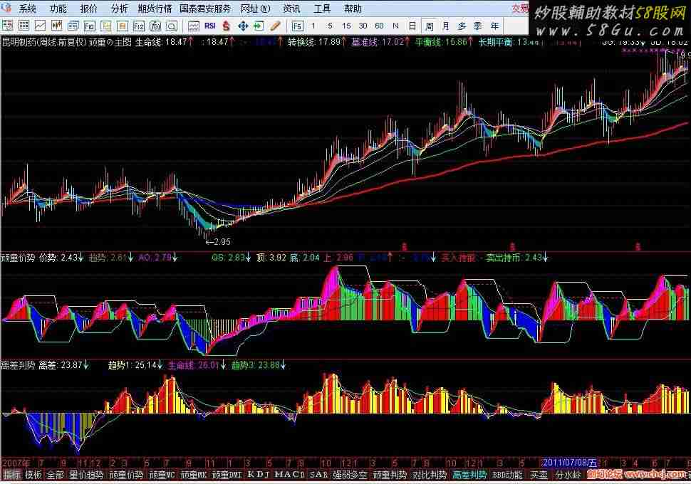 生命线:(EMA(C,5)*7+EMA(C,10)*3)/10; SWS:=DMA(EMA(CLOSE,12),MAX(1,100*(SUM(VOL,5)/(3*CAPITAL)))); DRAWBAND(生命线,RGB(195,111,123),SWS,RGB(18,156,133)); 价势:=EMA((EMA(C,3)-EMA(C,5)-EMA(EMA(C,13)-EMA(C,8),21))*6,3); IF(生命线>REF(生命线,1),生命线,DRAWNULL),COLORYELLOW,LINETHICK2; IF(价势>=REF(价势,1) AND 生命线>SWS,生命线,DRAWNULL),COLORRED,LINETHICK2; IF(价势<REF(价势,1),生命线,DRAWNULL),COLORBLUE,LINETHICK2; 成交额:=CLOSE*VOL; 均价:=(EMA(成交额,3)/EMA(VOL,3)+EMA(成交额,6)/EMA(VOL,6)+ EMA(成交额,12)/EMA(VOL,12)+EMA(成交额,24)/EMA(VOL,24))/4; 转换线:EMA(均价,8),COLORWHITE; 基准线:EMA(均价,21),COLORFF6DD8; 平衡线:(EMA(均价,30)+EMA(均价,72))/2,COLORGREEN; 长期平衡:(EMA(C,89)+EMA(C,233))/2,COLORCYAN,DOTLINE; IF(长期平衡>REF(长期平衡,1),长期平衡,DRAWNULL),COLORRED,LINETHICK2; IF(长期平衡<REF(长期平衡,1),长期平衡,DRAWNULL),COLORBLUE,LINETHICK2; {短线:EMA(C,3),COLORWHITE;} {JG:MA(H,5),NODRAW; JD:MA(L,5),NODRAW; ZW:(JG+JD)/2,NODRAW;}  |
