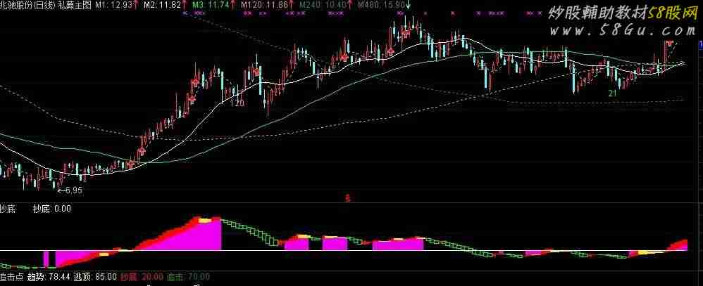 VAR2:=MA(CLOSE, 3); VAR3:=MA(CLOSE, 10); VAR4:=MA(CLOSE, 30); VAR5:=MA(CLOSE, 60); VAR6:=(VAR2+VAR3+VAR4+VAR5)/4; VAR7:=(VAR6-REF(VAR6, 15))/REF(VAR6, 15)*100; VAR8:=(VAR6-REF(VAR6, 15))/REF(VAR6, 15)*100; VAR9:=EMA(VAR7, 8); 反转:STICKLINE(VAR9>1*REF(VAR9, 1), VAR7, 0, 5, 0), COLOREE00EE; 持股:STICKLINE(VAR7>1*REF(VAR7, 1), VAR7, VAR9, 5, 0), COLORRED; 持币:STICKLINE(VAR7<1*REF(VAR7, 1), VAR7, VAR9, 5, 1), COLORGREEN; 洗盘:STICKLINE(VAR7<1*REF(VAR7, 1) AND VAR9>1*REF(VAR9, 1), VAR7, VAR9, 10, 0), COLOR00EEFF; VAR10:=(CLOSE-MA(CLOSE, 58))/MA(CLOSE, 58)*100; VAR11:=(VAR10>1*REF(VAR10, 1) AND VAR10<-26 AND VAR10>-40)*1.5; VAR12:=VOL/CAPITAL*100; VAR13:=LLVBARS(LOW, 50); VAR14:=SUM(VOL, VAR13); VAR15:=HHVBARS(HIGH, 50); VAR16:=SUM(VOL, VAR15); VAR17:=(CLOSE-REF(OPEN, VAR15))/REF(OPEN, VAR15)*100; VAR18:=VAR16/CAPITAL*100; VAR19:=(CLOSE-REF(OPEN, VAR13))/REF(OPEN, VAR13)*100; VAR20:=VAR14/CAPITAL*100; VAR21:=MA(CLOSE, 3); VAR22:=REF(CLOSE, 2)*0.865; VAR23:=REF(CLOSE, 13)*0.772; VAR24:=MIN(VAR22, VAR23); VAR25:=MA(CLOSE, 13); 抄底:IF((CLOSE-VAR24)/CLOSE<0.030 AND VAR17<(-35) AND SUM(VAR12, 5)/5<1.800, 1, 0)*10, COLORWHITE; VAR26:=(CLOSE-REF(CLOSE, 1))/REF(CLOSE, 1)*100; VAR27:=(EMA(CLOSE, 12)-EMA(CLOSE, 26))*100; VAR28:=EMA(VAR27, 9); VAR29:=2*(VAR27-VAR28); DRAWTEXT(VAR27<(-50) AND VAR26>7 AND VAR27<VAR28, (-9), '底'), COLORWHITE; DRAWTEXT(VAR27<(-50) AND VAR26>7 AND VAR27>=VAR28, 2, '追'), COLORWHITE; STICKLINE(VAR27<(-50) AND VAR26>7, 0,(-10), 5, 0), COLORFFFF66;