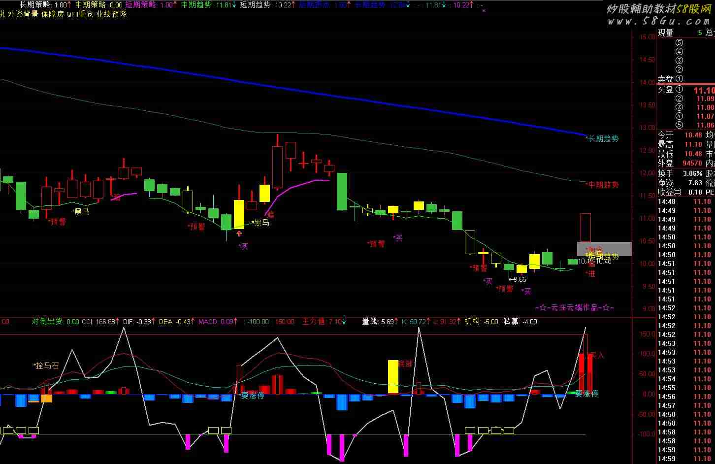 说明;指标的共振主要是指同一类指标在同时间内同时发出买卖信号的技术现象,这是一种非常强烈和明确的操作指示。很多技术指标都存在一定的共振现象,但不是所有的技术指标的共振现象都有 实用价值的,技术指标的时间共振在时间周期方面包括四要素:即月线指标、周线指标、日线指标和分时线指标,其中分时线指标在大多数情况下采用的是60分钟线的技术指标。这四要素构成时间共振分析的整体, 可以说缺一不可。投资者在实际应用中最容易忽略的周期要素分别是月线指标和分时线指标,如果忽略月线指标,常常会使投资者的操作缺少趋势的支持,而缺少分时线指标,常常会使投资者在短线买卖点方面存有 疑惑。因此,投资者在应用共振分析时必须完整的考虑四要素的状况,高手飘过。需要通达信公式编辑器4.17版本才可编辑导入公式 C2:=REF(C,1); BG:=IF((C2-C)*100/C2>=2.3,1,0) OR IF((O-C)*100/O>=5,1,0){ OR IF((H-L)*100/REF(C,1)>5,1,0)}; BG2:=IF((H-L)*100/C2>=3.58,1,0); BB1:=L<REF(L,1); SELL1:=BG AND BB1 ; BR:=IF((C-C2)*100/C2>=2.59,1,0) OR IF((C-O)*100/O>=4.5,1,0) OR IF((C-L)*100/L>5,1,0); STICKLINE(BR,O,C,3,0),COLORRED; DAY1:=BARSLAST(SELL1); JIA1:=REF(O,DAY1); JIA2:=REF(O,1); BB4:=C>JIA2; BB2:=H>JIA1; BUY1:=BR AND BB2 AND BB4; DAY2:=BARSLAST(BUY1); S1:=DAY1<DAY2; B1:=DAY2<DAY1; STICKLINE(S1,O,C,3,0),COLORLIGREEN; STICKLINE(B1,H,L,0.3,0),COLORRED; STICKLINE(B1,O,C,3,1),LINETHICK2,COLORRED; AA2:=AMOUNT/VOL; BB3:=L<AA2*0.9; CC2:=(C-REF(C,1))/REF(C,1)*100>1.2; DD2:=L<MA(C,6)*0.921; DD1:=L<MA(C,5)*0.921; EE2:=VOL<MA(V,5)*1.5; FF2:=BB3 AND CC2 AND DD2 AND EE2; STICKLINE(FF2,H,L,0.3,0),COLOR00FFFF; B4:=BARSLAST(FF2); E4:=B4<5; F4:=E4 AND C>REF(C,1); STICKLINE(F4,H,L,0.3,0),COLOR00FFFF; A2:=(C-REF(C,1))/REF(C,1)*100<1.02; A3:=H>MA(C,5)*1.12; AA:= A2 AND A3; DRAWTEXT(AA,H*1.06,'*警'),COLORGREEN; STICKLINE(AA,H,L,0.3,0),COLORFF0000; VAR1:=4*SMA((CLOSE-LLV(LOW,5))/(HHV(HIGH,5)-LLV(LOW,5))*100,5,1)- 3*SMA(SMA((CLOSE-LLV(LOW,5))/(HHV(HIGH,5)-LLV(LOW,5))*100,5,1),3.2,1); VAR2:=8; CC:=CROSS(VAR1,VAR2); CCC:=CROSS(VAR1,VAR2) AND H>REF(H,1) AND C>REF(C,1) ; DRAWICON(CCC,L*0.99,1); STICKLINE(CC,H,L,0.3,0),COLORRED; STICKLINE(CC,O,C,3,1),LINETHICK2,COLORRED; CF1:=BARSLAST(CC); CF2:=CF1<3; CF3:=CF2 AND C>REF(C,1); STICKLINE(CF3,O,C,3,0),COLORYELLOW; CD:=CROSS(VAR2,VAR1); STICKLINE(CD,H,L,0.3,0),COLORYELLOW; STICKLINE(CD,O,C,3,1),LINETHICK2,COLORYELLOW; DRAWTEXT(CD,H*0.93,'*预警'),COLORRED; DRAWTEXT(CC,L*0.97,'*买'),COLORFF00FF; VAR3AA:=IF((CLOSE>REF(CLOSE,1)),88,0); VAR4AA:=IF(((CLOSE)/(REF(CLOSE,1))>1.05) AND ((HIGH)/(CLOSE)<1.01) AND (VAR3AA>0),91,0); DRAWTEXT(FILTER((VAR4AA>90),45),(LOW)*(0.94),'*进 '),COLORRED; DRAWTEXT(FILTER((VAR4AA>90),35),(LOW)*(0.99000001),'*加仓'),COLORRED; Z1:=STRCAT(HYBLOCK,' '); Z2:=STRCAT(Z1,DYBLOCK); Z3:=STRCAT(Z2,' '); DRAWTEXT_FIX(ISLASTBAR,0,0,0,STRCAT(Z3,GNBLOCK)),COLORYELLOW; DRAWTEXT_FIX(1,0.88,5,0,'~☆~云在云端作品~☆~'),COLORMAGENTA; VAR6:=REF(C,1); VAR7:=SMA(MAX(C-VAR6,0),6,1)/SMA(ABS(C-VAR6),6,1)*100; DRAWTEXT(CROSS(82,VAR7),H*1.02,'*警'),COLORYELLOW; VAR9:=((CLOSE-LLV(LOW,27))/(HHV(HIGH,27)-LLV(LOW,27)))*(100); VAR10:=SMA(VAR9,3,1); VAR11:=SMA(VAR10,3,1); VAR12:=SMA(VAR11,3,1); A1A:=3*SMA((C-LLV(L,55))/(HHV(H,55)-LLV(L,55))*1,5,1)-2*SMA((C-LLV(L,55))/(HHV(H,55)-LLV(L,55))*1,5,1),COLOR330066; A5A:=(HHV(H,60)-C)/(HHV(H,60)-LLV(L,60))*1; DRAWTEXT(CROSS(A1A,EMA(A1A,5))AND EMA(A1A,5)<A5A,L*0.98,'*黑码'),COLORYELLOW; 多:=EMA(C,3); 空:=EMA(C,5); 均衡:=EMA(空,5); VVARF1:=COUNT(CROSS(多,均衡),2)=1; VVARF2:=COUNT(CROSS(空,均衡),2)=1; ZAI:=FILTER(VVARF1 AND VVARF2,2); DRAWTEXT(ZAI,均衡*0.985,'*追'),COLORRED; VV2:=REF(CLOSE,1); VV3:=SMA((CLOSE-VV2),6,1)/SMA(ABS(CLOSE-VV2),6,1)*100; DRAWICON(REF(VV3,1)>81 AND VV3<80,HIGH,2); VF1:=MA(CLOSE,60)-MA(CLOSE,5)/3.2; VVARR1:=SMA(MAX(CLOSE-REF(C,1),0),6,1)/SMA(ABS(CLOSE-REF(C,1)),6,1)*100; DRAWICON(CROSS(82,VVARR1),HIGH,2); DRAWTEXT(CROSS(82,VVARR1),HIGH,''),COLORYELLOW; VVAR1:=(HIGH+LOW+OPEN+2*CLOSE)/5; VVAR2:=REF(VVAR1,1); VVAR3:=SMA(MAX(VVAR1-VVAR2,0),10,1)/SMA(ABS(VVAR1-VVAR2),10,1)*100; HY3:=IF(COUNT(VVAR3<20,5)>=1 AND COUNT(VVAR1=LLV(VVAR1,10),10)>=1 AND CLOSE>=OPEN*1.038 AND VOL>MA(VOL,5)*1.2,1,0); DRAWTEXT(HY3,LOW,' *预警'),COLORRED; ZA1:=EMA(C,25); ZA2:=EMA(ZA1,45); ZB1:=EMA(C,65); ZB2:=EMA(ZB1,45); DIFF:=(ZA1+ZB2)/2; DEA:=(ZA2+ZB1)/2; KA0:=(HHV(C,45)-LLV(C,45))/45; KA1:=SMA(C,3,1); KA2:=SMA(C-KA0*3,3,1); KA3:=SMA(KA1-KA0*3,3,1); SC:=100*(CLOSE-MA(CLOSE,80)); SC1:=EMA(SC,5); SC2:=EMA(SC,21); 长期策略:SC1>=SC2,NODRAW; 中期策略:DIFF>=DEA,NODRAW; 短期策略:KA2>=KA3,NODRAW; 中期趋势:DIFF,NODRAW; 短期趋势:KA2,NODRAW; 短期拐点:REF(短期策略,1)=0 AND 短期策略=1,NODRAW; 长期趋势:ZB2,COLORBLUE,LINETHICK3; IF(DIFF>=DEA,DIFF,DRAWNULL),LINETHICK2,COLORRED; IF(DIFF<DEA,DIFF,DRAWNULL),LINETHICK1,COLORLICYAN; IF(KA2>=KA3,KA2,DRAWNULL)COLORMAGENTA,LINETHICK2; IF(KA2<KA3,KA2,DRAWNULL),LINETHICK1,COLORGREEN; DRAWTEXT(ISLASTBAR,长期趋势,'*长期趋势'),COLORLIBLUE; DRAWTEXT(ISLASTBAR,中期趋势,'*中期趋势'),COLORRED; DRAWTEXT(ISLASTBAR,短期趋势,'*短期趋势'),COLORYELLOW;