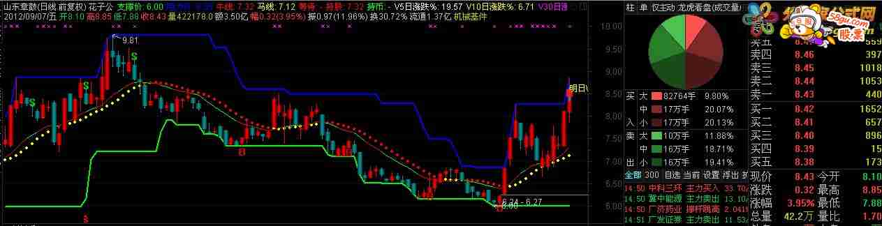 P1:=5; P2:=10; P3:=20; P4:=30; P5:=60; P6:=120; P7:=240; P8:=340; N:=4; WX:=MA(CLOSE,0); M1:=MA(CLOSE,P1); M2:=(MA(CLOSE,P2) * IF((N < 2),WX,1)); M3:=(MA(CLOSE,P3) * IF((N < 3),WX,1)); M4:=(MA(CLOSE,P4) * IF((N < 4),WX,1)); M5:=(MA(CLOSE,P5) * IF((N < 5),WX,1)); M6:=(MA(CLOSE,P6) * IF((N < 6),WX,1)); M7:=(MA(CLOSE,P7) * IF((N < 7),WX,1)); M8:=(MA(CLOSE,P8) * IF((N < 8),WX,1)); C1:=REF(CLOSE,1); C2:=HHV(C1,2); C3:=LLV(C1,1); ET:=HHV(C1,2); ET1:=REF(ET,1); XB:=LLV(C1,1); XB1:=REF(XB,1); M:=BARSLAST(((CLOSE < XB) AND (C1 >= XB1))); M11:=REF(M,1); N9:=BARSLAST(((CLOSE > ET) AND (C1 <= ET1))); N1:=REF(N9,1); M21:=(BARSLAST((((M - N9) > 0) AND (M11 <= N1))) + 1); N2:=(BARSLAST((((N9 - M) > 0) AND (N1 <= M11))) + 1); ET2:=HHV(ET,M21); XB2:=LLV(XB,N2); A:=IF((((M - N9) > 0) AND (M11 <= N1)),1,IF((((N9 - M) > 0) AND (N1 <= M11)),0,2)); H1:=IF(((M - N9) > 0),CLOSE,ET2); H2:=IF((A = 1),CLOSE,C2); H3:=IF(((M - N9) < 0),CLOSE,XB2); H4:=IF((A = 1),CLOSE,XB2); H5:=IF((((M - N9) > 0) OR (A = 1)),CLOSE,H3); H6:=REF(H5,1); H7:=REF(H5,2); H8:=(H5 > H6); H9:=(((H4 = REF(H4,1)) AND (REF(H4,1) < REF(H4,2))) AND (H5 > REF(H5,2))); H10:=(((H2 = REF(H2,1)) AND (H4 = REF(H4,1))) AND (H5 = REF(H5,2))); W:=((H8 OR H9) OR H10); T9:=((H5 < H6) AND (H5 < REF(H5,2))); T10:=((H4 = REF(H4,1)) AND (H5 < REF(H5,2))); T11:=((H3 > REF(H3,1)) AND (H5 < REF(H5,1))); T12:=((H5 = REF(H5,1)) AND (H3 = H4)); T13:=((H2 = REF(H2,1)) AND (H2 = H5)); TW:=((((T9 OR T10) OR T11) OR T12) OR T13); PK:=((AMOUNT * (((OPEN + CLOSE) + HIGH) + LOW)) / 4); PK1:=IF((VOL > 0),(PK / AMOUNT),((((OPEN + CLOSE) + HIGH) + LOW) / 4)); BBP:=(((CLOSE - LLV(LOW,9)) / (HHV(HIGH,9) - LLV(LOW,9))) * 100); STICKLINE((ISLASTBAR AND W),(H5 * 1.025),(H5 * 0.99),0.5,0),COLORFF8800; STICKLINE((ISLASTBAR AND W),(H5 * 1.02),H5,3.5,0),COLOR102088; STICKLINE((ISLASTBAR AND W),(H5 * 1.02),H5,3.5,0),COLOR102099; STICKLINE((ISLASTBAR AND W),(H5 * 1.02),H5,3.5,0),COLOR1020AA; STICKLINE((ISLASTBAR AND W),(H5 * 1.02),H5,3.5,0),COLOR1020BB; STICKLINE((ISLASTBAR AND W),(H5 * 1.02),H5,3.5,0),COLOR1020CC; STICKLINE((ISLASTBAR AND W),(H5 * 1.02),H5,3,0),COLOR1020DD; STICKLINE((ISLASTBAR AND W),(H5 * 1.02),H5,2,0),COLOR1020EE; STICKLINE((ISLASTBAR AND W),(H5 * 1.02),H5,1,0),COLOR1020FF; DRAWTEXT((ISLASTBAR AND (BBP >= 96.5)),(H5 * 1.022),'明见\N 短高\N 龙头\N 除外'),COLORRED; DRAWTEXT((ISLASTBAR AND (BBP < 1)),((H5 + H4) / 1.96),'明见\N 短低\N 跌停\N 除外'),COLORGREEN; DRAWTEXT(((ISLASTBAR AND W) AND (BBP < 96.5)),(H5 * 1.022),'明日\N 看涨'),COLORYELLOW; DRAWTEXT(((ISLASTBAR AND TW) AND (BBP > 1)),((H5 + H4) / 2),'明日\N 看跌'),COLORGREEN;