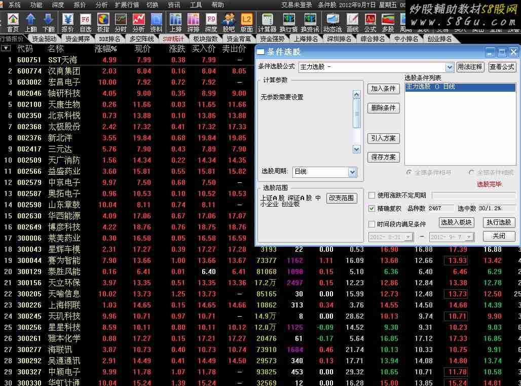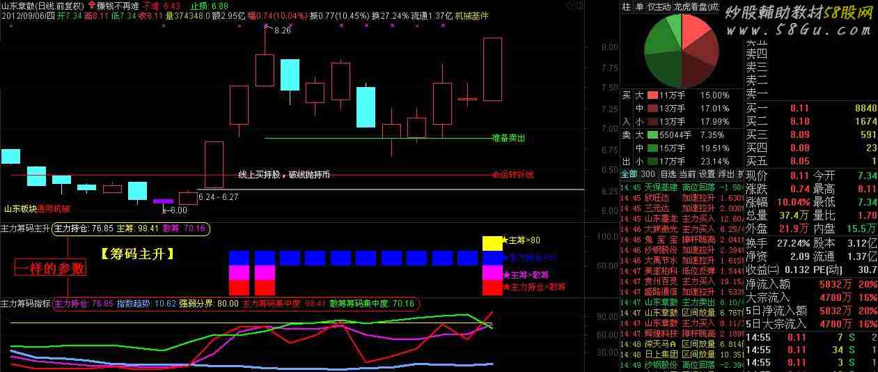 主力筹码指标 =【筹码主升】 说明:昨天宝钢主力老师说;“指标区很多转发的老指标,转发无可厚非,但请注明出处和作者。 不知道作者的也请标明为转发,东西老不要紧,但无任何说明的窃取就不好了。” 指标区高度自治,发神马都无所谓了,淡定! 老东西,通达信解密指标-(主力筹码..散户筹码...锁仓筹码)主力动向一目了然。 主力持仓:EMA(100*(CLOSE-LLV(LOW,34))/(HHV(HIGH,34)-LLV(LOW,34)),3), colorff00ff,linethick2; 指数趋势: EMA(100*(INDEXC-LLV(INDEXL,34))/(HHV(INDEXH,34)-LLV(INDEXL,34)),3),COLORFFAA66,LINETHICK3; 强弱分界: 80,coloryellow; 主力筹码集中度:WINNER(C)*100 ,COLORRED,linethick2; 散筹筹码集中度:(WINNER(C*1.1)-WINNER(C*0.9))*100,colorgreen,linethick2; 主力持仓上穿散户筹码,主升浪买进,一路持有.十次八次成功,配合均线.主筹达到90%散筹方向向下,说明主力已高度控盘筹码大部分锁定,等待主升浪。  |