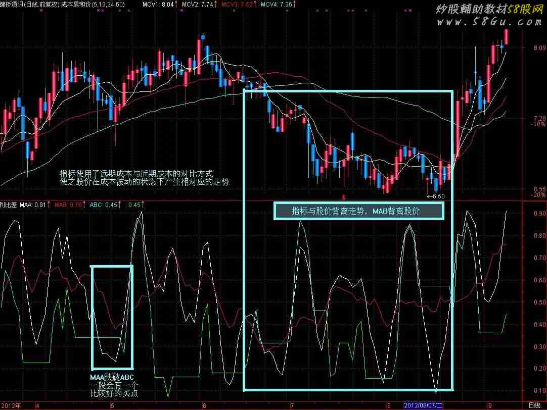 本指标系成本的远近关系体现股价的涨跌。指标具体使用方法简单地写在贴图之上。具体使用细节请各位使用者仔细参研。指标比较隐晦,还有很大的开发空间,可以继续优化本指标。论坛上高手如云。相信会有更好的优化指标出现。好了,废话不说。发指标。 源码如下: {参数:N:2 100 5;M:2 100 13;参数可调,使用中调整到最佳后使用} A:=LWINNER(5,C); B:=PWINNER(10,C); MAA:MA(A,N),COLORWHITE; MAB:MA(A,M),COLORRED; ABC:SQRT((MAA-MAB)/MAB),COLORCYAN; IF(ABC<MAB,ABC,DRAWNULL),COLORGREEN;