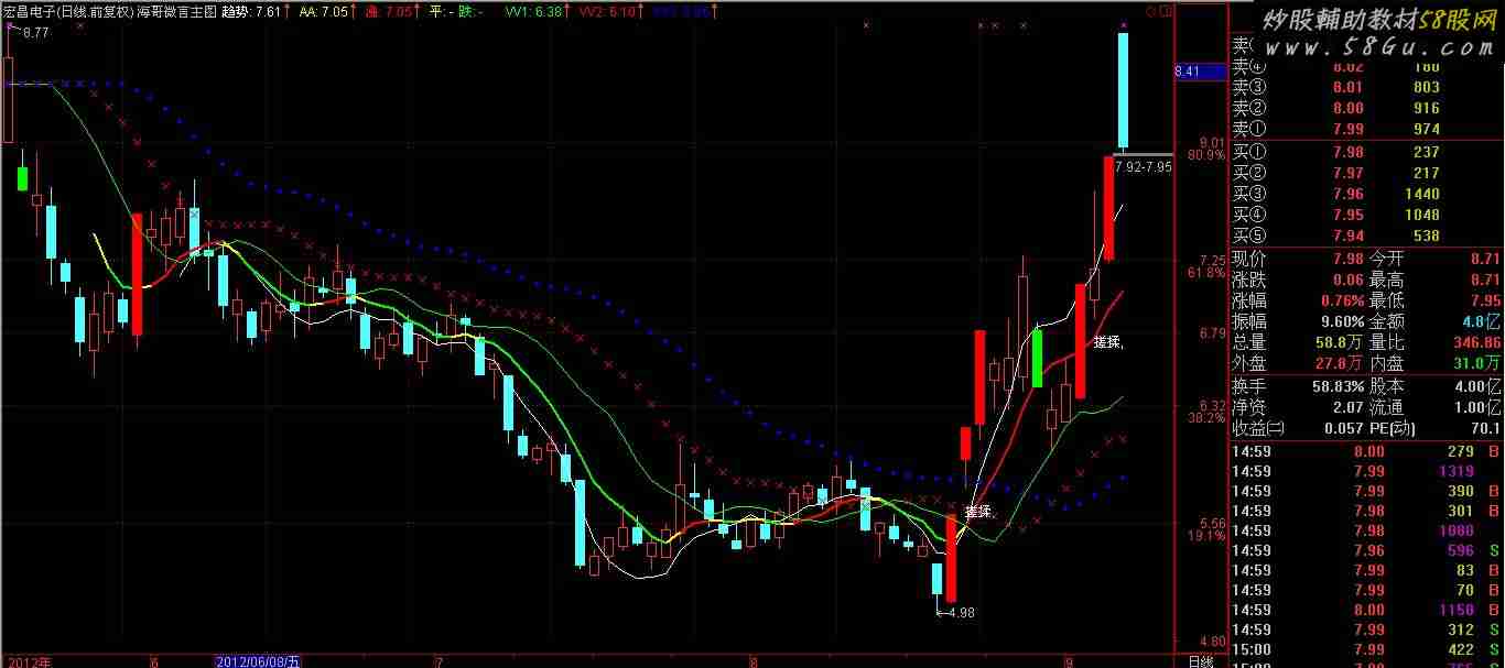 趋势:FORCAST(C,13),COLORFFFFFF,LINETHICK1; AA:MA(C,7),COLOR00FFFF,LINETHICK2; 涨:IF(MA(CLOSE,7)>REF(MA(CLOSE,7),1),MA(CLOSE,7),DRAWNULL),COLORRED,LINETHICK2; 平:IF(MA(CLOSE,7)=REF(MA(CLOSE,7),1),MA(CLOSE,7),DRAWNULL),COLOR00FFFF,LINETHICK3; 跌:IF(MA(CLOSE,7)<REF(MA(CLOSE,7),1),MA(CLOSE,7),DRAWNULL),COLORGREEN,LINETHICK2; C3:=REF(C,1); 涨停:=IF((C-C3)*100/C3>=(10-0.01*100/C3),1,0); STICKLINE(涨停,OPEN,CLOSE,2,0),COLORRED; 跌停:=IF((C3-C)*100/C3>=(10-0.01*100/C3),1,0); STICKLINE(跌停,OPEN,CLOSE,2,0),COLORGREEN; 乖离线:=((C-REF(COST(90),1))/20+250)*1.20; W1:=C=HHV(C,20); W2:=BARSLAST(W1); W3:=IF(W2>0,REF(C,W2),REF(C,W2)); W4:=CROSS(C,REF(W3,1)); 突破盘整:=W4 AND COUNT(W4,5)=1; DRAWTEXT(突破盘整,L-0.10,1); VAR1:=(H+L)/2; VV1:REF(SMA(VAR1,5,1),3),COLORGREEN,LINETHICK1; VV2:REF(SMA(VAR1,8,1),5),COLORRED,LINETHICK1,CROSSDOT; VV3:REF(SMA(VAR1,13,1),8),COLORBLUE,LINETHICK4,POINTDOT; 量比1:=V/REF(V,1); XG:=量比1>1.5AND V>MA(V,135); MA1:=MA(C,6),COLORRED; A17:=C-MA1; A1:=CROSS(A17,0); A:=XG AND A1; DRAWTEXT(A,L-0.04,'★牛股'),LINETHICK2,COLOR00FF00; 使用说明: 该主图对趋势的判断非常精准,通过(周线、日线和60分钟线)并结合其它副图指标很好把握,主图各点位已经说明了很详细了。我想说的是,同一个指标在不同人的手上会产生不同的解读,世界上没有完美的指标,只有适合的指标!最后,祝大家投资顺利!分享指标!分享快乐!