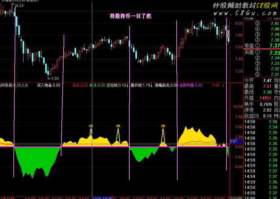 量价线:(((CLOSE - MA(CLOSE,21)) / MA(CLOSE,21)) * 100),COLORFFFFFF; VAR2E:=IF((FILTER(((量价线 > 0) AND (量价线 < 3)),5) = 1),12,0); 涨幅前兆:IF((FILTER(((((庄拉线 > 0) AND (庄拉线 < 0.5)) AND VAR2E) AND (VAR1C < 3)),10) = 1),10,0),COLORFFFFFF; 选股利器:IF((FILTER((((((((VAR2E > 0) AND (VAR1C < 2)) AND (庄拉线 > 0)) AND (庄拉线 < 1)) AND (黑码线 > 0)) AND (黑码线 < 1.5)) AND (VAR2E > 0)),5) = 1),10,0),COLORFF00FF; DRAWICON((买点 > 0),10,1); DRAWICON((卖点 > 0),10,2); DRAWICON((涨幅前兆 > 0),10,1); DRAWICON((选股利器 > 0),5,1); DRAWBAND(量价线,RGB(255,221,0),0,RGB(0,200,0)); IF(黑码线/2>=45,45,黑码线/2),COLORRED; DRAWICON(ISLASTBAR=1AND CROSS(量价线,0),0,11); 拉升开始:(5 * (((((((庄拉线 > 0.1) AND (COUNT((庄拉线 > 0.1),2) = 1)) AND (CLOSE >= OPEN)) AND (VOL > REF(VOL,1))) AND ((VOL / CAPITAL) > 0.003)) AND (量价线 > 1)) AND (量价线 > 黑码线))),LINETHICK2,COLOR00FFFF; DRAWICON((拉升开始 > 0),5,10); 量价主升浪:(8 * FILTER((CROSS(量价线,黑码线) AND (庄拉线 > 0.5)),7)),LINETHICK3,COLORFF00FF; DRAWICON((量价主升浪 > 0),8,8); 庄拉主升浪:(11 * ((CROSS(庄拉线,黑码线) AND (黑码线 > 0)) AND (量价线 > 0))),LINETHICK3,COLORFF00FF; DRAWICON((庄拉主升浪 > 0),11,8);