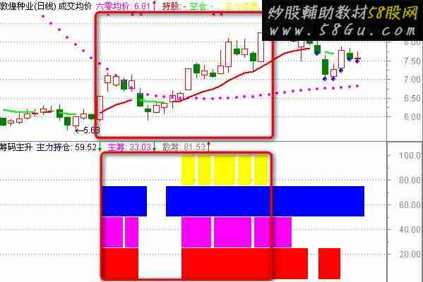 主力持仓:EMA(100*(CLOSE-LLV(LOW,34))/(HHV(HIGH,34)-LLV(LOW,34)),3),NODRAW; 主筹:WINNER(C)*100,NODRAW; 散筹:(WINNER(C*1.1)-WINNER(C*0.9))*100,NODRAW; STICKLINE(主力持仓>散筹,0,25,6,0),COLORRED; STICKLINE(主筹>散筹,26,50,6,0),COLORMAGENTA; STICKLINE(主力持仓>50,51,75,6,0),COLORBLUE; STICKLINE(主筹>80 AND 散筹<REF(散筹,1),76,100,6,0),COLORYELLOW;