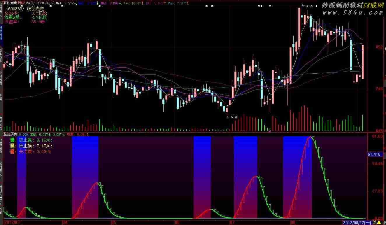 现在我发一个监控买卖的公式.公式好不好用.只能看这个公式与历史的买卖点符合不符合.只要公式出现的买卖点和过去相符合.那它就是个好公式.可用的公式.当然没有人会知道未来这个公式显示的买卖点还能不能符合股价的变化.目前还没有可以准确预测未来的公式. 所以我们只好用能够准确演绎历史的公式.还有就是公式的买卖点肯定落后与转折点.就是不可以落后的太久.能提前的表示出买卖的位置当然更好.那就先看看源码:--------