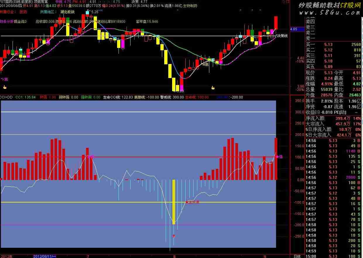 DRAWBAND(350,RGB(100,120,180),-300,RGB(100,120,180)); CC1:CCI(25),COLORSTICK,COLOR40FF00; DRAWICON(CROSS(200,CCI),250,2); DRAWICON( CROSS(CCI,-200),-250,1); 转强:CCI>0,COLOR0000D5,NODRAW; STICKLINE(CCI>0,0,CCI,2,0),COLOR0000D5; 弱转强:CROSS(CCI,-200) AND CCI>REF(CCI,1),COLOR00DFDF,NODRAW; STICKLINE(CROSS(CCI,-200) AND CCI>REF(CCI,1),CCI,0,2,0),COLOR00DFDF; 强转弱:CROSS(200,CCI) AND CCI<REF(CCI,1),COLOR00CA00,NODRAW; STICKLINE(CROSS(200,CCI) AND CCI<REF(CCI,1),0,CCI,2,0),COLOR00CA00; 生命CCI线:CCI(84),COLORWHITE; 底部线:-100.00,COLORYELLOW,LINETHICK2; 警戒线:300.00,COLORWHITE,LINETHICK2; 生命线:100.00,COLORRED,LINETHICK2; DRAWTEXT(CROSS(生命CCI线,底部线),底部线,'★主升浪')COLORRED; DRAWTEXT(CROSS(生命CCI线,警戒线),警戒线,'★警惕')COLORRED; DRAWTEXT(CROSS(生命CCI线,生命线),生命线,'★强')COLORMAGENTA; 200; -200; |