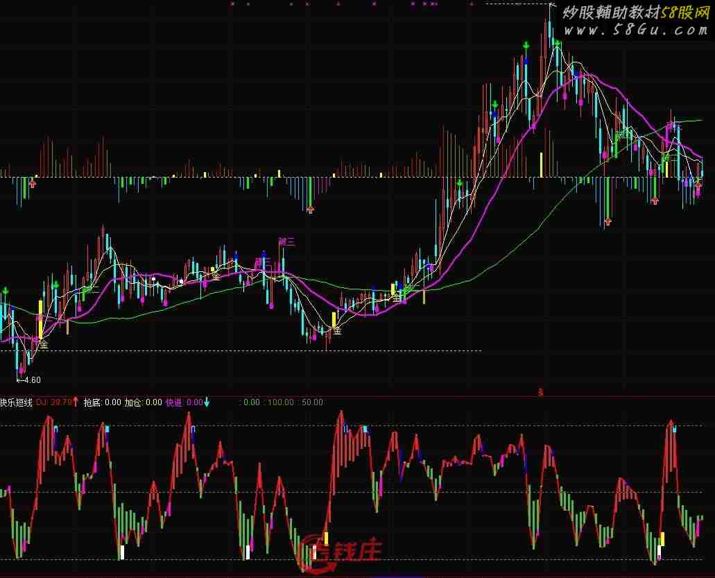 K:="KDJ.K"; J:="KDJ.J"; DK:=K-REF(K,1)/REF(K,1),COLORYELLOW; DJ:J-REF(J,1)/REF(J,1),COLORRED,LINETHICK2; MDJ:=MA(DJ,3),COLORLICYAN; 抢底:CROSS(DJ,0),COLORWHITE,NODRAW; 加仓:CROSS(DK,19),COLORYELLOW,NODRAW; 快进:CROSS(DJ,MDJ)AND REF(DJ<70,1),COLORMAGENTA,NODRAW; STICKLINE(DJ>DK,DJ,DK,1,0),COLOR3333CC; STICKLINE(DJ<DK,DJ,DK,1,0),COLORLIGREEN; STICKLINE(抢底=1,0,10,2,0),COLORWHITE; STICKLINE(快进=1,DJ,MDJ,1,0),COLORMAGENTA; STICKLINE(加仓=1,20,10,2,0),COLORYELLOW; STICKLINE(CROSS(100,DJ),100,95,2,0),COLORCYAN; STICKLINE(DJ>50 AND CROSS(MDJ,DJ),DJ,MDJ,1,1),COLORBLUE; 0,COLORLIGREEN,DOTLINE;100,COLORBROWN,DOTLINE;50,COLORGRAY,DOTLINE;