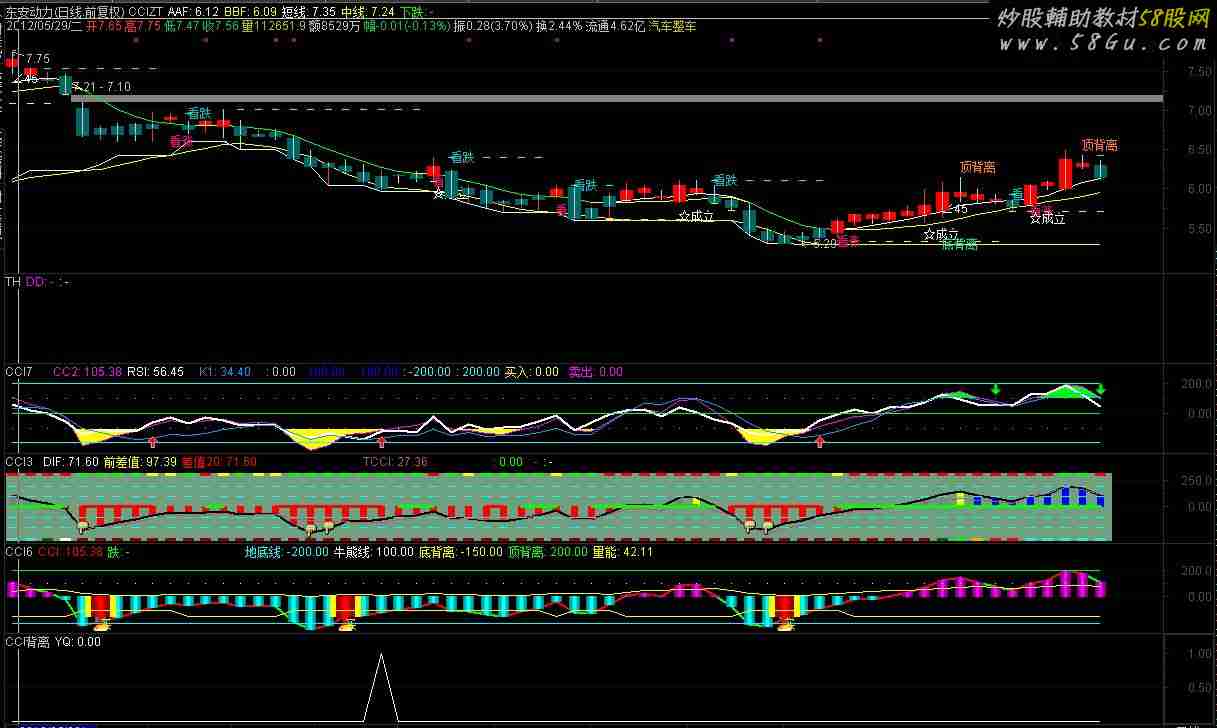 AAF:LLV(LOW,34),LINETHICK1,COLORFFFFCC;BBF:MA(AAF,4),LINETHICK1,COLORYELLOW; TYP := (HIGH + LOW + CLOSE)/3; CCI1:=(TYP-MA(TYP,6))/(0.015*AVEDEV(TYP,5)); 差值1:=ABS(REF(CCI1,1)-CCI1),LINETHICK0; CCI2:=(TYP-MA(TYP,10))/(0.015*AVEDEV(TYP,10)); 差值2:=ABS(REF(CCI2,1)-CCI2),LINETHICK0; CCI3:=(TYP-MA(TYP,20))/(0.015*AVEDEV(TYP,20)); 差值3:=ABS(REF(CCI3,1)-CCI3),LINETHICK0; CCI4:=(TYP-MA(TYP,30))/(0.015*AVEDEV(TYP,30)); 差值4:=ABS(REF(CCI4,1)-CCI4),LINETHICK0; CCI5:=(TYP-MA(TYP,60))/(0.015*AVEDEV(TYP,60)); 差值5:=ABS(REF(CCI5,1)-CCI5),LINETHICK0; CCI:=CCI1+CCI2+CCI3+CCI4+CCI5; AAA:=(3*C+H+L+O)/6; VAR1:=(8*AAA+7*REF(AAA,1)+6*REF(AAA,2)+5*REF(AAA,3) +4*REF(AAA,4)+3*REF(AAA,5)+2*REF(AAA,6)+REF(AAA,8))/36; VAR2:=(HHV(VAR1,5)+HHV(VAR1,10)+HHV(VAR1,20))/3; VAR3:=(LLV(VAR1,5)+LLV(VAR1,10)+LLV(VAR1,20))/3; VAR4:=(HHV(VAR2,5)+HHV(VAR2,10)+HHV(VAR2,20))/3; VAR5:=(LLV(VAR3,5)+LLV(VAR3,10)+LLV(VAR3,20))/3; VAR6:=(LLV(VAR1,2)+LLV(VAR1,4)+LLV(VAR1,6))/3; 短线:VAR1,COLORWHITE; 中线:VAR6,COLORYELLOW; 下跌:IF(VAR1=VAR6,VAR6, DRAWNULL),COLORGREEN; TJ1:= CCI1>差值4; 立桩量:=FILTER(TJ1,0),NODRAW; TJ2:=IF(BARSLAST(立桩量)=1 ,1,0); STICKLINE(立桩量 !=1,REF(HIGH,BARSLAST(立桩量)), REF(HIGH,BARSLAST(立桩量)),1,1),COLORCYAN; {STICKLINE(立桩量 !=1,REF(LOW,BARSLAST(立桩量)), REF(LOW,BARSLAST(立桩量)),1,1),COLORCYAN;} 成立1:=TJ2=1; 条件成立1:=FILTER(成立1,5); DRAWTEXT(条件成立1, REF(HIGH,BARSLAST(立桩量)),'看跌'),COLORLIBLUE; TJ11:= CCI1<-差值4 ; 立桩量2:=FILTER(TJ11,0),NODRAW; TJ22:=IF(BARSLAST(立桩量2)=1 AND CLOSE>REF(HIGH,1),1,0); 突破2:=TJ22=1; {STICKLINE(CLOSE AND 下跌!= VAR6,REF(HIGH,BARSLAST(立桩量2)), REF(HIGH,BARSLAST(立桩量2)),1,1),COLORYELLOW;} STICKLINE(CLOSE AND 下跌!= VAR6,REF(LOW,BARSLAST(立桩量2)), REF(LOW,BARSLAST(立桩量2)),1,1),COLORYELLOW; TJ:=IF(BARSLAST(立桩量2)=1 AND CLOSE>REF(LOW,1),1,0); 成立2:=TJ=1; 条件成立2:=FILTER(成立2,5); DRAWTEXT(条件成立2,REF(LOW,BARSLAST(立桩量2)),'看涨'),COLORLIMAGENTA; TJ111:=ABS(CCI1)>CCI AND ABS( 差值1)> ABS(差值5); 立桩量3:=FILTER(TJ111,3); TJ3:=IF(BARSLAST(立桩量3)=1 AND CLOSE>REF(LOW,1),1,IF(BARSLAST(立桩量3)=2 AND CLOSE>REF(LOW,2),1,IF(BARSLAST(立桩量3)=3 AND CLOSE>REF(LOW,3),1,0))); 成立:=TJ3=1; 条件成立:=FILTER(成立,5); DRAWTEXT(条件成立 AND 下跌!= VAR6,L*0.97,'☆成立'); LC:=REF(CLOSE,1); RSI:=((SMA(MAX((CLOSE - LC),0),3,1) / SMA(ABS((CLOSE - LC)),3,1)) * 100); FF:=EMA(CLOSE,3); MA15:=EMA(CLOSE,21); DRAWTEXT(CROSS(FF,MA15),BBF,'底背离'),COLORA6E500; DRAWTEXT(CROSS(88,RSI),(HIGH * 1.02),'顶背离'),COLOR1880FF; X1:=(C+L+H)/3; BB13:=ATAN(EMA(X1,13)-REF(EMA(X1,13),1))*3.1416*10; EMA8:=EMA(C,8); DRAWTEXT(FILTER(BB13>1 AND EMA(X1,13)>REF(EMA(X1,8),1),10), EMA8,'∠45'),COLORWHITE; STICKLINE(1,C,O,2.8,0),COLOR666600; STICKLINE(立桩量,C,O,2.8,0),COLOR0000FF; STICKLINE(1,C,O,0,0),COLORCCCCCC; |
