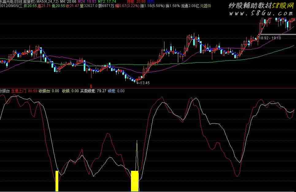 出现黄色箭头就是买入的信号。准确率高不高,还需要大家去验证{收银台}QVAR2:=IF((HIGH+LOW<=REF(HIGH,1)+REF(LOW,1)),0,MAX(ABS(HIGH-REF(HIGH,1)),ABS(LOW-REF(LOW,1))));QVAR3:=IF((HIGH+LOW>=REF(HIGH,1)+REF(LOW,1)),0,MAX(ABS(HIGH-REF(HIGH,1)),ABS(LOW-REF(LOW,1))));QVAR4:=(SUM(QVAR2,13))/(SUM(QVAR2,13)+SUM(QVAR3,13));QVAR5:=(SUM(QVAR3,13))/(SUM(QVAR3,13)+SUM(QVAR2,13));QVAR9:=100-(3)*(SMA(((CLOSE-LLV(LOW,75))/(HHV(HIGH,75)-LLV(LOW,75)))*(100),20,1))+(2)*(SMA(SMA(((CLOSE-LLV(LOW,75))/(HHV(HIGH,75)-LLV(LOW,75)))*(100),20,1),15,1));QVARA:=100-(3)*(SMA(((OPEN-LLV(LOW,75))/(HHV(HIGH,75)-LLV(LOW,75)))*(100),20,1))+(2)*(SMA(SMA(((OPEN-LLV(LOW,75))/(HHV(HIGH,75)-LLV(LOW,75)))*(100),20,1),15,1));QVARB:=(QVAR9<REF(QVARA,1)) AND (VOL>REF(VOL,1)) AND (CLOSE>REF(CLOSE,1));QVAR1A:=((HHV(HIGH,21)-CLOSE)/(HHV(HIGH,21)-LLV(LOW,21)))*(100)-10;QVAR1B:=((CLOSE-LLV(LOW,21))/(HHV(HIGH,21)-LLV(LOW,21)))*(100);QVAR1C:=SMA(QVAR1B,13,8);QVAR1D:=SMA(QVAR1A,21,8);生意上门:SMA(QVAR1C,13,8),COLORRED;收银台:(生意上门-QVAR1D<(-65))*20,COLORYELLOW,POINTDOT;AAS:=FILTER((COUNT((生意上门-QVAR1D<(-65)),3)=3),34);STICKLINE(生意上门-QVAR1D<(-65),20,0,4,0),COLORYELLOW;收银:IF(AAS,50,0),COLORYELLOW;QVAR1E:=(CLOSE+OPEN+HIGH+LOW)/(4);AA:=QVARB AND (COUNT(QVARB,1)=1) AND (生意上门<80);VAR1:=IF(((EMA(CLOSE,5))/(EMA(EMA(CLOSE,9),16))<=0.85000002) AND ((CLOSE)/(REF(CLOSE,1))>0.90499997) AND ((CLOSE)/(REF(CLOSE,1))<1.05) AND (((VOL)/(CAPITAL))*(100)<5),50,0);买卖顺意:MA((((-100))*(HHV(HIGH,34)-CLOSE))/(HHV(HIGH,34)-LLV(LOW,34))+100,5),COLORWHITE;VAR3:=(((-100))*(HHV(HIGH,50)-CLOSE))/(HHV(HIGH,50)-LLV(LOW,50))+100;VAR4:=(((-100))*(HHV(HIGH,70)-CLOSE))/(HHV(HIGH,70)-LLV(LOW,70))+100;VAR5:=(((CLOSE-MA(CLOSE,34))/(MA(CLOSE,34)))*(100)+10)*(5);VAR6:=(((CLOSE-MA(CLOSE,50))/(MA(CLOSE,50)))*(100)+10)*(5);VAR7:=(((CLOSE-MA(CLOSE,70))/(MA(CLOSE,70)))*(100)+10)*(5);VAR8:=(买卖顺意+VAR3+VAR4+VAR5+VAR6+VAR7)/(6);VAR21:=MA(CLOSE,80)-(MA(CLOSE,13))/(3);VAR22:=MA((CLOSE-VAR21)/(VAR21),1);VAR23:=(EMA(VAR22,12))*(0.69999998);VAR24:=EMA(VAR22,3);VAR25:=IF((LLV(VAR24-VAR23,12)>0),0,(-30));VAR26:=FILTER((COUNT((VAR25<(-20)),3)=3),34);顺意:IF(VAR26,50,0),COLORFFCC66; |
