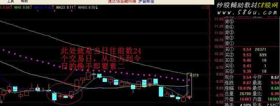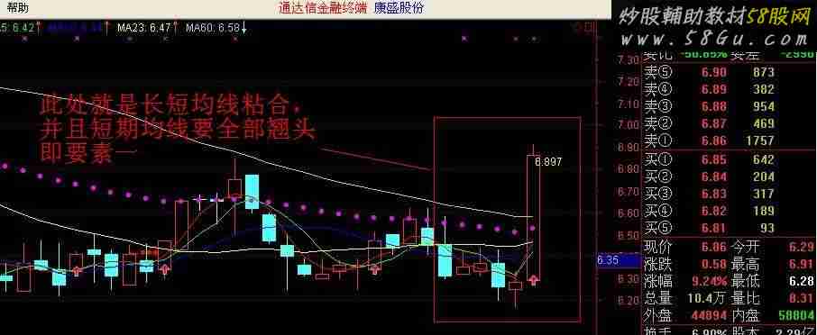 均线粘合指标盛行多年,具体用法有很多版本,最近本人结合均线粘合,量比,换手 经过1个多月的精心观察及验证总结了一下几个要素,发出其中两个要素供大家参考,其他要素还在验证摸索中,机会成熟时发给大家:要素一:短期均线(3,5,10,23)粘合 长期均线(5,10,23,44(也就是公认的牛熊线,EMA(C,40)就是40日线的指数移动平均也就是44日线))粘合 以 60日线为主要压力位与支撑位要素二:24日换手集合 另外两个要素大体意思是:换手与分时量比 (还在摸索中....)下面是截图及源码