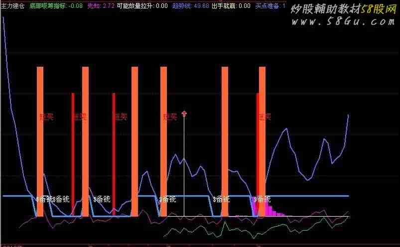 VAR2:=REF(LOW,1);VAR3:=SMA(ABS(LOW-VAR2),3,1)/SMA(MAX(LOW-VAR2,0),3,1)*100;VAR4:=EMA(IF(CLOSE*1.3,VAR3*10,VAR3/10),3);VAR5:=LLV(LOW,30);VAR6:=HHV(VAR4,30);VAR7:=IF(MA(CLOSE,58),1,0);VAR8:=EMA(IF(LOW<=VAR5,(VAR4+VAR6*2)/2,0),3)/618*VAR7;VAR9:=IF(VAR8>100,100,VAR8);STICKLINE(VAR9>-150,0,VAR9,3,0) , COLORFF00FF;底部吸筹指标: (CLOSE-MA(CLOSE,40))/MA(CLOSE,40)*100 , COLOR00FF00;STICKLINE(CROSS(底部吸筹指标,-24),100,0,6,0), COLORFFFFFF;先知: (CLOSE-MA(CLOSE,5))/MA(CLOSE,5)*100, COLORFF00FF;可能放量拉升: IF(CROSS(底部吸筹指标,-24),1,0), COLORFFFFFF;短线获利:STICKLINE(REF("KDJ.J",1)<0 AND "KDJ.J">0,60,0,2,0),COLOR0000FF;VARK1:=(CLOSE-LLV(LOW,27))/(HHV(HIGH,27)-LLV(LOW,27))*100;VARK2:=REVERSE(VARK1);VARK3:=SMA(VARK1,3,1);波段王:=SMA(VARK3,3,1) ;波段鬼:=SMA(波段王,2.5,1);趋势线: 3*SMA((CLOSE-LLV(LOW,27))/(HHV(HIGH,27)-LLV(LOW,27))*100,5,1)-2*SMA(SMA((CLOSE-LLV(LOW,27))/(HHV(HIGH,27)-LLV(LOW,27))*100,5,1),3,1), COLORFF6666,LINETHICK2;RSV9:=(CLOSE-LLV(LOW,9))/(HHV(HIGH,9)-LLV(LOW,9))*100; K1:=SMA(RSV9,3,1);DK1:=K1-REF(K1,1);出手就赢:IF(DK1>7 AND REF(DK1,1)<0 AND (DK1-REF(DK1,1))>9,50,0), STICK,COLORYELLOW;DRAWICON(出手就赢>0,50 ,1);买点准备:IF(趋势线<=10,0,10), COLORFF9933,LINETHICK3;STICKLINE( CROSS(趋势线,10),0,73,6,0), COLOR3366FF;DRAWTEXT(IF(CROSS(趋势线,10),100,0),68,'抄底'),COLORWHITE ;DRAWTEXT(IF(CROSS(10,趋势线),1,0), 10,'$备钱');DRAWTEXT(REF("KDJ.J",1)<0 AND "KDJ.J">0,50,'短买'),COLORRED ;DRAWTEXT(CROSS(底部吸筹指标,-24),80,'抄底'),COLORWHITE ; |