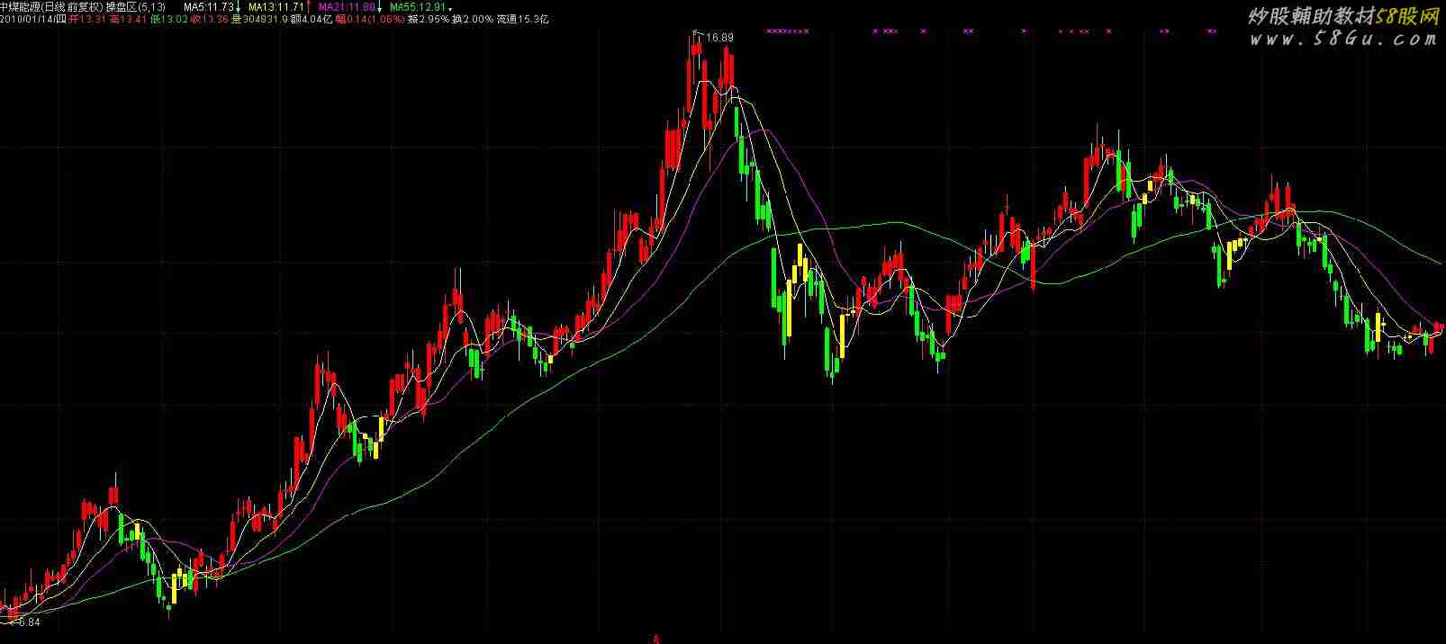 STICKLINE(CLOSE>MA(CLOSE,N),O,C,2,0) COLORRED; STICKLINE(CLOSE<MA(CLOSE,N),O,C,2,0)COLORGREEN; STICKLINE(CLOSE>MA(CLOSE,M) AND CLOSE<MA(CLOSE,N),O,C,2,0)COLORYELLOW; MA5:MA(C,5); MA13:MA(C,13); MA21:MA(C,21); MA55:MA(C,55); |
