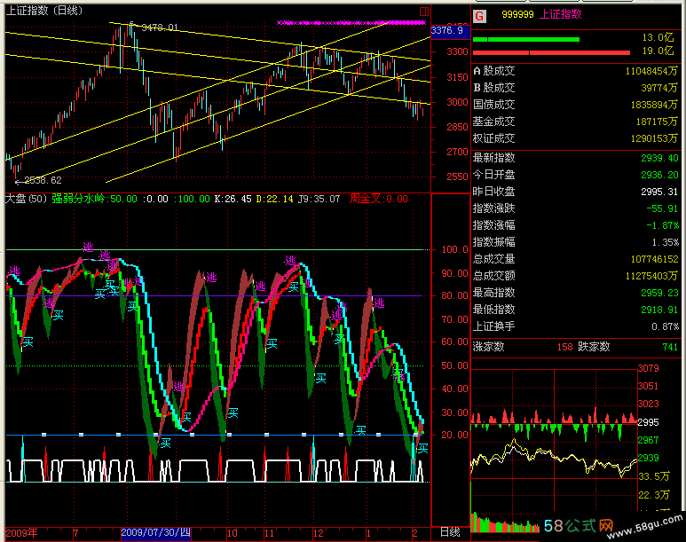 {心情好} 强弱分水岭:50,POINTDOT,COLORGREEN; 0,COLORRED,LINETHICK0; 100,COLORGREEN,LINETHICK1; 长J89:="KDJ.J"(89,3,3),COLORFFFF00,LINETHICK; 中J27:="KDJ.J"(27,3,3),COLOR4080FF,LINETHICK; 短J3:="KDJ.J"(3,3,3),COLORAAAAAA,LINETHICK; RSV:=(CLOSE-LLV(LOW,9))/(HHV(HIGH,9)-LLV(LOW,9))*100; K:SMA(RSV,3,1),COLORFFFFFF,LINETHICK1; D:SMA(K,3,1)COLORYELLOW,LINETHICK1; J9:3*K-2*D COLORFF00FF,LINETHICK0; DRAWBAND(K,RGB(155,50,50),D,RGB(0,100,10)); VAR0004:="KDJ.K#WEEK"(9,3,3); VAR0005:="KDJ.D#WEEK"(9,3,3); VAR0006:="KDJ.K#MONTH"(9,3,3); VAR0007:="KDJ.D#MONTH"(9,3,3); 周金叉:IF(CROSS(VAR0004,VAR0005),15,0)LINESTICK, COLOR0000FF; 月金叉:IF(CROSS(VAR0006,VAR0007),20,0)LINESTICK, COLOREEFF00; DRAWTEXT(周金叉,16,'周金叉'); DRAWTEXT(月金叉,20,'月金叉'); A1:="KDJ.J"(3,3,3); B1:="KDJ.J"(9,3,3); C1:="KDJ.J"(27,3,3); D1:="KDJ.J"(89,3,3); A2:=A1>REF(A1,1); B2:=B1>REF(B1,1); C2:=C1>REF(C1,1); D2:=D1>REF(D1,1);