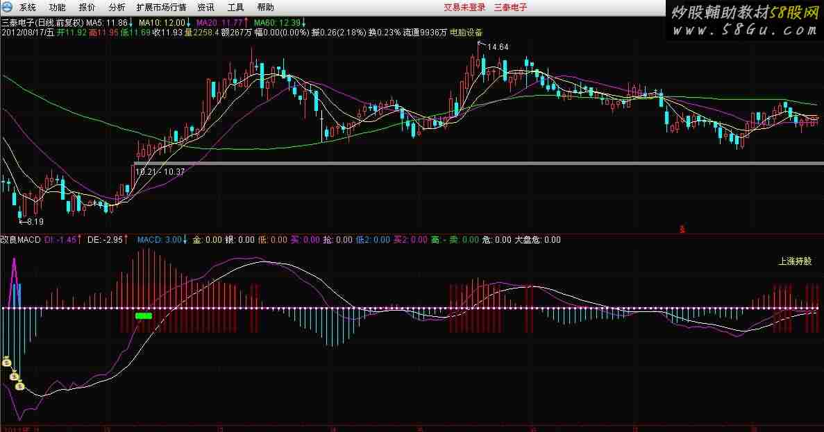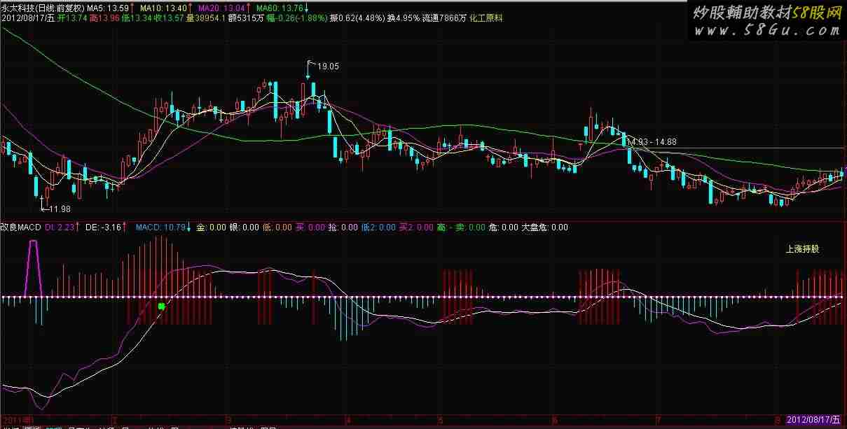 {改良MACD} LC:=REF(C,1); 预量:=IF(ISLASTBAR,V*240/FROMOPEN,V),NODRAW; 量比:=预量/MA(REF(V,1),5),NODRAW; JJ:=(L+H+C*2)/4; DI:(EMA(C,12)-EMA(C,26))/C*500,COLORFF00FF; DE:EMA(DI,9),LINETHICK1,COLORFFFFFF; STICKLINE(DI>REF(DI,1) AND DI>DE AND MA(C,20)>REF(MA(C,20),1),-15,15,1,0),COLOR000066; MACD:(DI-DE)*2,COLORSTICK,COLORFFAA00; 金:IF(((MACD<=-50 OR (MACD<=-30 AND MA(C,11)>REF(MA(C,11),1) AND MA(C,20)>REF(MA(C,20),1) AND MA(C,60)>REF(MA(C,60),1)) AND (H>LC OR C<LLV(LC,6)*0.98) AND C=LLV(C,10) AND (L=LLV(L,15) OR C<LLV(L,15)*1.015))) AND 预量<REF(V,1) AND 预量<MA(V,5) AND H<LLV(REF(L,1),2)* 1.06 AND C>LC*0.9014 AND H>LC AND C<L*1.025,48,0),LINETHICK2,COLOR00FFFF; 银:IF(LLV(MACD,8)<-40 AND (C=LLV(C,11) OR L=LLV(L,11)) AND DOWNNDAY(C,2) AND NDAY(O,C,2) AND 预量<REF(V,1) AND 预量<MA(V,5) AND C>LC*0.9015 AND H<REF(H,1) AND H<LLV(REF(L,1),2)*1.06 AND C<L*1.02,45,0),LINETHICK4,COLORFFFFFF,STICK; 低:IF(MACD<-26 AND HHV(DE,10)-DE>25 AND HHV(DI,250)<10 AND ((C=LLV(C,11) AND (L=LLV(L,15) OR C<LLV (L,15)*1.015)) OR (L<MA(C,5)*0.9 AND MA(C,5)/C>1.05)) AND H>LC AND C<MA(C,5)*0.96 AND H>LC AND C<L*1.025 AND H<LLV(REF(L,1),2)*1.06 AND C>LC*0.9014 AND 预量<REF(V,1),38,0),LINETHICK2,COLOR0099FF; 买:IF((LLV(DI,5)<-50) AND C<LLV(REF(L,1),10) AND H<LLV(REF(L,1),2)*1.06 AND C<L* 1.015 AND C>LC*0.9014 AND PERIOD=5 AND 预量<HHV(V,10),32,0),LINETHICK2,COLORFF00FF; 抢:IF(LLV(MACD,10)<-16.2 AND HHV(DI,250)<10 AND C<MA(C,10)*0.92 AND L<MA(C,5)*0.88 AND C<MA(C,5)*0.947 AND H>LC AND C=LLV(C,10) AND (L=LLV(L,10) OR C<LLV(L,10)*1.015) AND C<L*1.01 AND V<HHV (V,10) AND C>LC*0.901 AND H<LLV(REF(L,1),2)*1.06 AND H>LC AND C<L*1.025,30,0), LINETHICK2,COLORFF99FF; 低2:IF(((MACD<-35 AND C<LLV(REF(L,1),10) AND C<L*1.02 AND H<LLV(REF(L,1),2)*1.06) OR ((LLV(MACD,10)<-20 OR LLV(DE,10)<-30) AND C>400)) AND C=LLV(C,10) AND L=LLV(L,10), 15,0),LINETHICK3,STICK,COLORFFAA00; 买2:IF((HHV(REF(金,1),12)=10 AND C=LLV(C,10) AND (L=LLV(L,15) OR C<LLV(L,15)*1.015) AND H>LC AND C>LC*0.9014) AND C*1.025>H AND H>LC AND C<L*1.025 AND H<LLV(REF(L,1),2) *1.06,-MACD,0),LINETHICK2,COLORCC00FF; 高:IF(MACD>35 AND MACD>REF(MACD,1) AND C<LC*1.0985,-5,DRAWNULL),LINETHICK6,CROSSDOT,COLOR00FF00; 卖:IF(HHV(MACD,4)>=42 AND (C=HHV(C,10) AND ((H=HHV(H,10) OR H>LC*1.07) OR C<MA(C,20))) AND (L<LC OR C>MA(C,5)*1.15) AND C<LC*1.0985,-10,0),STICK,LINETHICK3,COLOR00CC00; 危:IF(HHV(MACD,7)>42 AND C=HHV(C,10) AND H=HHV(H,10) AND C<LC*1.0985 AND PERIOD=5,-10,0),LINETHICK3,STICK,COLORFFFFFF; 大盘危:IF(HHV(MACD,8)>15 AND C>400 AND C<LC*1.0985 AND C=HHV(C,10) AND H=HHV(H,10),-15, 0),COLORFFFFFF,LINETHICK4,STICK; DRAWICON(LLV(MACD,5)<-30 AND C>LC*0.9014 AND C<=O AND C=LLV(C,10) AND L=LLV (L,10),MACD,9); DRAWTEXT_FIX(ISLASTBAR AND DI>REF(DI,1) AND DI>DE AND C>MA(C,20),0.97,0.05,1,'上涨持股'),COLORYELLOW;  |