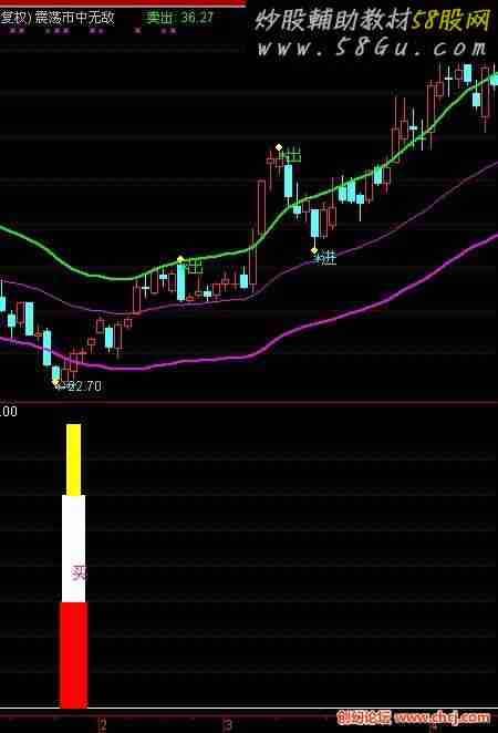 RSV:=(CLOSE-LLV(LOW,9))/(HHV(HIGH,9)-LLV(LOW,9))*100; K:=SMA(RSV,3,1); D:=SMA(K,3,1); J:=3*K-2*D; J1:=REVERSE(J); AA:=REF(MA(C,1),10)>REF(MA(C,60),10);买点:CROSS(J,J1) AND AA; STICKLINE(买点,0,30,12,0),COLOR0000FF; STICKLINE(买点,30,60,10,0),COLORWHITE; STICKLINE(买点,60,80,6,0),COLORYELLOW; DRAWTEXT(买点,40,'买'),COLORFF00FF;