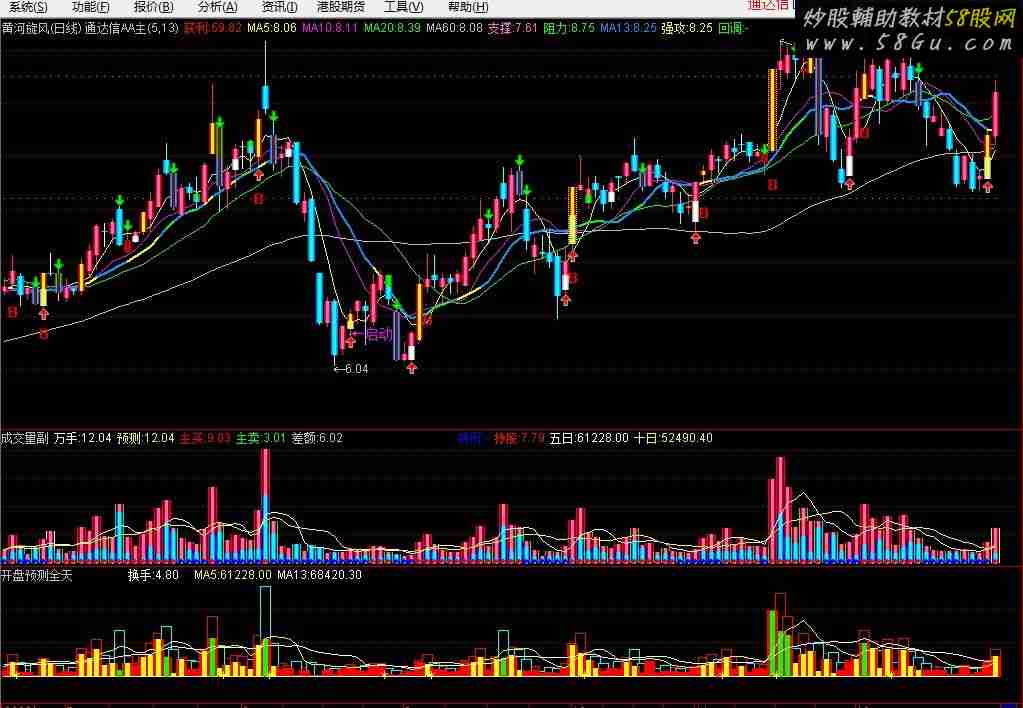 STICKLINE(HOUR>=9AND HOUR<10 ,0, V/((TIME-93000)/100)*240,4.5,1),COLORWHITE; STICKLINE(HOUR>=10 AND HOUR<11 ,0, V/((TIME-100000)/100+30)*240,4.5,1),COLORWHITE; STICKLINE(HOUR>=11 AND HOUR<12 ,0, V/((TIME-110000)/100+90)*240,4.5,1),COLORWHITE; STICKLINE(HOUR>=13 AND HOUR<=14,0, V/((TIME-130000)/100+120)*240,4.5,1),COLORWHITE; STICKLINE(HOUR>=14 AND HOUR<=15,0, V/((TIME-140000)/100+180)*240,4.5,1),COLORWHITE; VAR1:=VOL/((HIGH-LOW)*2-ABS(CLOSE-OPEN)); 主动买盘:=IF(CLOSE>OPEN,VAR1*(HIGH-LOW),IF(CLOSE<OPEN,VAR1*((HIGH-OPEN)+(CLOSE-LOW)),VOL/2)); 主动卖盘:=IF(CLOSE>OPEN,0-VAR1*((HIGH-CLOSE)+(OPEN-LOW)),IF(CLOSE<OPEN,0-VAR1*(HIGH-LOW),0-VOL/2)); STICKLINE(C>O,0,VOL,4.5,1),COLORRED; STICKLINE(C<O ,0,VOL,4.5,1),COLORFFFF00; STICKLINE(C=O AND C<REF(C,1),0,VOL,4.5,1),COLORFFFF00; STICKLINE(C=O AND C>REF(C,1),0,VOL,4.5,1),COLORRED; STICKLINE(主动买盘>0,0,主动买盘,4.5,0),COLORRED; 换手: VOL/CAPITAL*100; STICKLINE(换手>=3 AND 换手<8,0, 主动买盘,2,0),COLORYELLOW; STICKLINE(换手>=8,0, 主动买盘, 2,0) ,COLORGREEN; MA5:MA(VOL,5),COLORYELLOW; MA13:MA(VOL,13),COLORWHITE; DRAWTEXT(CROSS(MA5,MA13),CROSS(MA5,MA13),'*'),COLORYELLOW; |