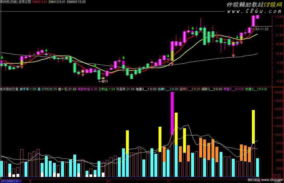 HS:=VOL/CAPITAL*100; TJ1:=HS<1;TJ2:=HS>1;TJ3:=HS>2;TJ4:=HS>3; TJ5:=HS>5;TJ6:=HS>8;TJ7:=HS>15;TJ8:=HS>25; 换手率:VOL/CAPITAL*100,NODRAW,COLORFFFF00; 量:VOL,VOLSTICK,COLORFFFF00; 盘=亿:FINANCE(7)/100000000,LINETHICK0,COLORWHITE; 每股收益:FINANCE(33),LINETHICK0,COLORYELLOW; 公积金:FINANCE(18),LINETHICK0,COLORWHITE; 市盈率:DYNAINFO(39),LINETHICK0,COLORWHITE; 地量0__1:0,COLORFFFFFF; 低靡1__2:0,COLORFFFF00; 温和2__3:0,COLOR208FFF; 活跃3__5:0,COLOR00FFFF; 带量5__8:0,COLORFF00FF; 放量8__15:0,COLOR00FF00; 巨量15__25:0,COLORFF5500; STICKLINE(TJ1,0,V*0.3,2.3,0),COLORFFFFFF; STICKLINE(TJ3,V,V*0.5,2.3,0),COLOR208FFF; STICKLINE(TJ4,V,V*0.5,2.3,0),COLOR00FFFF; STICKLINE(TJ5,V,V*0.5,2.3,0),COLORFF00FF; STICKLINE(TJ6,V,V*0.5,2.3,0),COLOR00FF00; STICKLINE(TJ7,V,V*0.5,2.3,0),COLORFF2900; STICKLINE(TJ8,V,V*0.5,2.3,0),COLORFF0000; 五:MA(VOL,5), COLORWHITE,LINETHICK1; 十:MA(VOL,10) ,COLOR00FFFF,LINETHICK1;