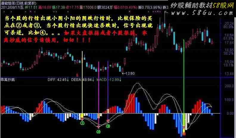 本指标以三日成交均价和十三日成交均价的乖离率入手,找出回调个股短线介入的低点位置,希望能给各位股友带来帮助和启发。 {乖离抄底}SRLJJ:=(REF(C,2)*REF(V,2)+REF(C,1)*REF(V,1)+C*V)/(V+REF(V,1)+REF(V,2));SSRGLL:=(SRLJJ-MA(SRLJJ,13))*100;QS1:=EMA(EMA(EMA(C,3)-REF(EMA(C,3),2),4),4);QS2:=EMA(EMA(EMA(C,7)-REF(EMA(C,7),2),5),5);MA5:=EMA(SSRGLL,5);MMA5:=EMA(MA5,5);MACA:=(MA5-MMA5)*2;D1:=MACA;ZD1:=REF(MACA,1);JX:=(HHV(H,10)-LLV(L,3))/HHV(H,10)*100>=8.09 AND (H-LLV(L,3))/LLV(L,3)*100<8.09 AND HHV(H,10)>HHV(H,5)*1.02;MACA下:=QS1>REF(QS1,1) AND JX;{DRAWICON(CROSS(QS2,REF(QS2,1))AND QS2<QS1,QS1,1);}STICKLINE(D1>ZD1 AND D1>0,0,D1,3.2,0),COLOR000055;STICKLINE(D1>ZD1 AND D1>0,0,D1,2.7,0),COLOR000077;STICKLINE(D1>ZD1 AND D1>0,0,D1,2.1,0),COLOR000099;STICKLINE(D1>ZD1 AND D1>0,0,D1,1.5,0),COLOR0000BB;STICKLINE(D1>ZD1 AND D1>0,0,D1,0.9,0),COLOR0000DD;STICKLINE(D1>ZD1 AND D1>0,0,D1,0.3,0),COLOR0000FF;STICKLINE(D1>ZD1 AND D1<0,0,D1,3.2,0),COLOR555555;STICKLINE(D1>ZD1 AND D1<0,0,D1,2.7,0),COLOR777777;STICKLINE(D1>ZD1 AND D1<0,0,D1,2.1,0),COLOR999999;STICKLINE(D1>ZD1 AND D1<0,0,D1,1.5,0),COLORBBBBBB;STICKLINE(D1>ZD1 AND D1<0,0,D1,0.9,0),COLORDDDDDD;STICKLINE(D1>ZD1 AND D1<0,0,D1,0.3,0),COLORFFFFFF;STICKLINE(D1<ZD1,0,D1,3.2,0),COLORB20000;STICKLINE(D1<ZD1,0,D1,2.7,0),COLOREC0000;STICKLINE(D1<ZD1,0,D1,2.1,0),COLORFF4600;STICKLINE(D1<ZD1,0,D1,1.5,0),COLORFF6300;STICKLINE(D1<ZD1,0,D1,0.9,0),COLORFF8B00;STICKLINE(D1<ZD1,0,D1,0.3,0),COLORFFAB00;STICKLINE(D1>=0 OR D1<=0,0,0,50,1),COLORWHITE;STICKLINE(FILTER(QS1>REF(QS1,1) AND JX,3),0,D1,2.5,0),COLORYELLOW;DRAWICON(FILTER(QS1>REF(QS1,1) AND JX,3),MA5,1);DIFF:MA5;DEEA:MMA5;MACD:MACA,NODRAW; |
