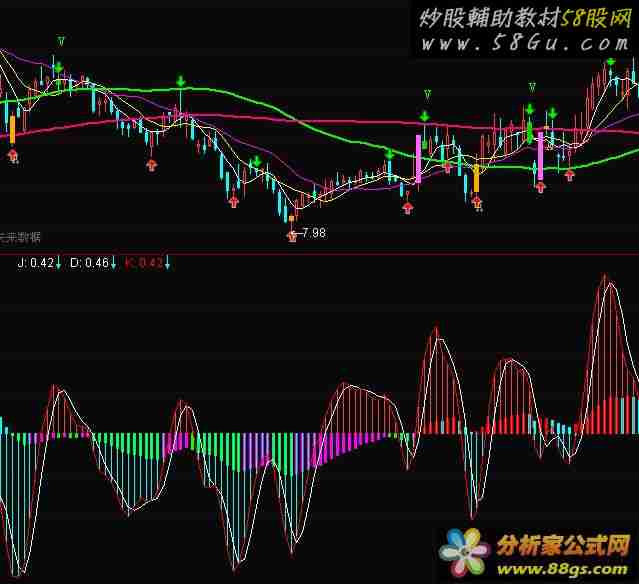 STICKLINE(MACD>0 AND MACD>=REF(MACD,1),0,MACD,1,0),COLOR0000FF; STICKLINE(MACD>0 AND MACD<REF(MACD,1),0,MACD,1,0),COLORFFFF00; STICKLINE(MACD<0 AND MACD>=REF(MACD,1),0,MACD,1,0),COLORFF00FF; STICKLINE(MACD<0 AND MACD<REF(MACD,1),0,MACD,1,0),COLOR00FF00; VAR1:=(2*CLOSE+HIGH+LOW)/4; VAR2:=EXPMA(EXPMA(EXPMA(VAR1,4),4),4); J: (VAR2-REF(VAR2,1))/REF(VAR2,1)*100, COLORSTICK; D: MA(J,3); K: MA(J,1)COLORRED; |