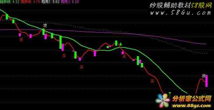 工作线:=MA(CLOSE,1); 趋势线:MA(CLOSE,18)COLORGREEN,LINETHICK2; 强势线:MA(CLOSE,3)COLORRED,LINETHICK2; TT2:=DMA((((HIGH + LOW) + (CLOSE * 2)) / 4.15),0.9); TT1:=REF(EMA(TT2,3),1); RSV:=(CLOSE-LLV(LOW,9))/(HHV(HIGH,9)-LLV(LOW,9))*100; K:=SMA(RSV,3,1); D:=SMA(K,3,1); J:=3*K-2*D; LC:=REF(CLOSE,1); RSI:=((SMA(MAX((CLOSE - LC),0),3,1) / SMA(ABS((CLOSE - LC)),3,1)) * 100); FF:=EMA(CLOSE,3); 稻壳1:EMA(CLOSE,144),POINTDOT,COLORWHITE; 稻壳2:EMA(C,318); AA1:=AMOUNT/VOL; BB1:=L<AA1*0.9; CC1:=(C-REF(C,1))/REF(C,1)*100>1.2; DD1:=L<MA(C,5)*0.921; EE1:=VOL<MA(V,5)*1.5; FF1:=BB1 AND CC1 AND DD1 AND EE1; F:=100*(C-REF(C,1))/REF(C,1); P1:=IF(C<REF(O,1) AND F<0,1,0); P2:=IF(C<REF(O,2) AND F<0,1,0); TT3:=P1=0 AND REF(P1,1)=1 AND P2=0 AND REF(P2,1)=1 ; TT4:=P1=1 AND REF(P1,1)=0 AND P2=1 AND REF(P2,1)=0 ; Z1:=MA(C,13); ZX:=REF(Z1,13/2+1); DRAWICON(CROSS(ZX,C),H*1.01,2); DRAWTEXT(CROSS(工作线,趋势线)AND J<55,LOW,'入')COLORWHITE; DRAWTEXT(CROSS(CLOSE,TT1)AND J<55,LOW,'买'),COLORRED; DRAWTEXT(CROSS(88,RSI),HIGH * 1.02,'顶'),COLOR00FFFF; DRAWTEXT(FF1,L*0.99,'超短'),COLOR00FF00; STICKLINE(TT3,OPEN,CLOSE,3,0),COLORFF00FF; STICKLINE(TT4,OPEN,CLOSE,3,0),COLORGREEN; {TT5:=5; V1:=MA(HIGH,30)*1.15; V2:=MA(HIGH,3)*1.03; V3:=MA(LOW,3)*0.97; V4:=MA(LOW,30)*0.85;} |