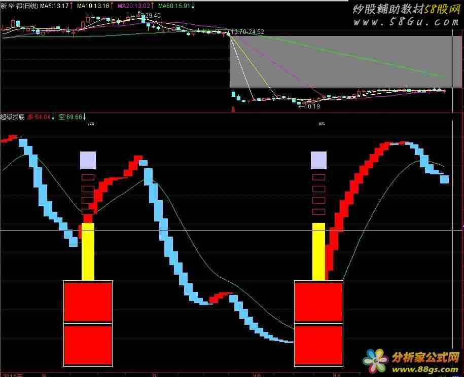 VAR2:=(CLOSE-LLV(LOW,20))/(HHV(HIGH,20)-LLV(LOW,20))*100; VAR3:=SMA(SMA(VAR2,3,1),3,1)/28.57; VAR4:=EMA(VAR3,5); VAR5:=3*VAR3-2*VAR4; AA:=CROSS(VAR5,VAR3) AND VAR3<2.1 AND C>O; VAR6:=(2*CLOSE+HIGH+LOW)/4; VAR7:=LLV(LOW,13); VAR8:=HHV(HIGH,13); VAR9:=EMA((VAR6-VAR7)/(VAR8-VAR7)*100,13); VARA:=EMA(0.667*REF(VAR9,1)+0.333*VAR9,2); 多:VAR9,COLORRED,POINTDOT; 空:EMA(0.382*REF(VAR9,2)+0.618*VAR9,12),COLORGREEN; STICKLINE(VAR9>VARA,VAR9,VARA,6,0),COLORRED; STICKLINE(VAR9<=VARA,VAR9,VARA,6,0),COLORFFCC66; STICKLINE(AA,0,30,40,1),COLORYELLOW; STICKLINE(AA,16,29,38,0),COLORRED; STICKLINE(AA,1,14,38,0),COLORRED; STICKLINE(AA,15,15,40,1),COLORYELLOW; STICKLINE(AA,30,50,10,0),COLORYELLOW; STICKLINE(AA,53,55,10,1),COLORRED; STICKLINE(AA,57,59,10,1),COLORRED; STICKLINE(AA,61,63,10,1),COLORRED; STICKLINE(AA,65,67,10,1),COLORRED; STICKLINE(AA,69,75,12,0),COLORFFCCCC; DRAWTEXT(AA,85,'底'),COLORYELLOW;   |