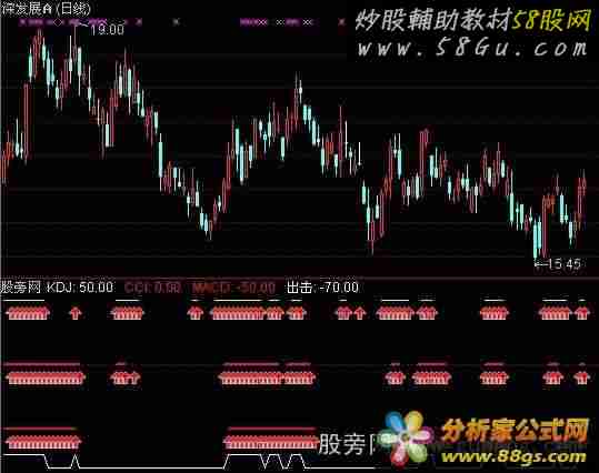 KDJ:IF(J>D,50,DRAWNULL),COLORYELLOW,LINETHICK2; DRAWICON(J>D,40,1); CCI:IF(CCI1>0,0,DRAWNULL),COLORLIMAGENTA,LINETHICK2; DRAWICON(CCI1>0,-10,1); MACD:IF(DIF>DEA,-50,DRAWNULL),COLORRED,LINETHICK2; DRAWICON(DIF>DEA,-60,1); TJ:=KDJ AND CCI AND MACD; 出击:IF(TJ,-80,-70),COLORWHITE; |